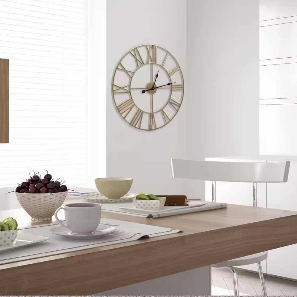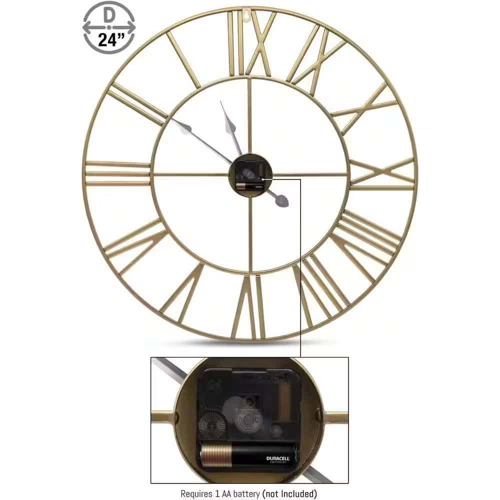 - Design: Round 24-inch decorative wall clock with a hollowed-out design and no glass lens.