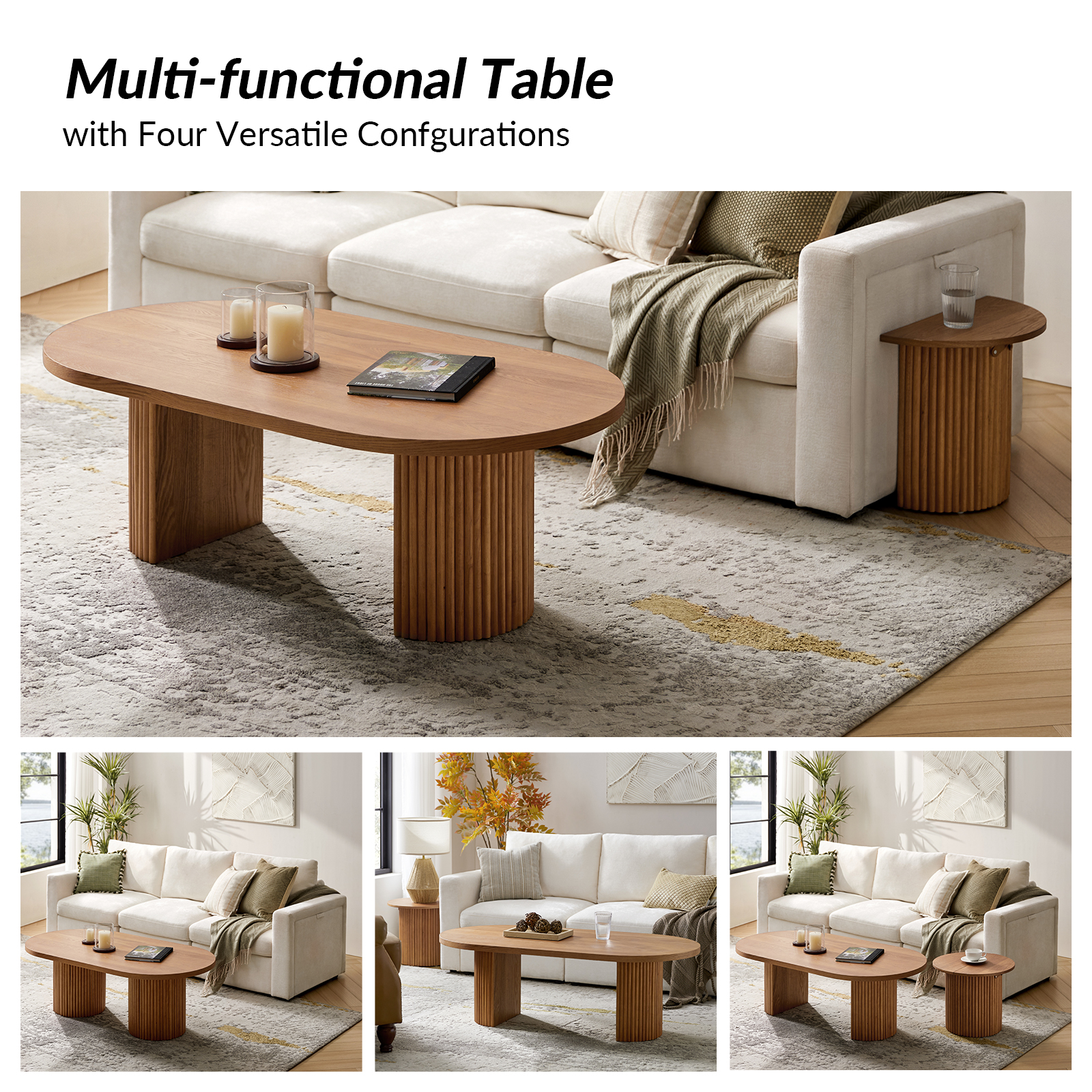 This modern coffee table is a stylish and functional centerpiece for any living room. Featuring a solid wood base, this table adds texture and a touch of craftsmanship to your space. The round legs have a unique twist: the inner semi-circular pieces can be detached and reassembled into a small side table, providing extra flexibility. Adjustable feet ensure stability, while elegant brass leather handles enhance its refined look.