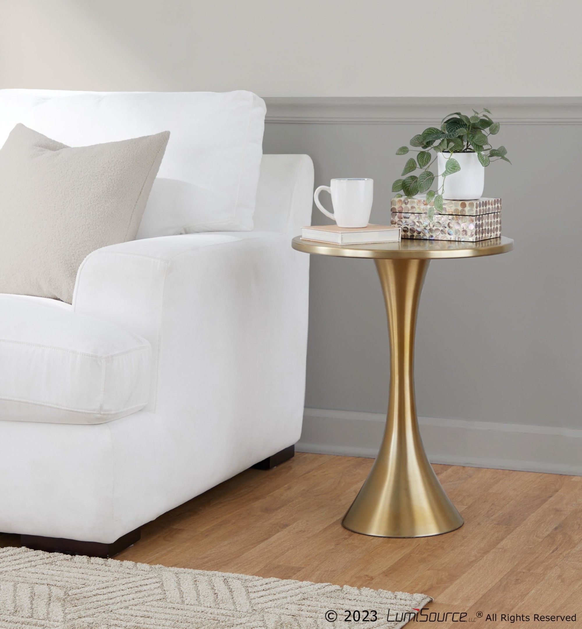 The Lenuxe Accent Table perfectly balances modern flair and minimalism with its clean lines and gracious curves. This end table features a bold round base that curves into an hourglass silhouette, topped with a matching circular tabletop. It’s the ideal accent piece for those seeking modern design with a touch of seamless perfection. Enjoy its sturdy construction and striking gold finish, perfect as an accent or end table in any room.