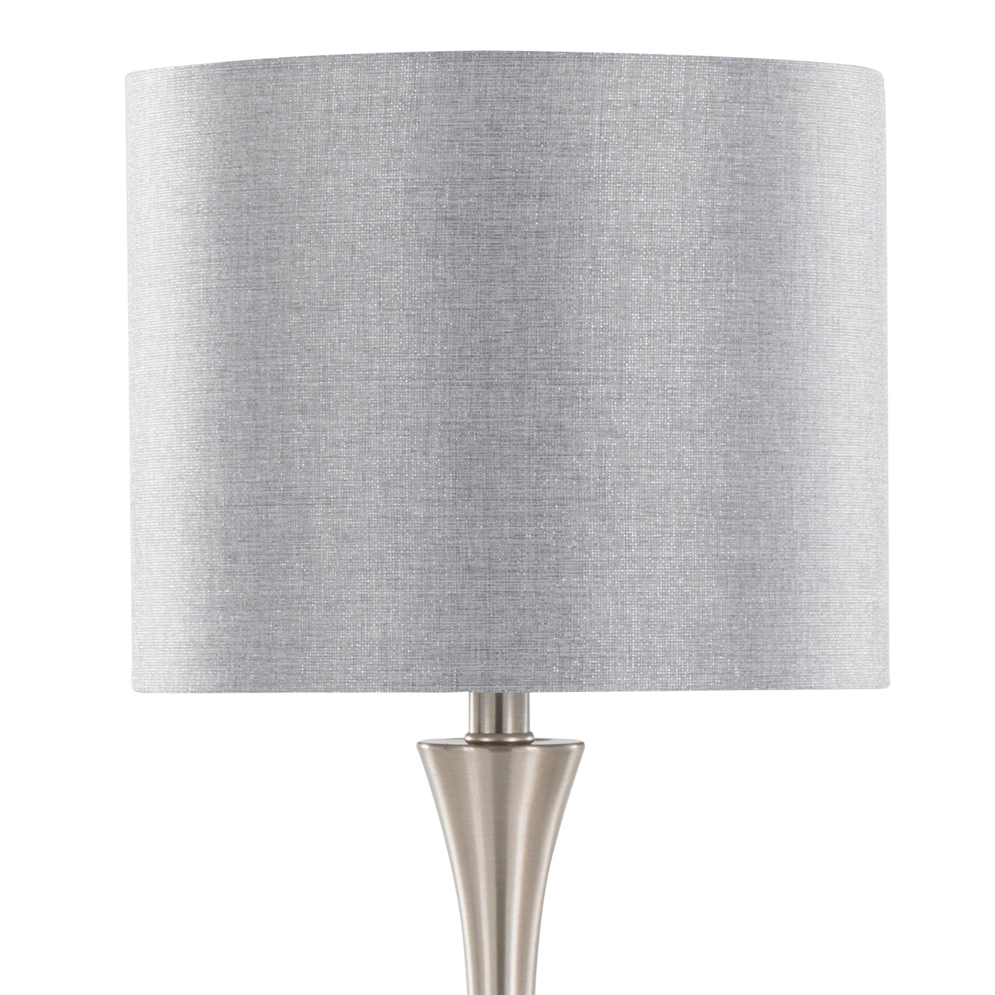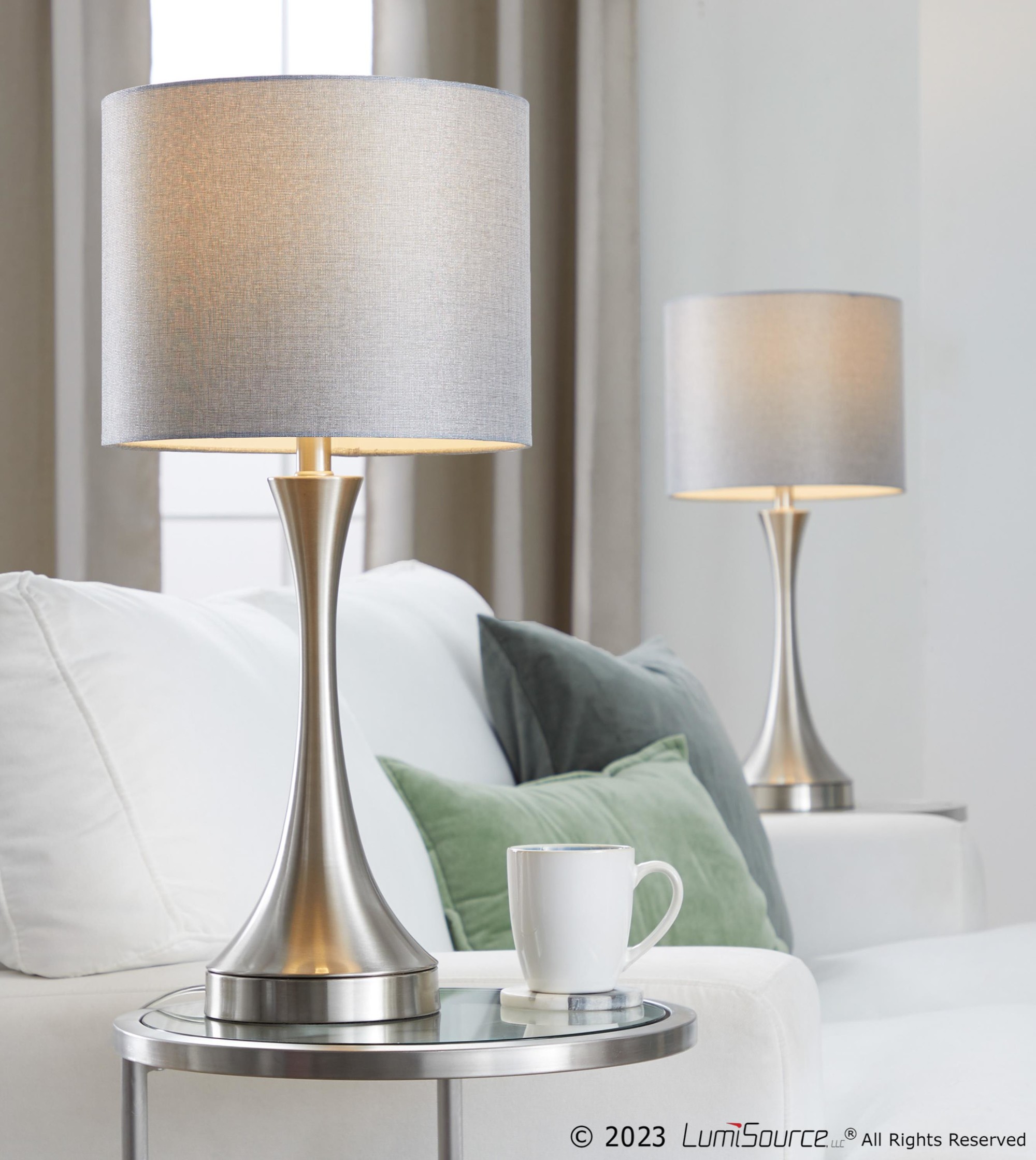 The “Lenuxe 25” Brushed Nickel Contemporary USB Table Lamps add sleek, modern style to any space. This set of two table lamps features a beautiful round base with a built-in USB port for convenient charging. The hourglass body and drum shade create a versatile and stylish lighting solution.