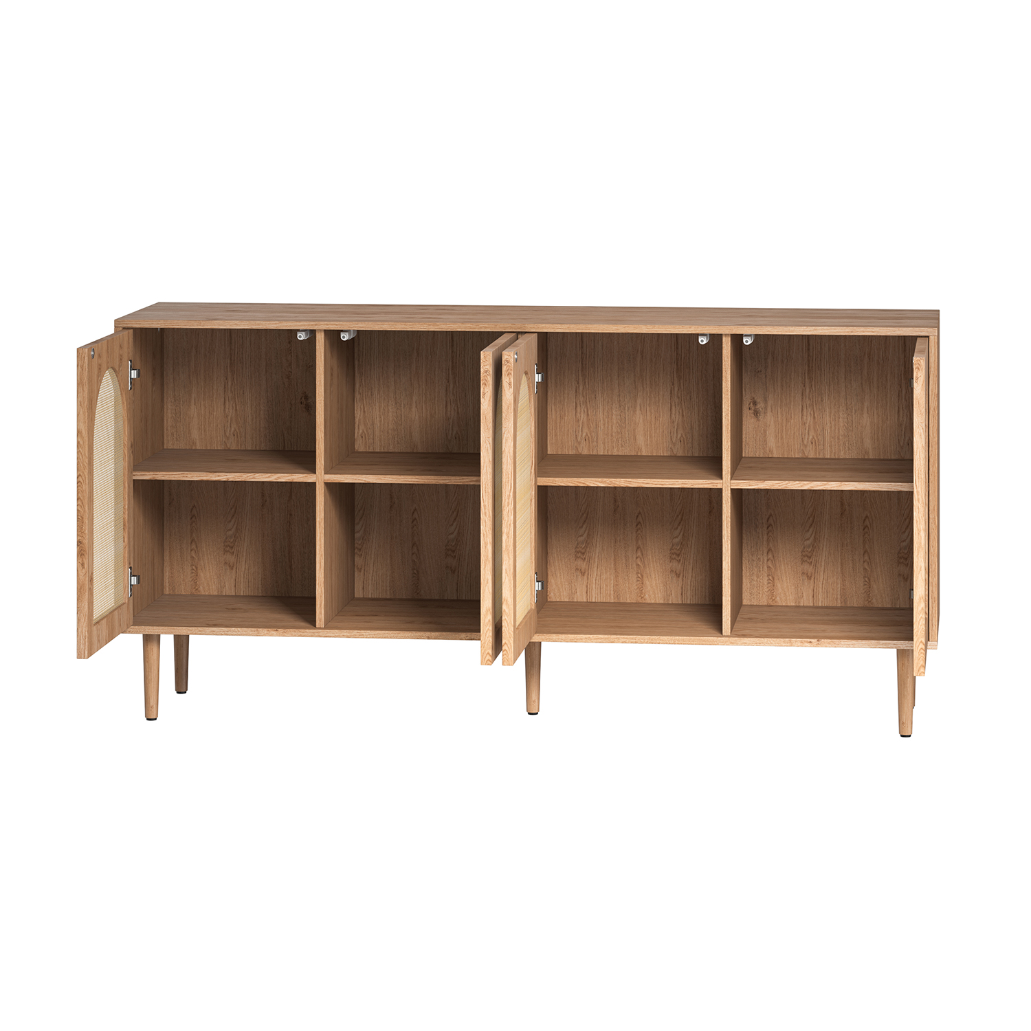 This modern storage sideboard features distinctive rattan texture details on the doors, making it a stylish and versatile addition to any room. Perfect for the entry, kitchen, dining area, or living room, it provides ample space for organizing plates, trays, kitchen items, books, and more. The push-to-open mechanism offers simplified access, while the open storage shelves and internal compartments maximize organization. Its sturdy metal legs ensure stability and easy floor cleaning.