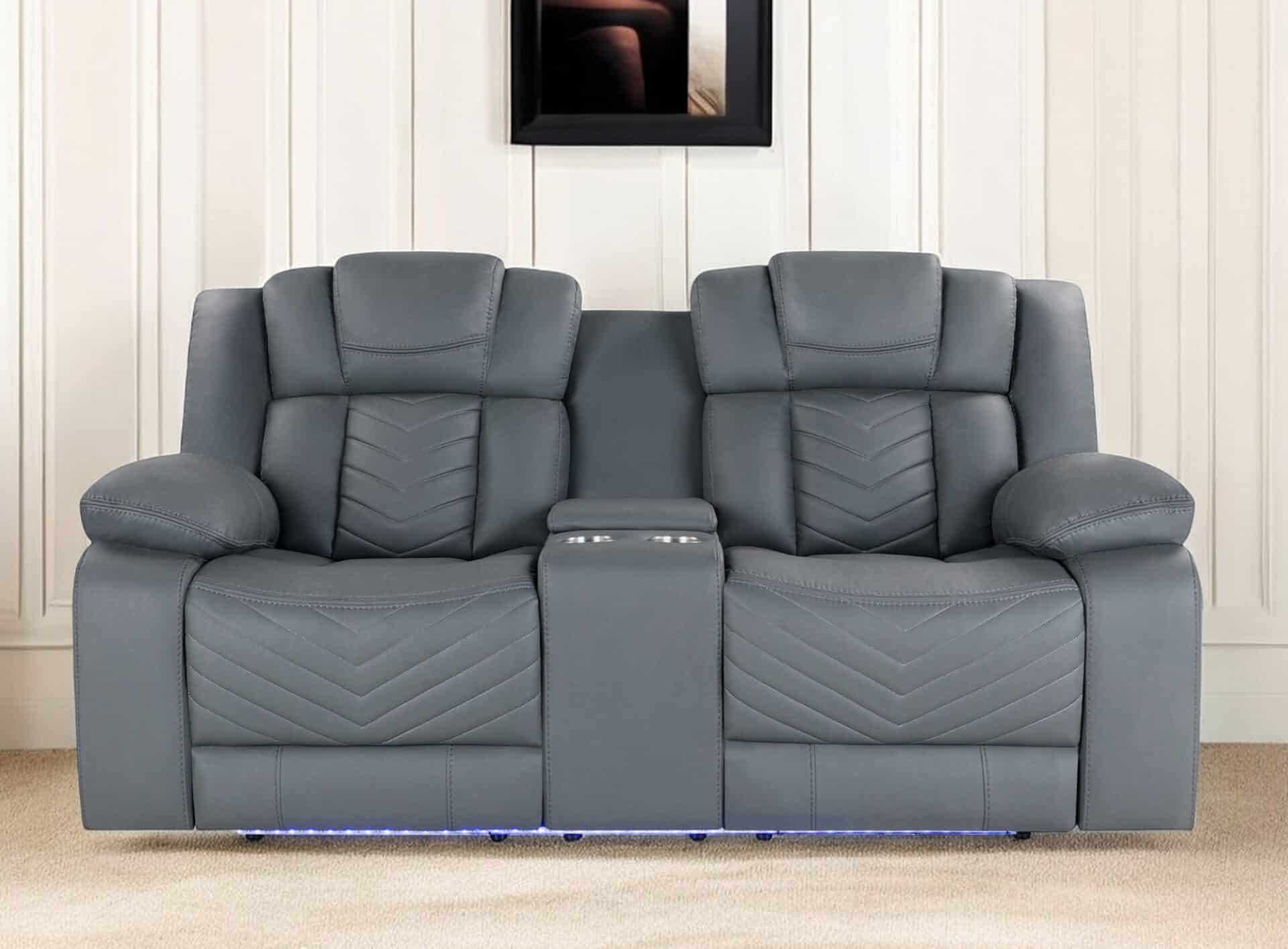 The Light Gray Faux Leather Power Reclining Loveseat With Storage combines style, comfort, and functionality, making it a must-have for your living space or man cave. Upholstered in durable and resilient light gray faux leather with a channel-tufted design, this loveseat offers the look and feel of genuine leather. It includes a convenient center console with cup holders, a concealed storage compartment, and a built-in LED light-up strip for added ambiance. With power reclining functionality and pillow-top arms, this loveseat ensures optimal comfort and support, making it an excellent choice for relaxation and entertainment.