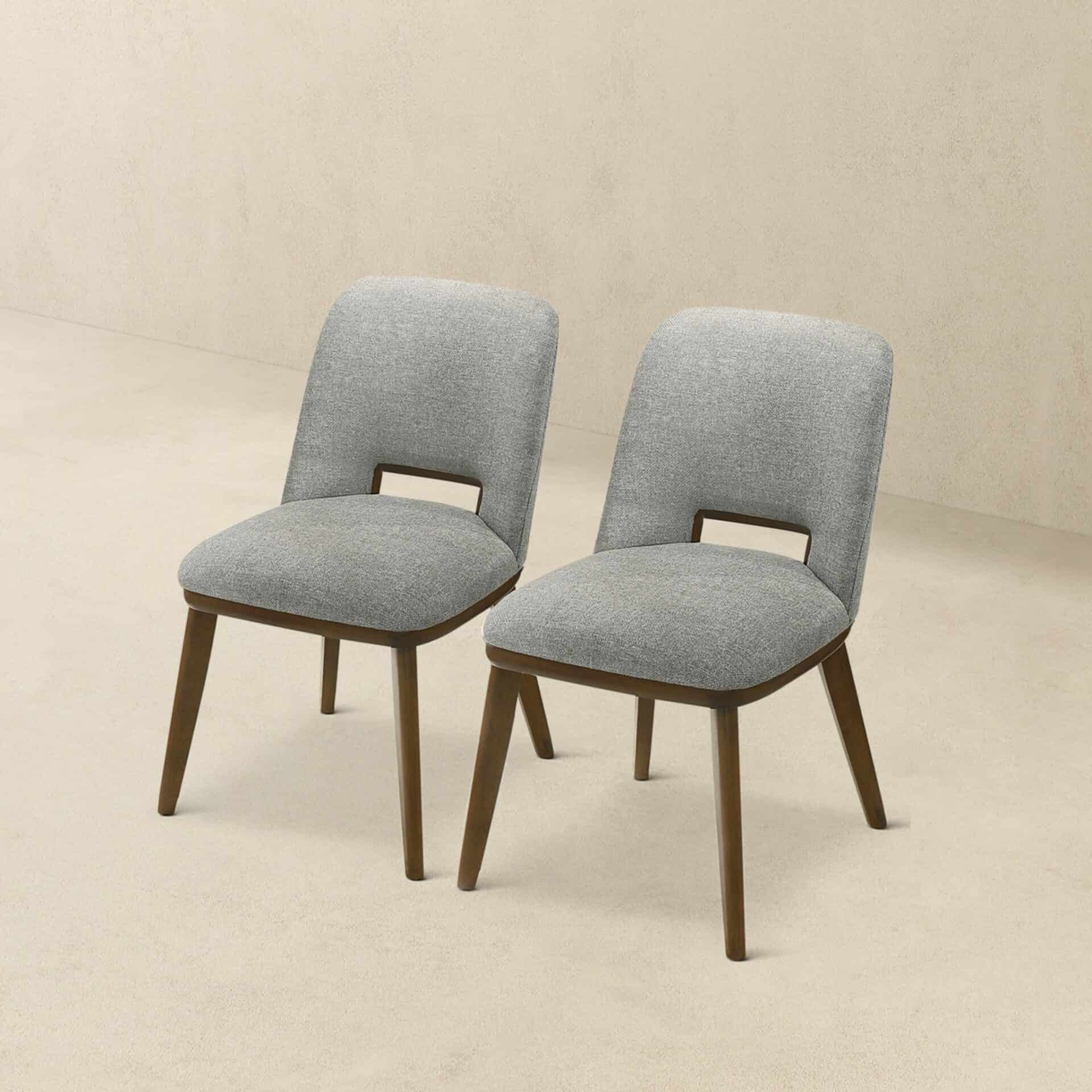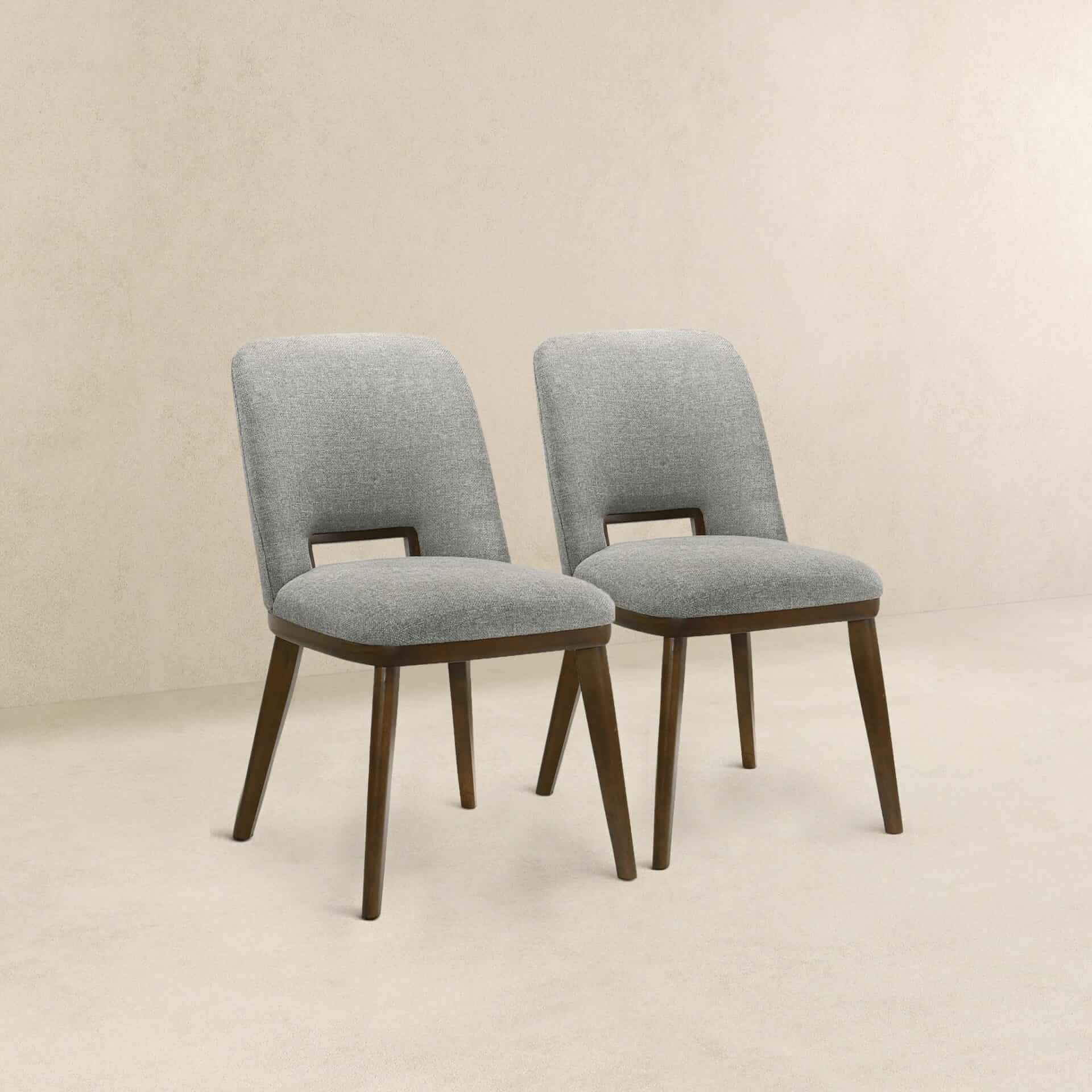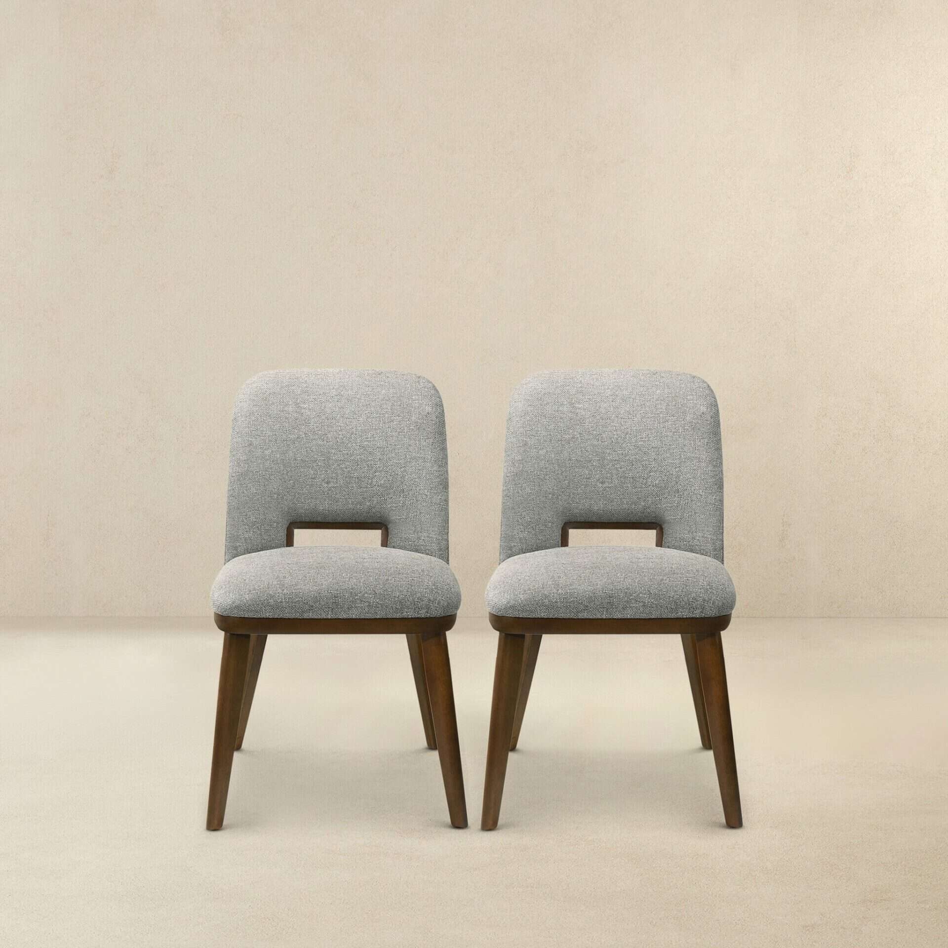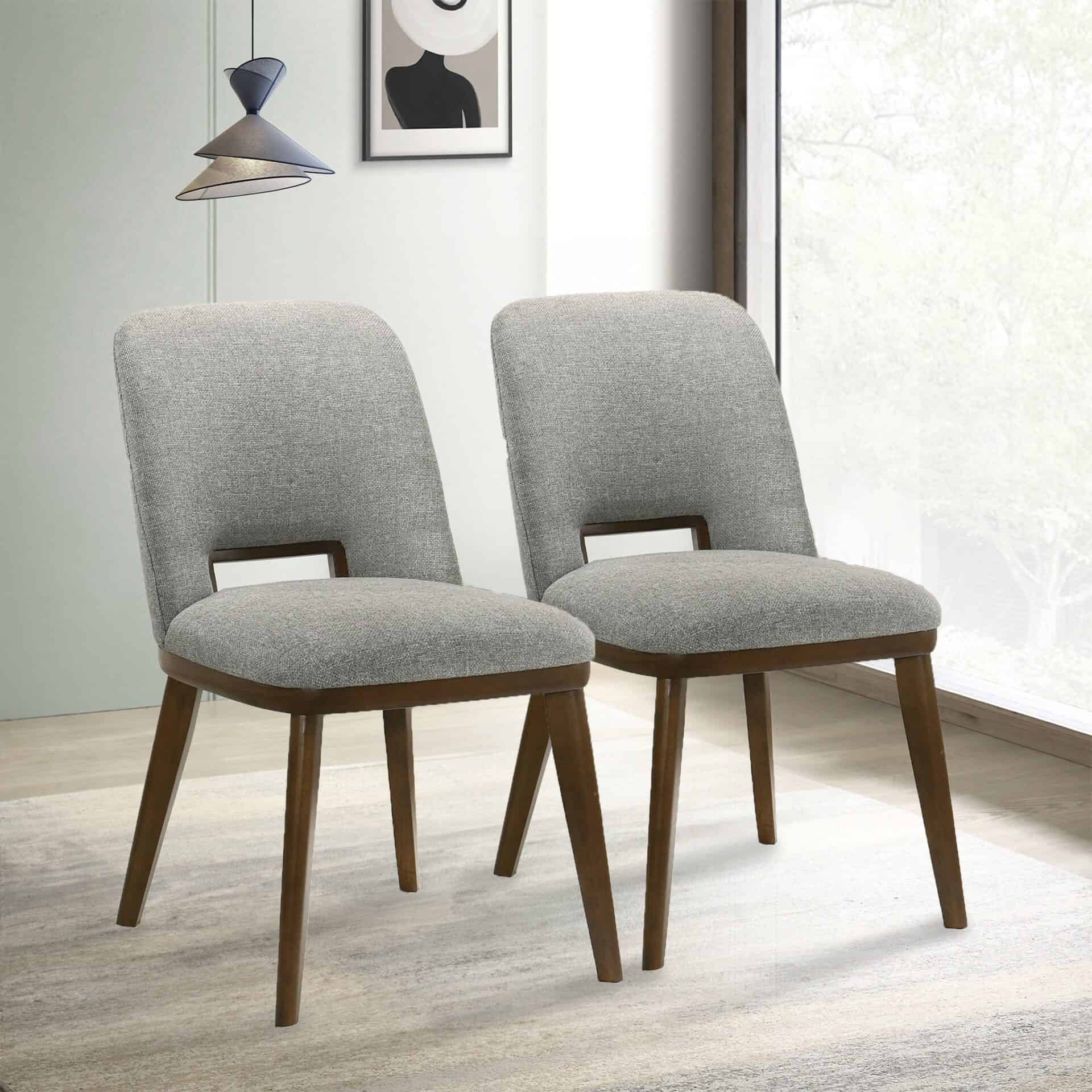 Introducing the Light Grey Fabric Upholstered Dining Chairs with Wood Base (Set of 2) – a perfect combination of comfort, style, and functionality for your dining or living spaces. Featuring a solid wood base with a walnut finish, these chairs add a touch of mid-century modern charm to any room. The light grey fabric upholstery offers a sophisticated and cozy seating experience, while the foam-padded seat and back ensure lasting comfort.