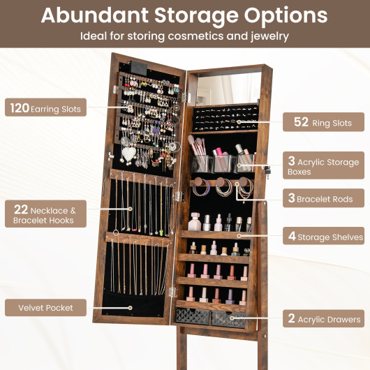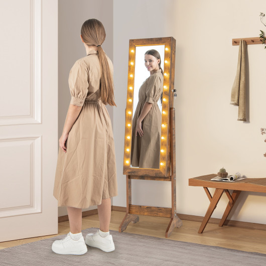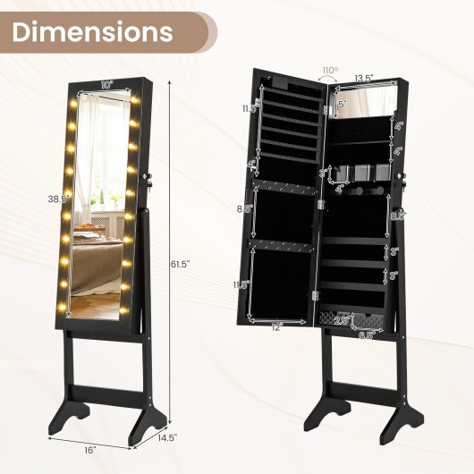 The Lighted Full Length Mirror Jewelry Cabinet with Adjustable Tilt Angles combines functionality and elegance, offering a chic storage solution for your jewelry and accessories. Featuring a full-length mirror with 20 bright lights, this cabinet allows you to check your outfit while creating a warm and romantic atmosphere. With abundant storage options and adjustable tilt angles, this jewelry organizer is designed to meet diverse needs and enhance convenience. Its sturdy design and modern appearance make it a perfect addition to your living space.