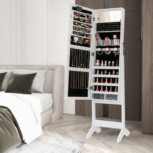 The jewelry cabinet includes a built-in makeup mirror and a lockable door for added privacy and security. The soft velvet lining ensures your valuables are well-protected, while its stable triangular base provides excellent support. Designed for practicality and style, this mirror cabinet is an excellent choice for anyone looking to organize their jewelry and elevate their space.