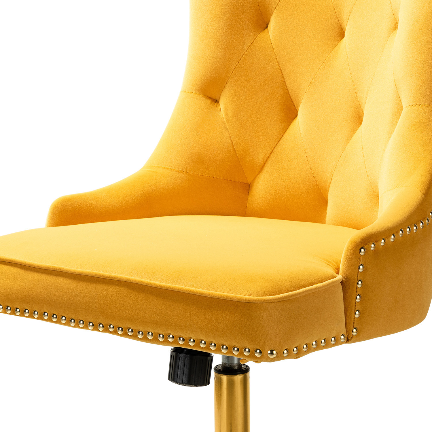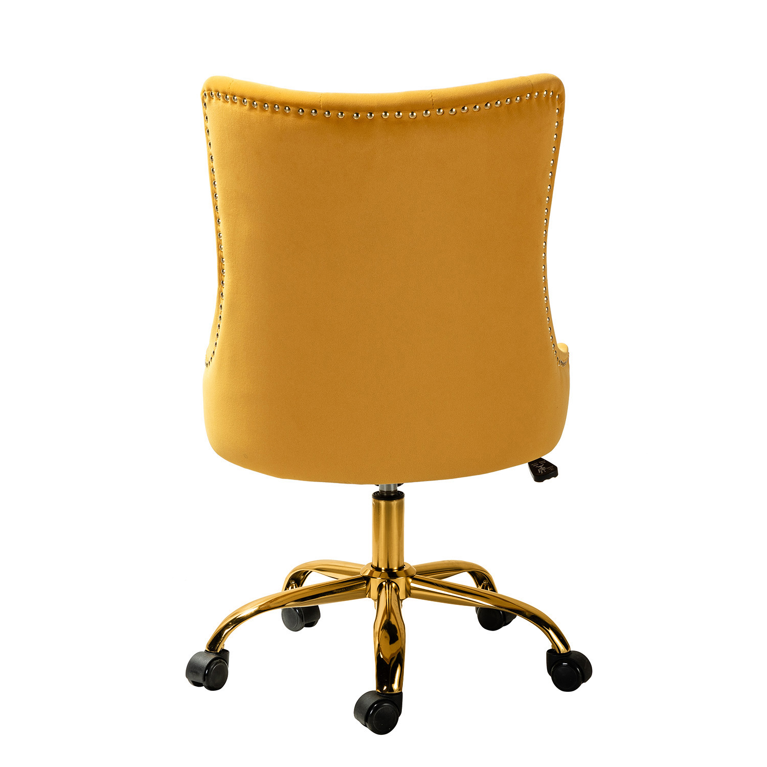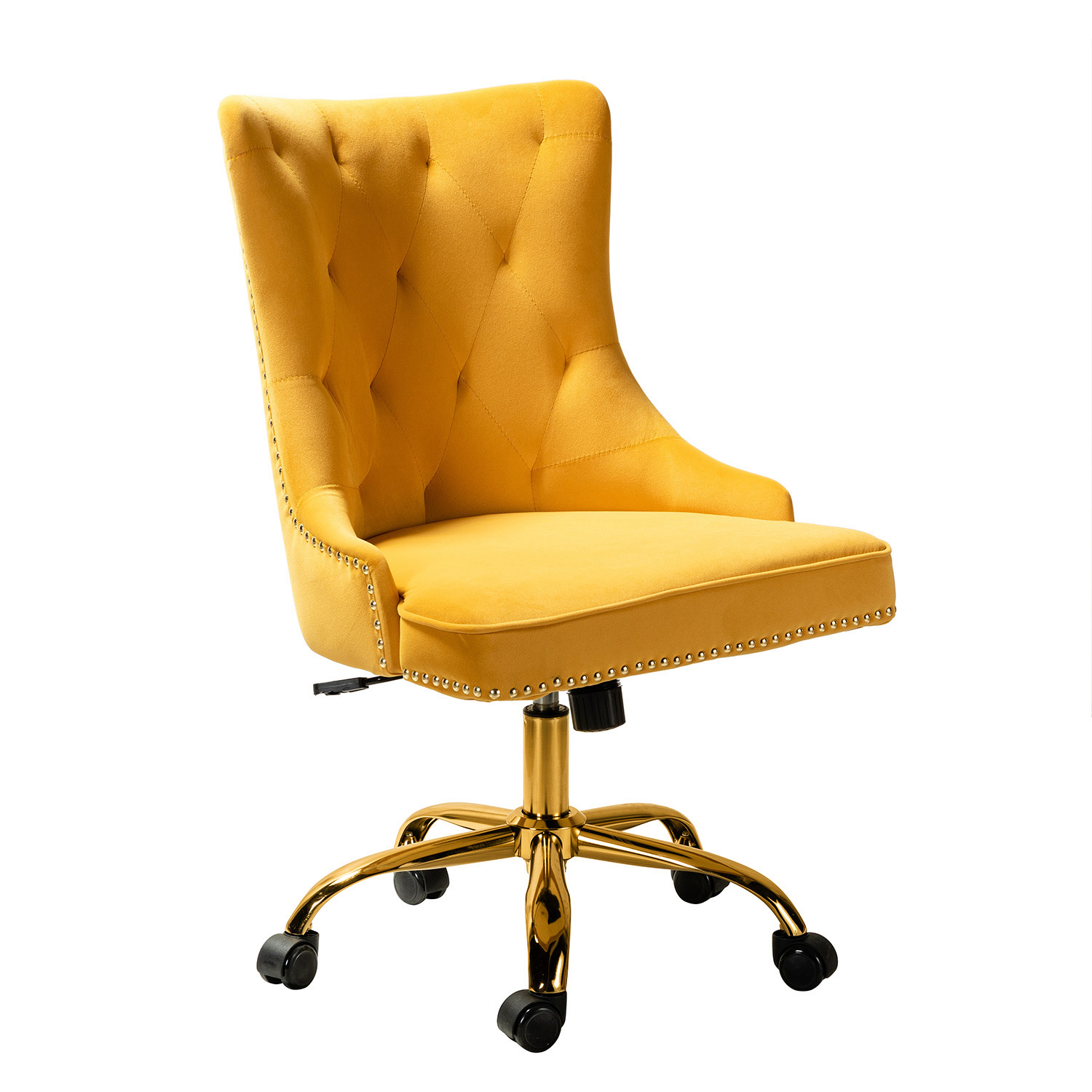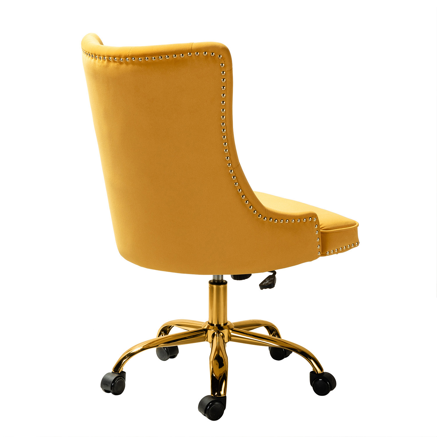 This modern swivel task chair adds a touch of contemporary elegance to any office or home office. The vibrant velvet fabric upholstery blends seamlessly with any design taste. Enjoy exceptional comfort with its armless, wide seat, making it the most comfortable chair in your home or office. Designed in a chic style, the chair features luxury modest nailhead trim, tufting, and piped edges, lending a tailored touch. Foam fill offers superior comfort and support. The chair’s base includes a swivel mechanism, tilt angle adjustment, and a lever-operated lift for adjusting the seat height and angle.