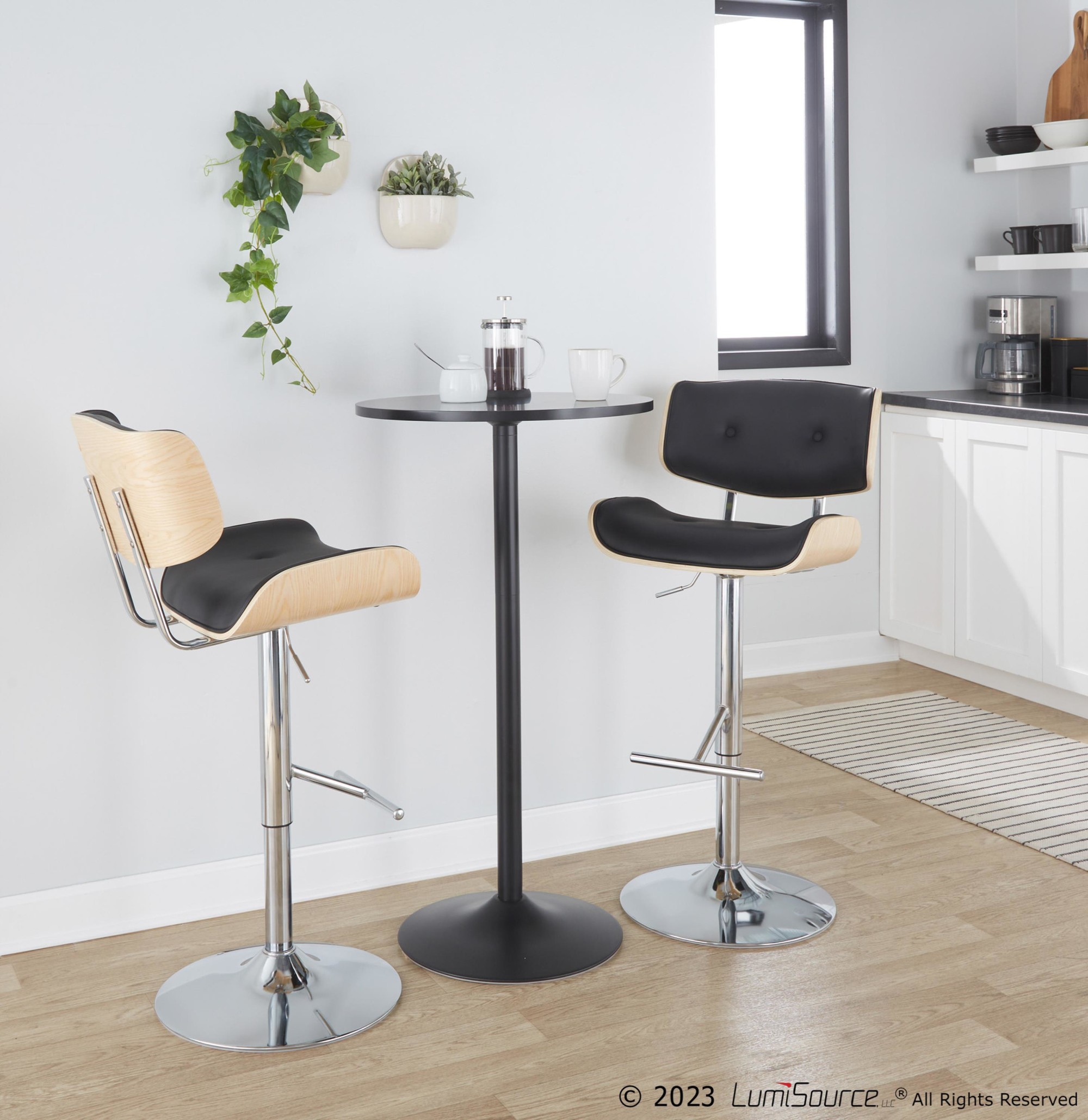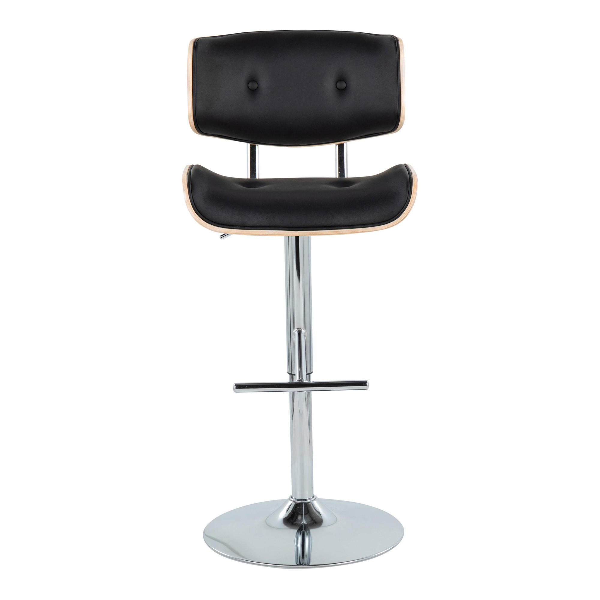 The Lombardi Adjustable Barstool adds mid-century flair to any bar or counter area. Enjoy the comfort and support of plush, tufted faux leather seats and backrests over a bent wood frame. The adjustable height and 360-degree swivel provide customized comfort.