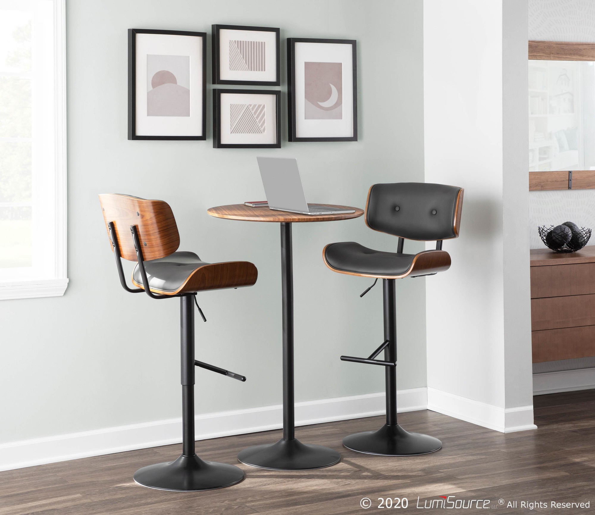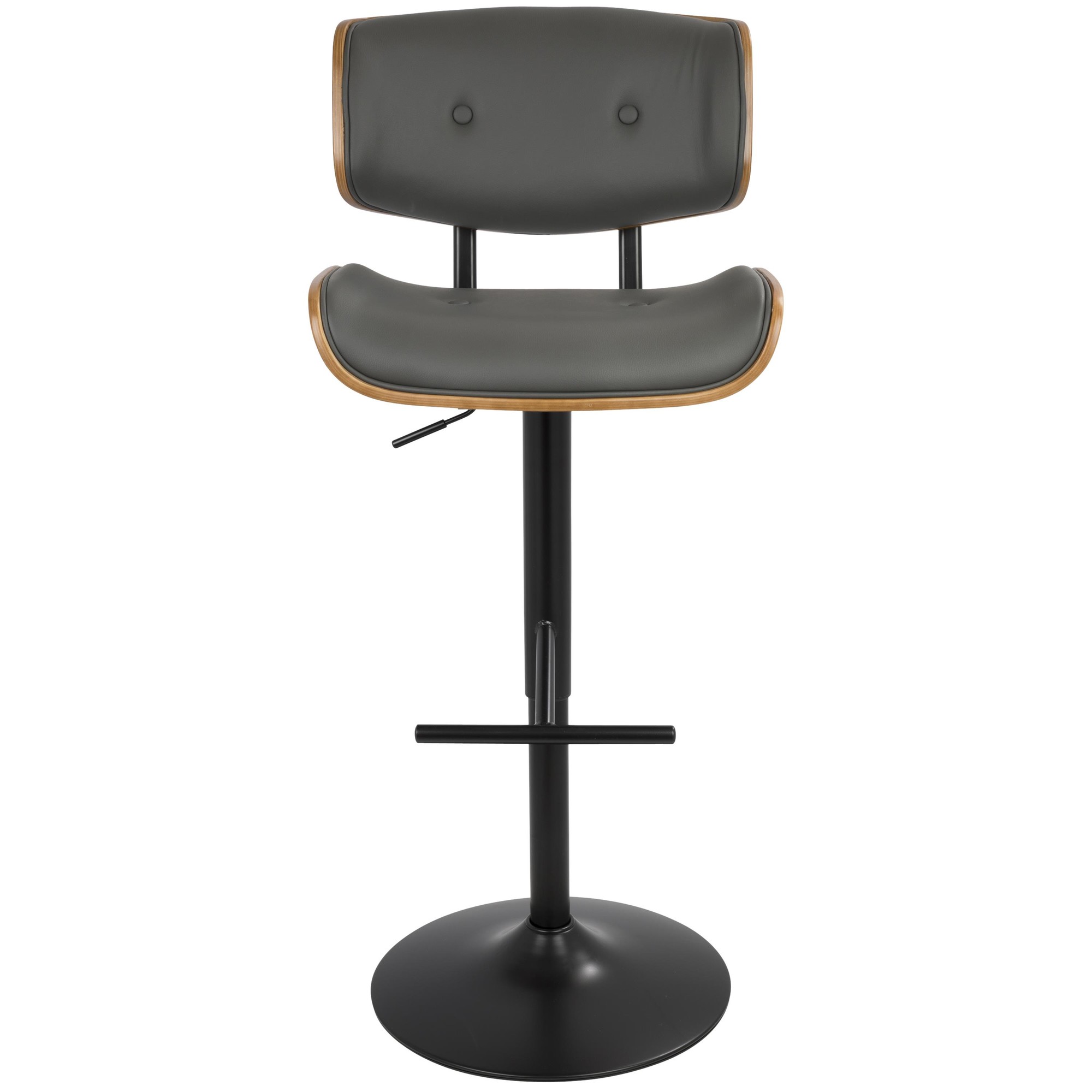 The Lombardi Walnut and Grey Mid-Century Modern Adjustable Barstool is the perfect addition to your bar or counter area! It combines style and comfort, featuring a plush, tufted faux leather seat and backrest, complemented by sleek walnut bent wood accents. Enjoy optimal support and sink into relaxation. This barstool is designed to impress!