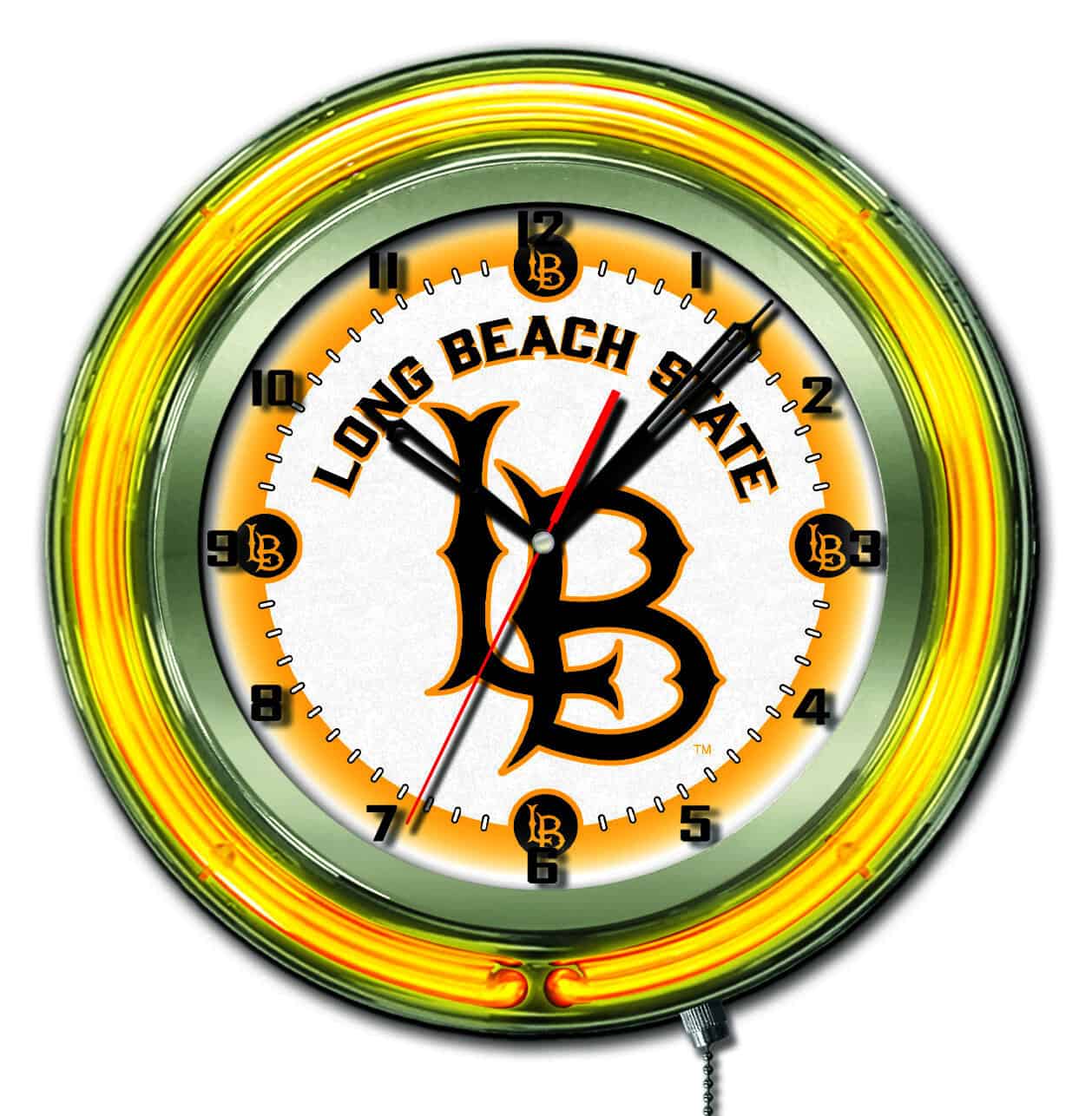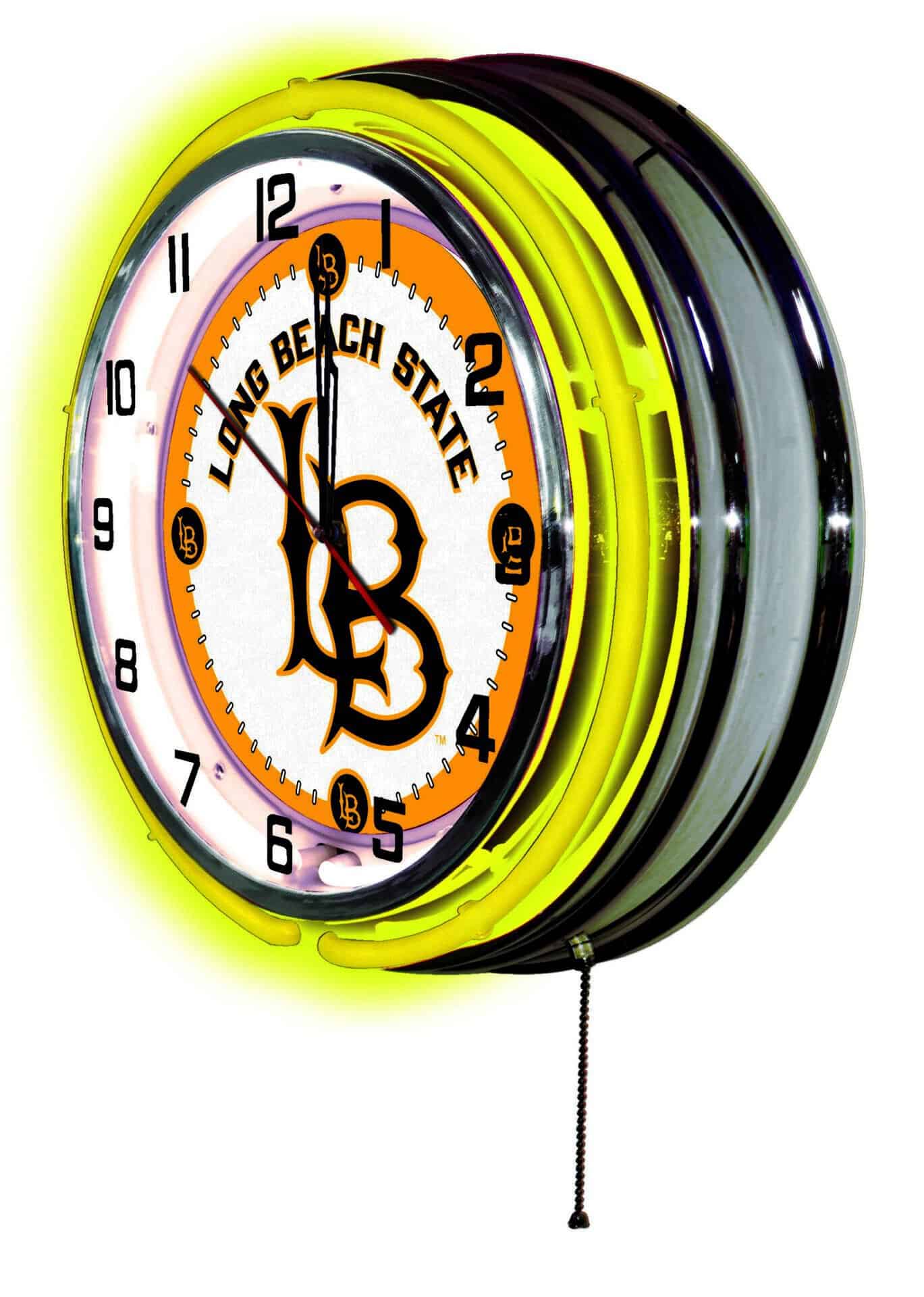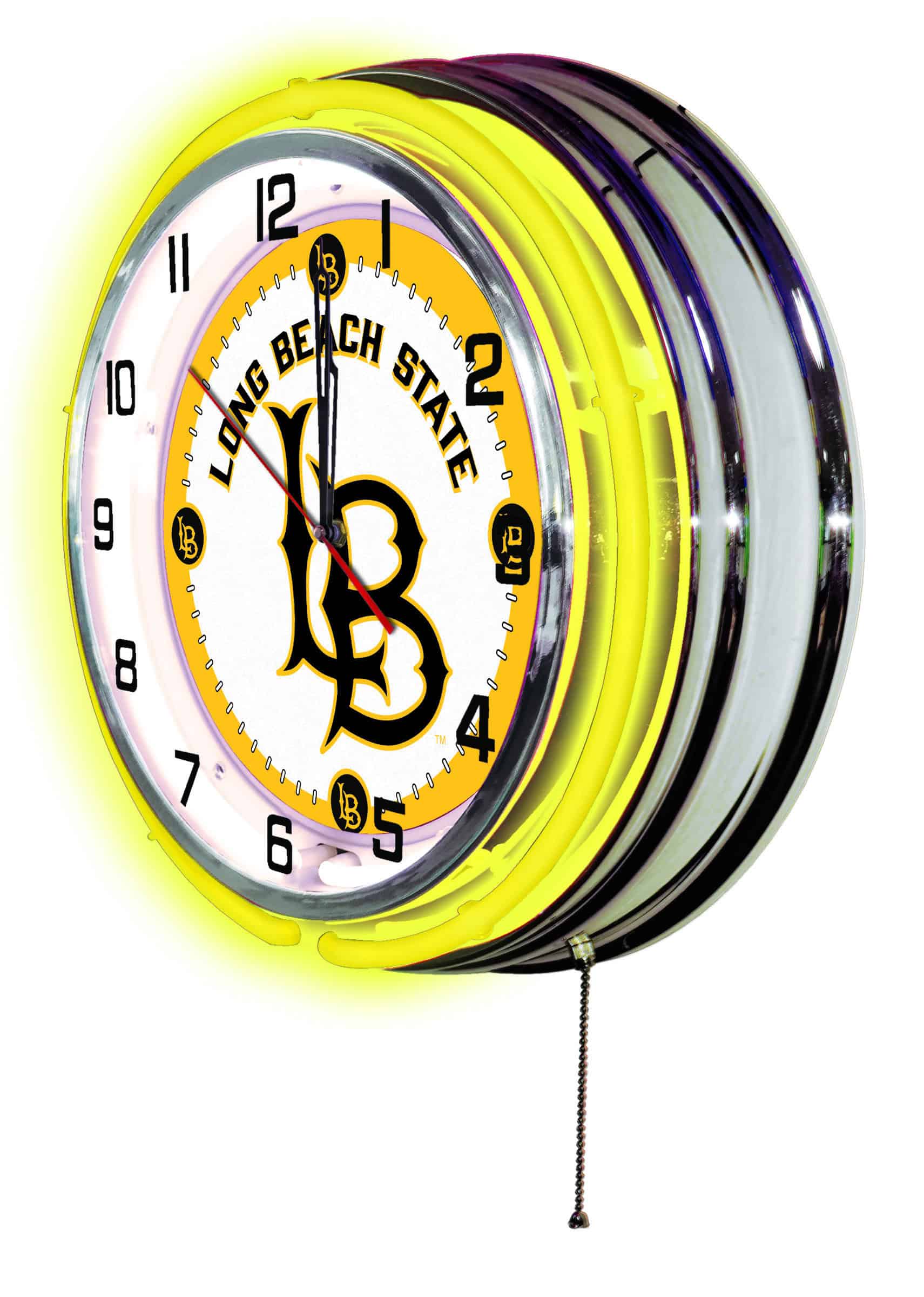 The Long Beach State University 19-Inch Neon Logo Clock in Chrome is an eye-catching addition to any man cave or sports-themed space. This clock features a striking chrome casing and vibrant team-colored neon rings that beautifully illuminate the custom printed clock face. With a brilliant white inner neon ring and an easy pull chain for operation, this clock combines style with functionality. It operates on a standard 120V outlet and ensures accurate timekeeping with its reliable quartz movement, powered by a single AA battery (not included). Perfect as a gift for sports fans or for personal use, this clock is a celebration of school pride.
