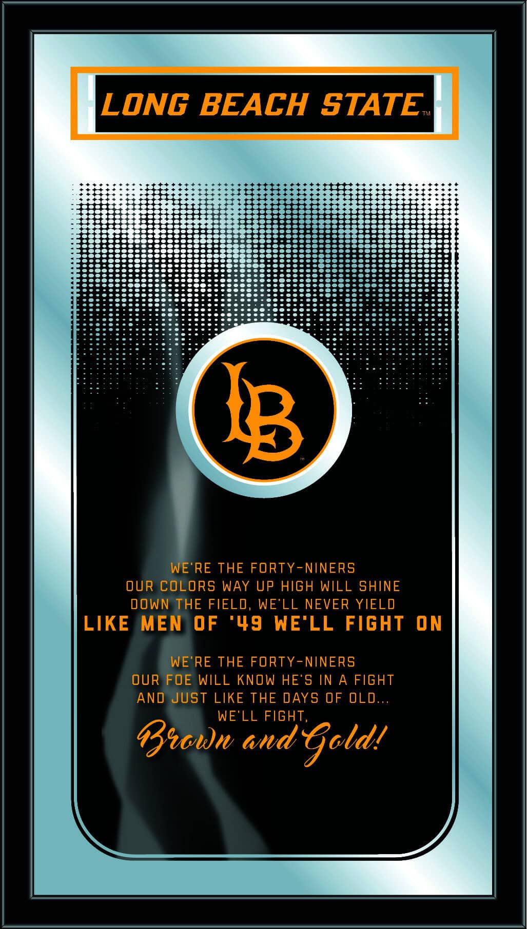The perfect way to show your school pride, our Fight Song Mirror displays your school’s logo and the verses that get them fired up on game day, with a style that fits any setting. With its simple but elegant design, colors burst through the 1/8″ thick glass and are highlighted by the mirrored accents. Framed with a black, 1 1/4 wrapped wood frame with saw tooth hangers, this 26″(H) x 15″(W) mirror is ideal for your office, garage, or any room of the house. Whether purchasing as a gift for a recent grad, sports super fan, or for yourself, you can take satisfaction knowing you’re buying a mirror that is proudly made in the USA.