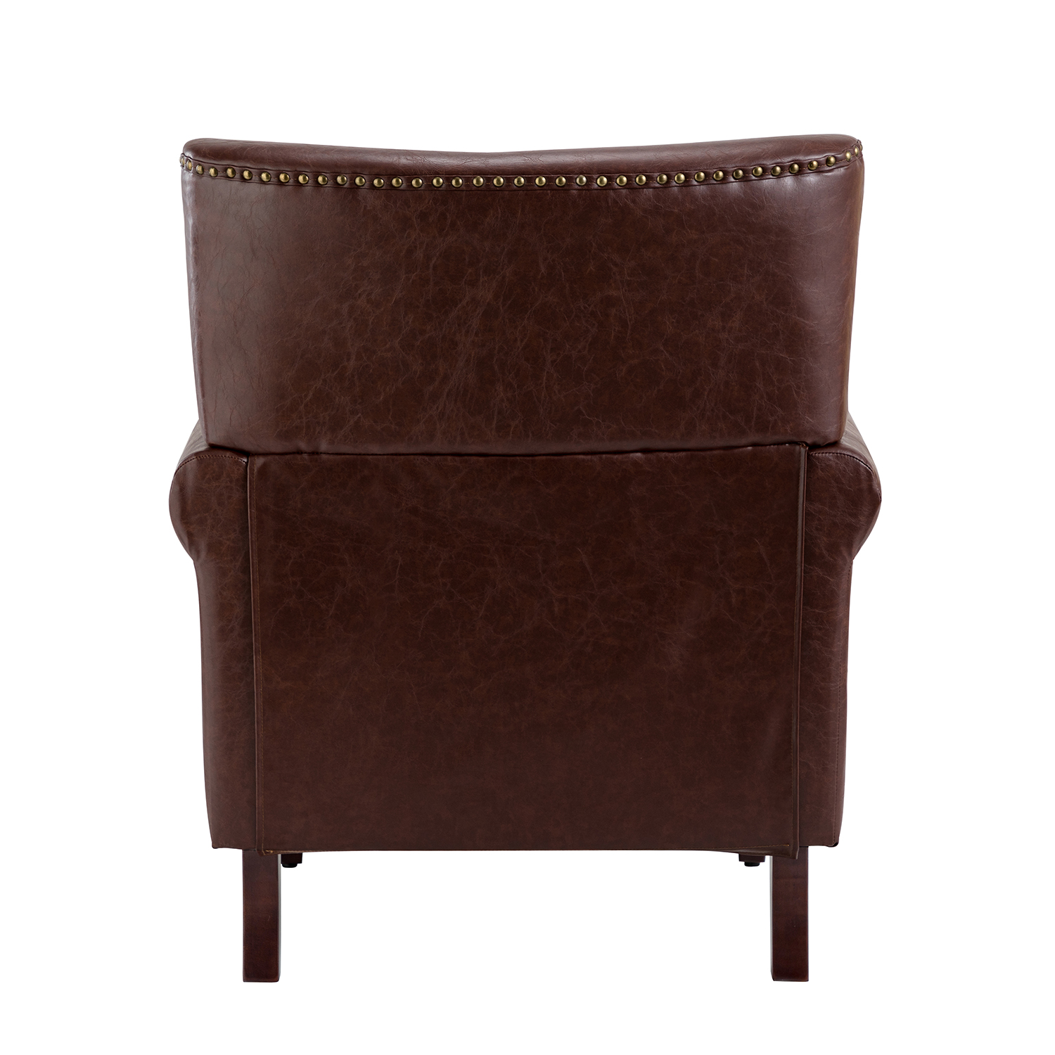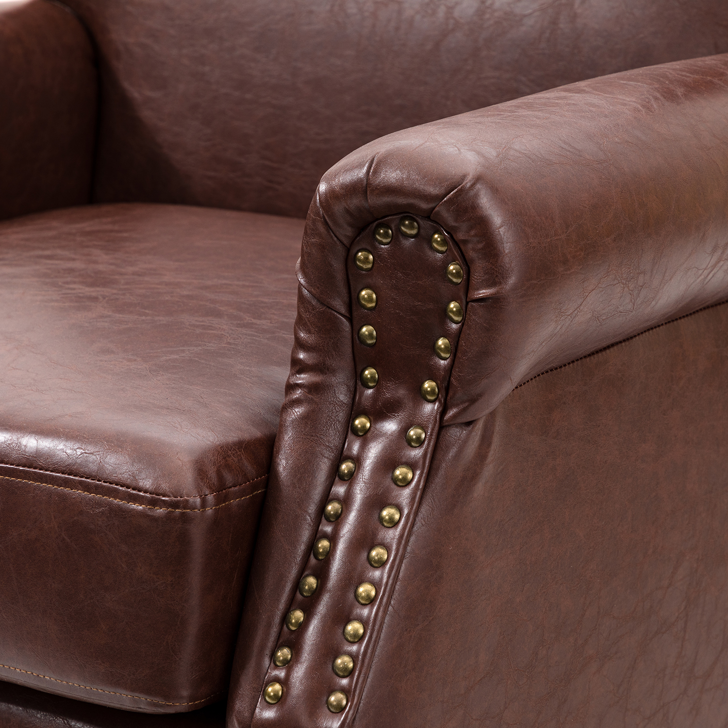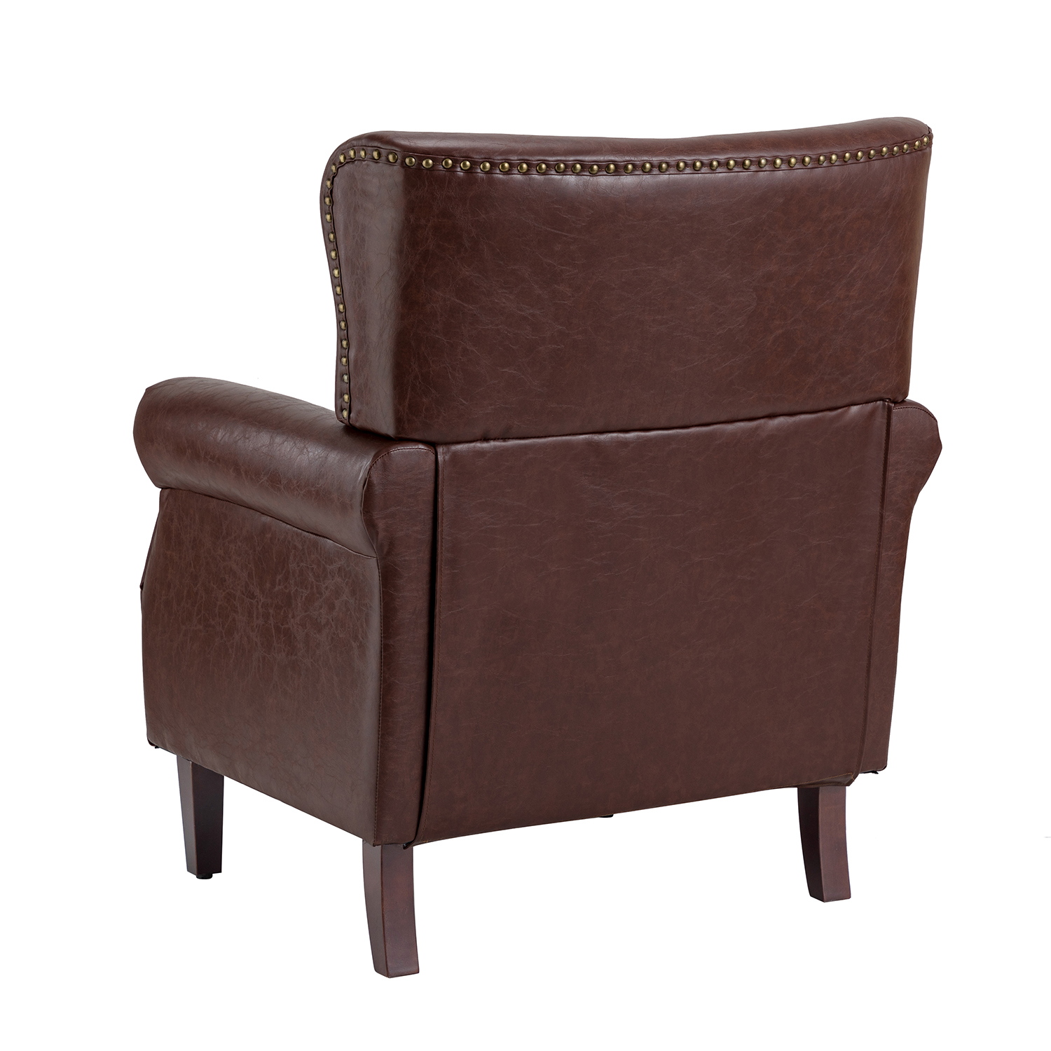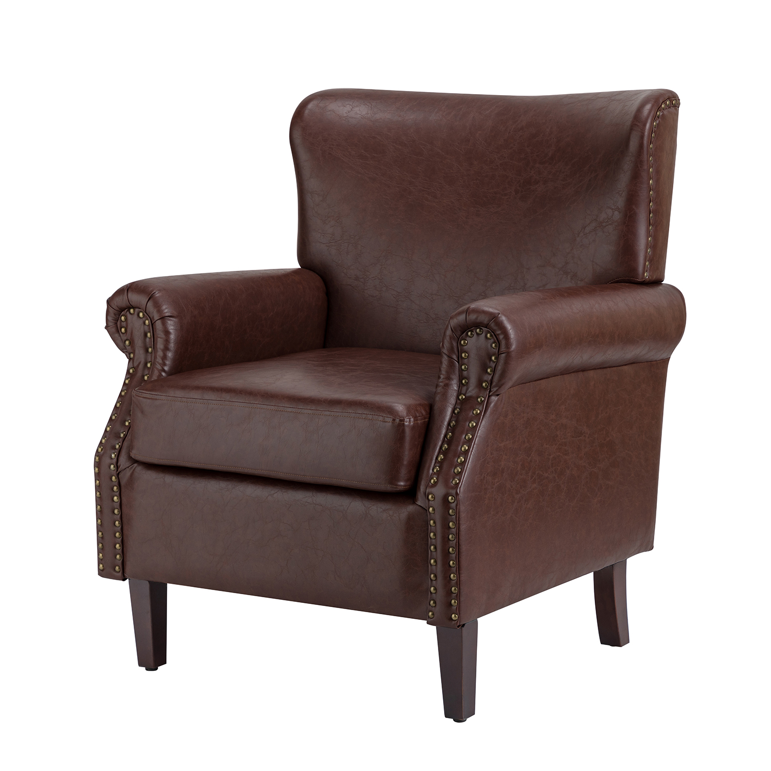 The Lucas Brown Vegan Leather Nailhead Trim Armchair is ready to be your new favorite spot! This classy chair offers top-notch comfort and relaxation, making a statement in any room. The rolled arms and nailhead trim add a refreshing touch of sophistication to your home.