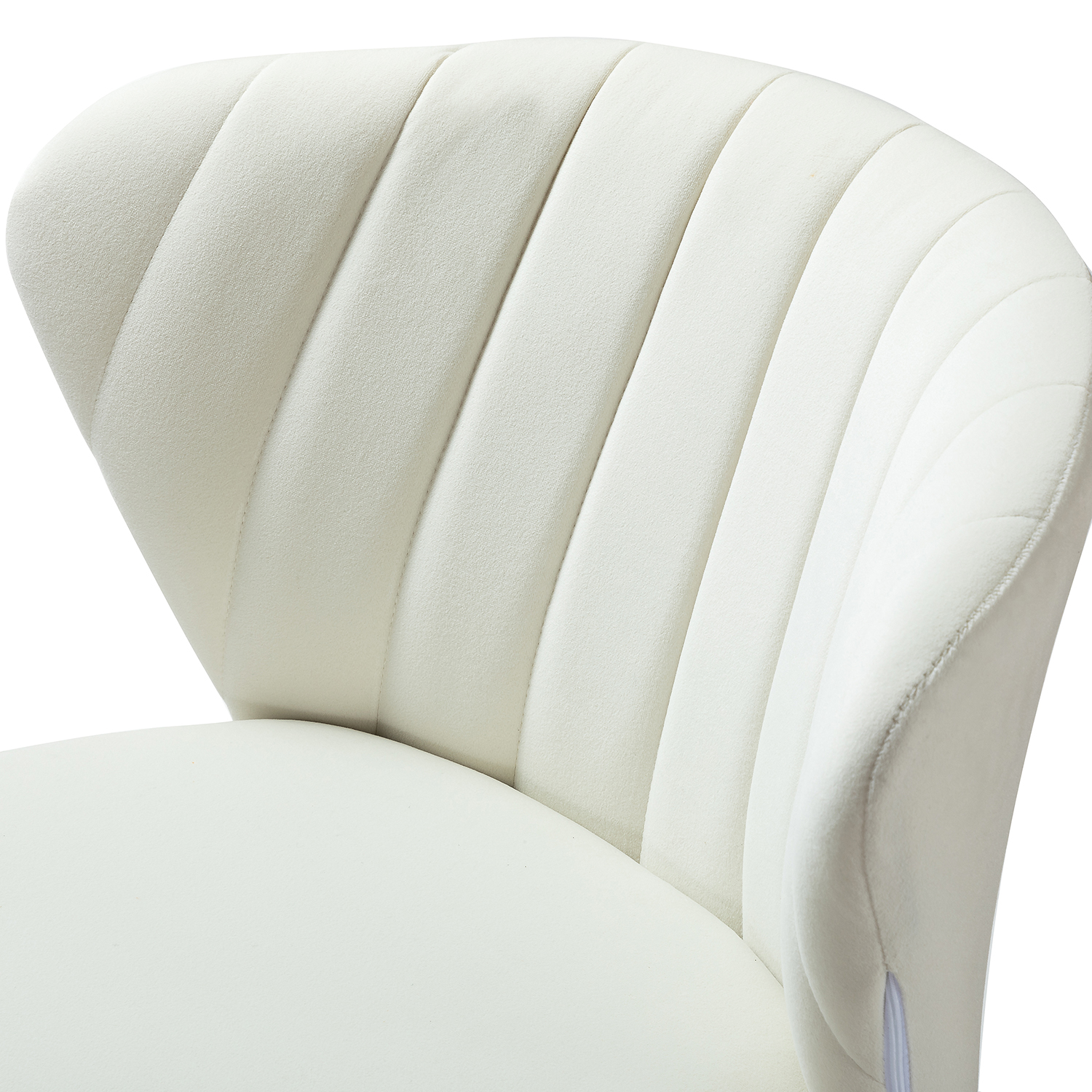 This stylish side chair brings sophisticated lines to your bedroom or living space. The channel-tufted back wraps around a comfortable, foam-filled cushion, creating an inviting and stylish seat. Upholstered in durable velvet, this chair is designed for everyday use and long-lasting fashion. The metal legs add a touch of modern design while enhancing stability and durability. It’s a great choice for decorating your home or as a thoughtful gift.