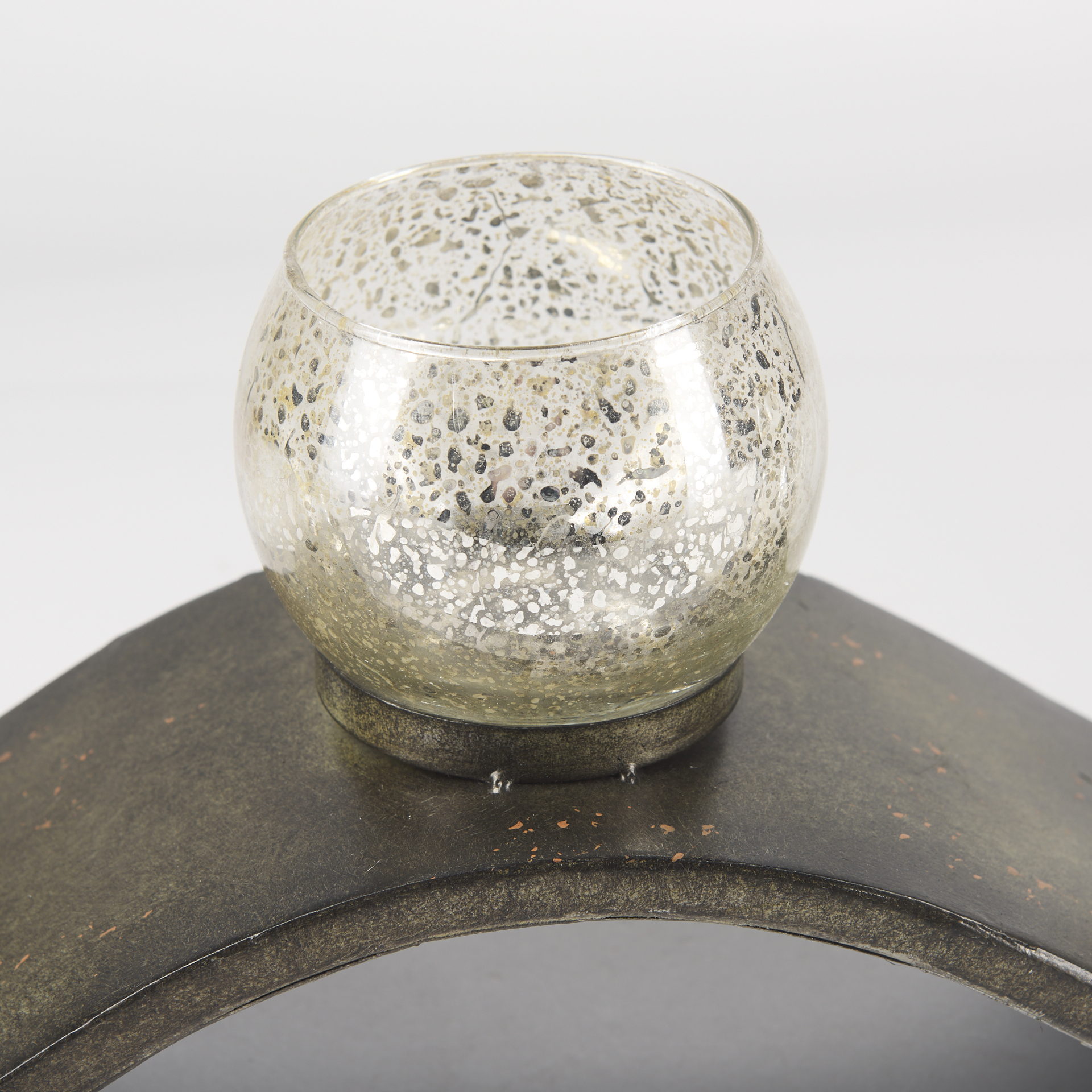 - Material: Metal frame with hurricane glass votives.
