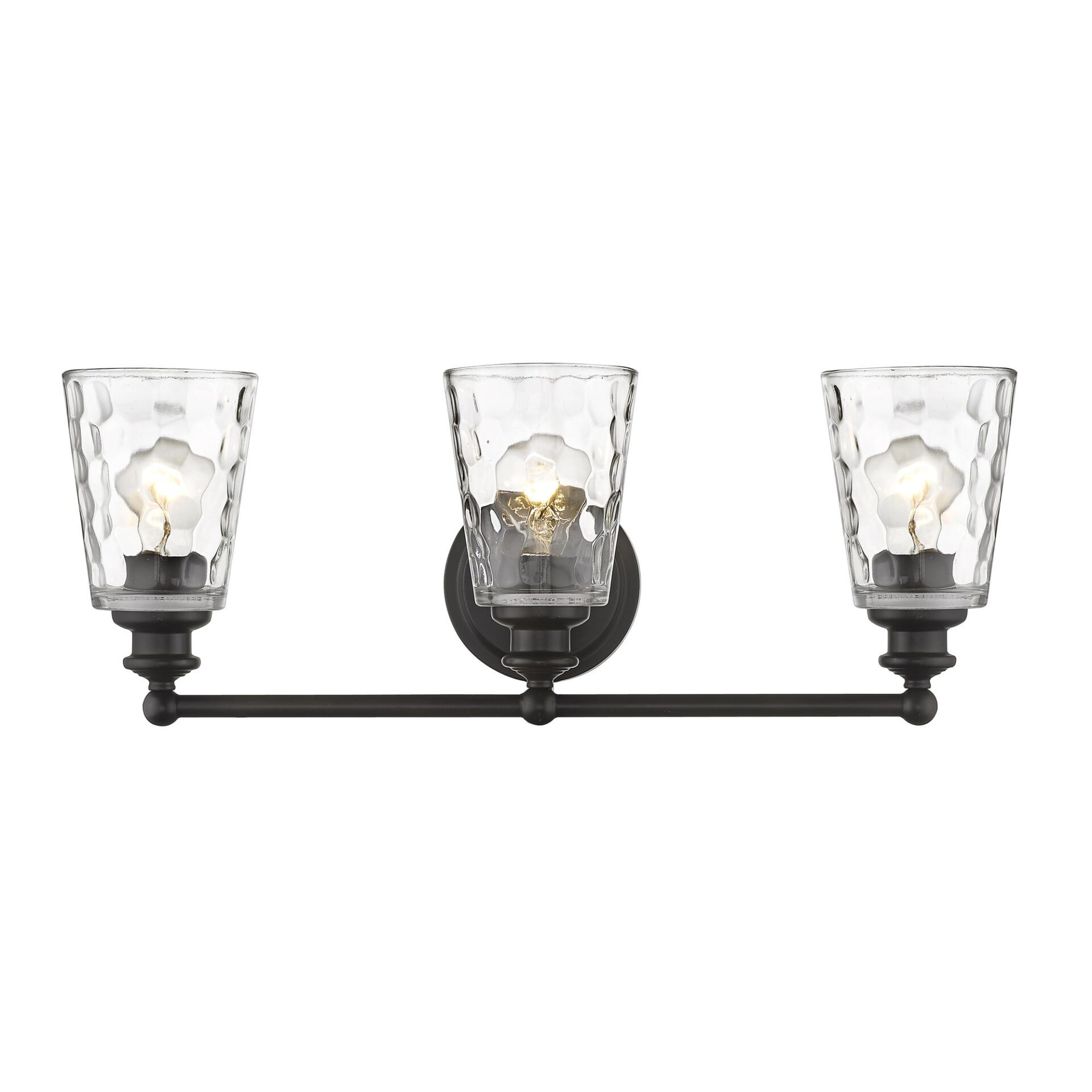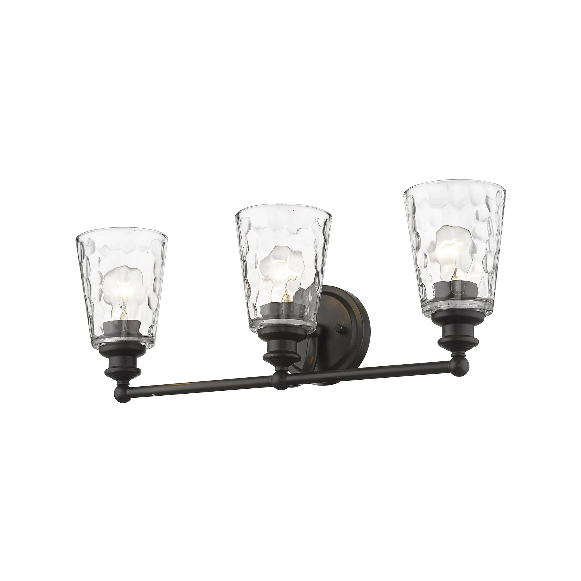The Mae Transitional 3-Light Oil-Rubbed Bronze Vanity Fixture brings a touch of timeless elegance to your bathroom decor. Its modest framework is accentuated by soft, rounded accents, offering a versatile design that complements both classic and modern interiors. The hand-blown clear optic glass shades enhance the ambiance by diffusing light beautifully. This fixture is a perfect blend of style and functionality, available in a stunning oil-rubbed bronze finish, and can be mounted facing up or down to suit your preferences.