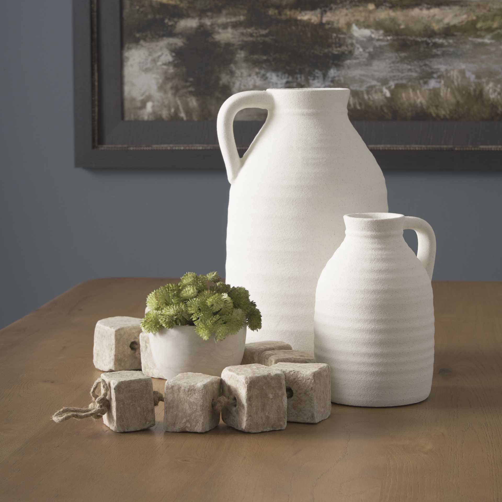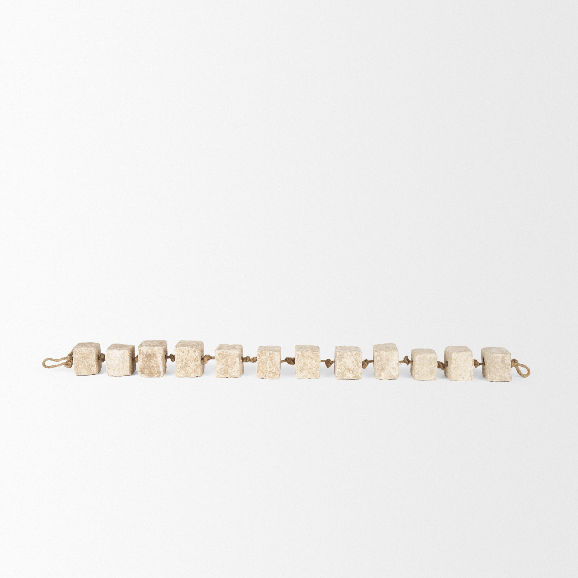 The Mala Beige Paper Mache Cube Garland adds an organic, artistic touch to any space. This unique garland features nine hand-crafted cube blocks in a soft, light beige finish. Perfect for styling on coffee tables, shelves, or in bowls, this versatile piece can be displayed as a strand or looped for a customizable accent. Each garland is crafted from upcycled materials, ensuring a one-of-a-kind design.