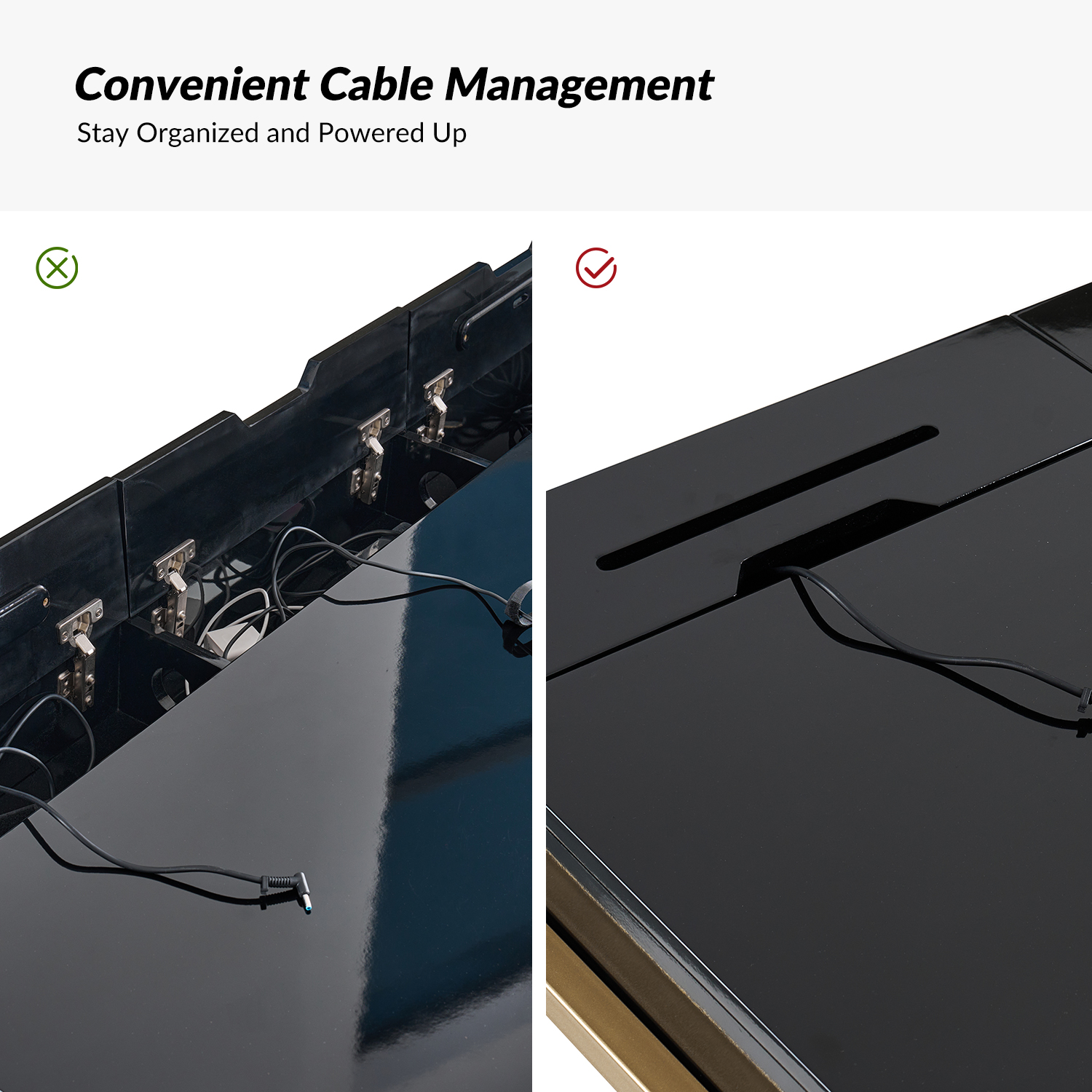 - Advanced Cable Management: Discreet channels and compartments conceal cables, preventing tangling.