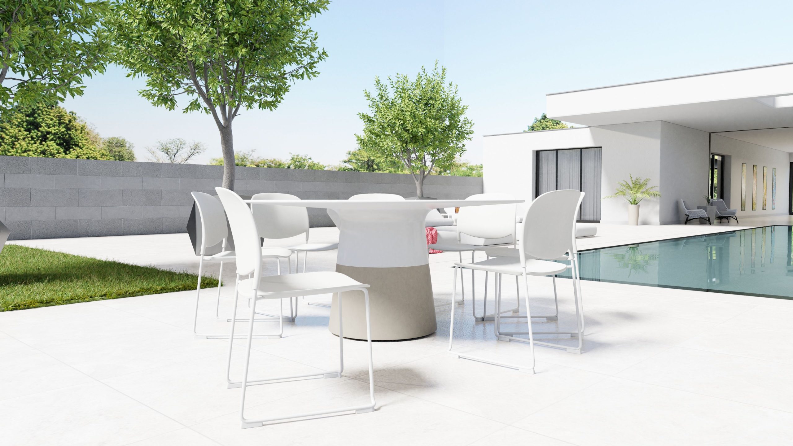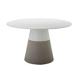 The MALDIVES dining table is a beautifully crafted round outdoor dining table designed for year-round use. Its solid surface top is resurfaceable and resistant to mold, mildew, stains, UV rays, chemical products, and water absorption. The table features a sturdy concrete polymer base with built-in leveling feet, making it perfect for any outdoor space.