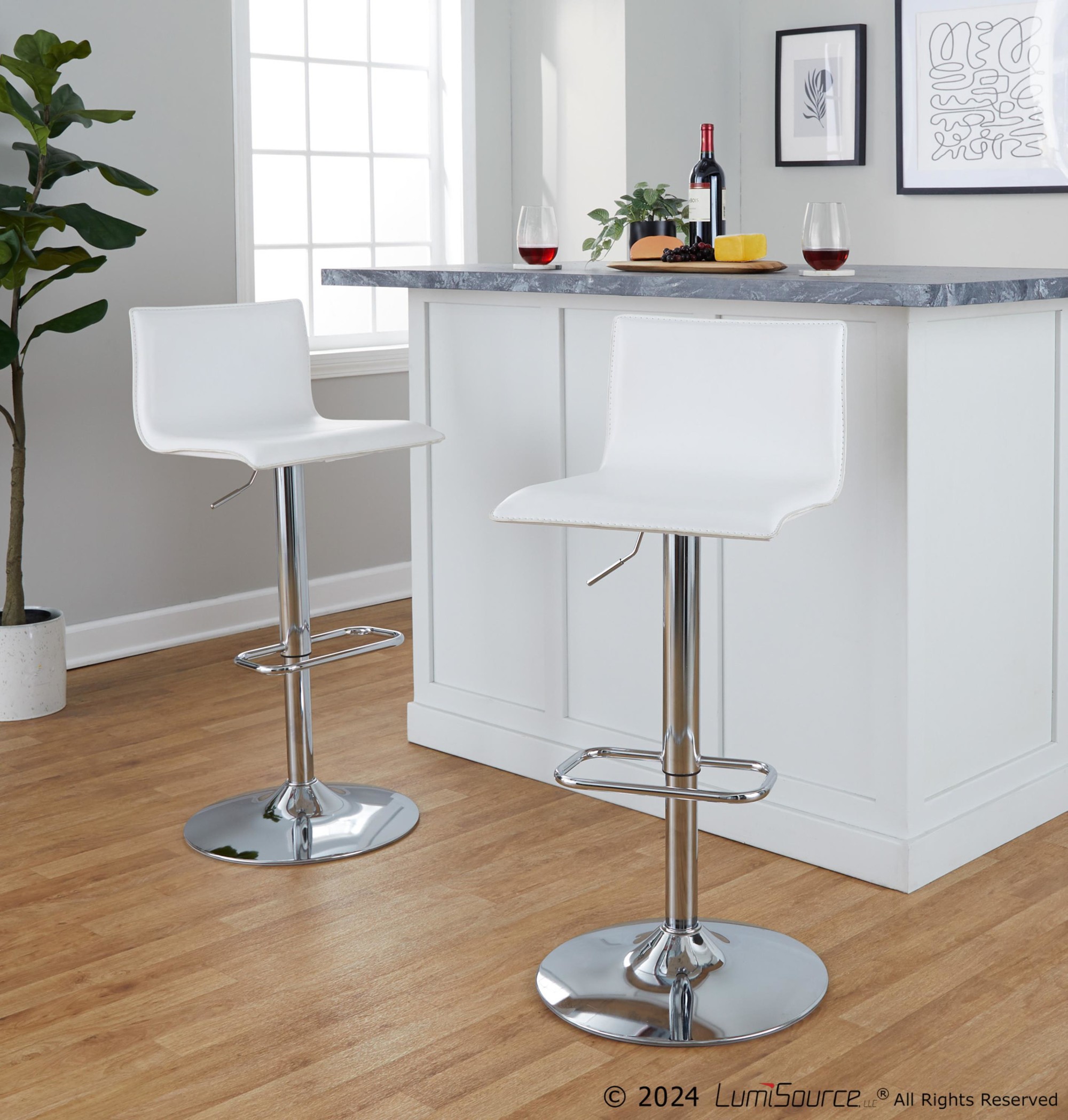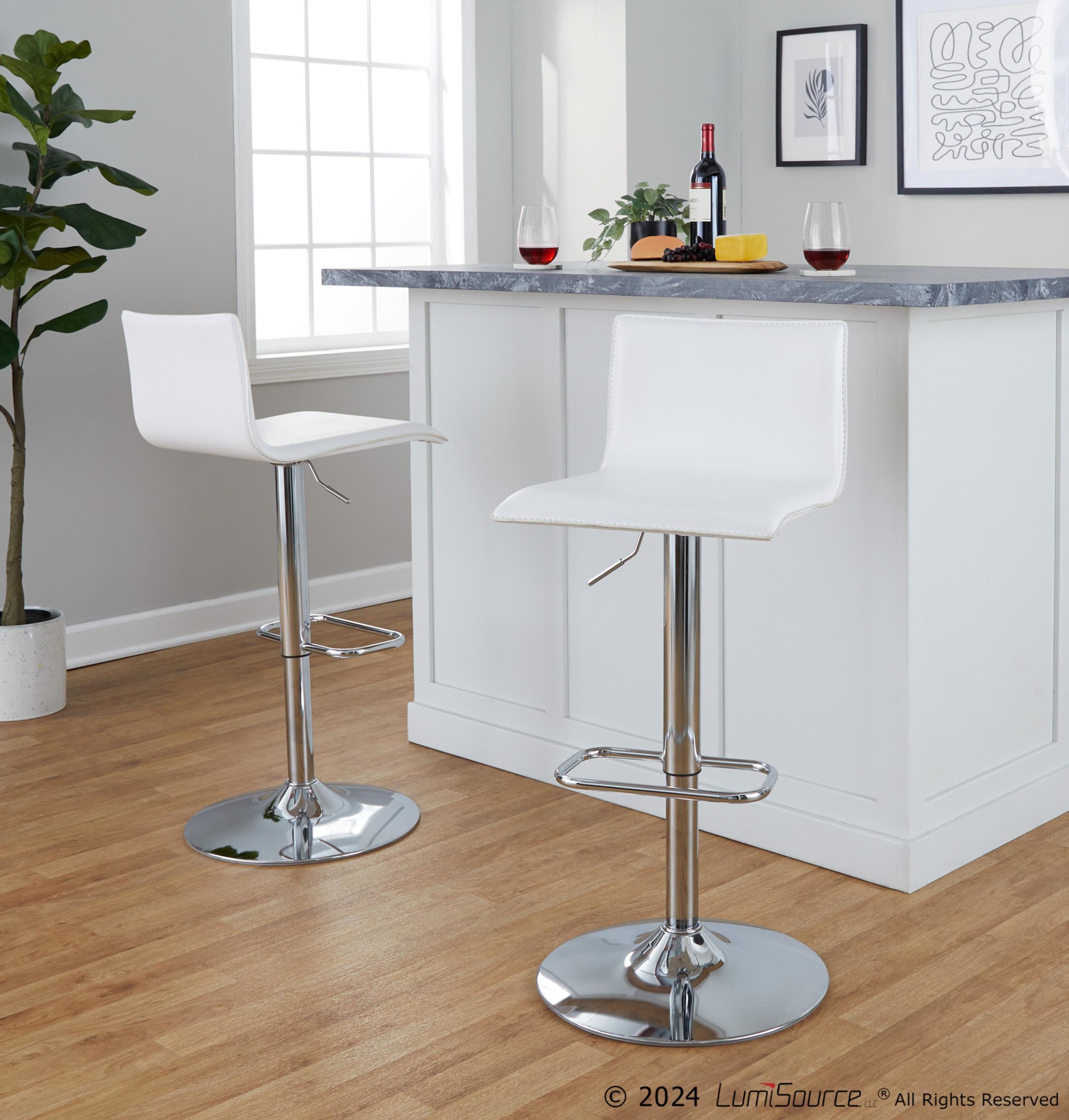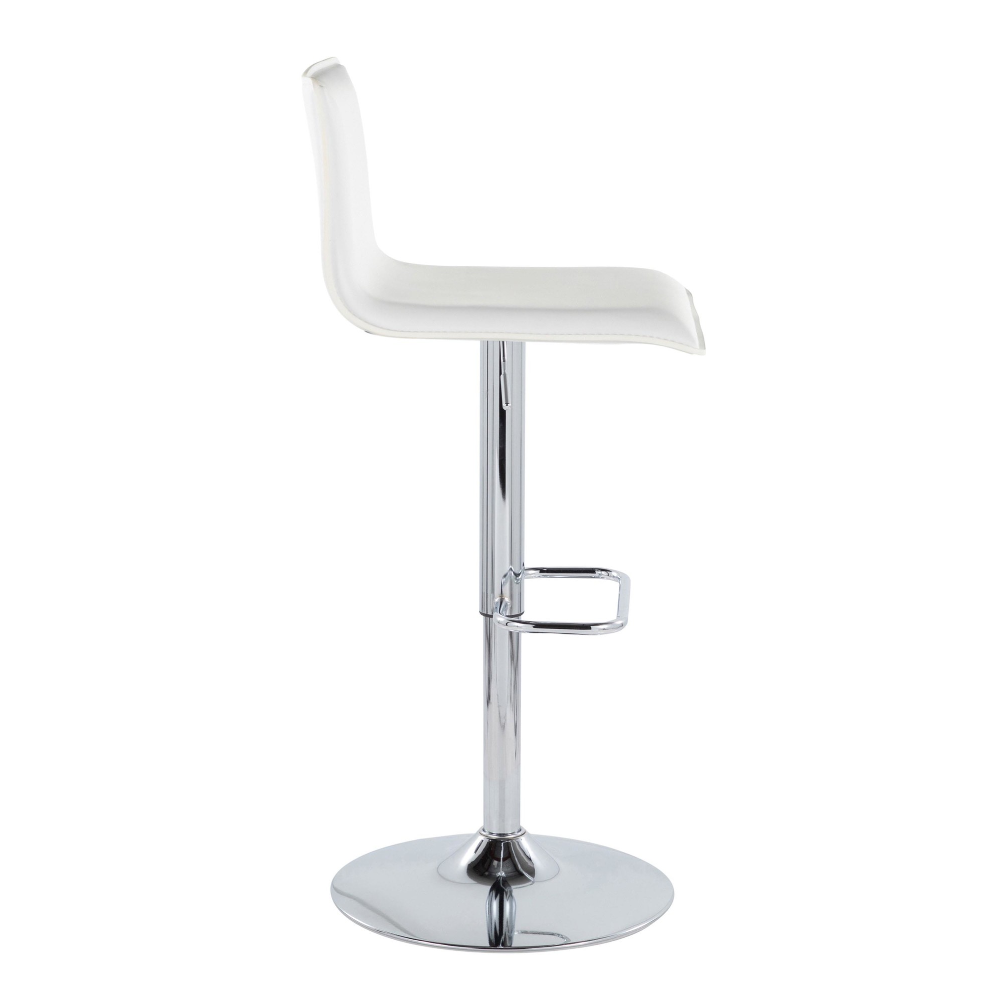 The Mara White Faux Leather Chrome Contemporary Swivel Barstools bring an elegant and modern touch to your kitchen or dining area. These barstools feature a simple design with gorgeous elements, including stylish faux leather upholstery and a sleek chrome metal base. The built-in footrest adds extra comfort. Sold in sets of two, these barstools offer both style and convenience.