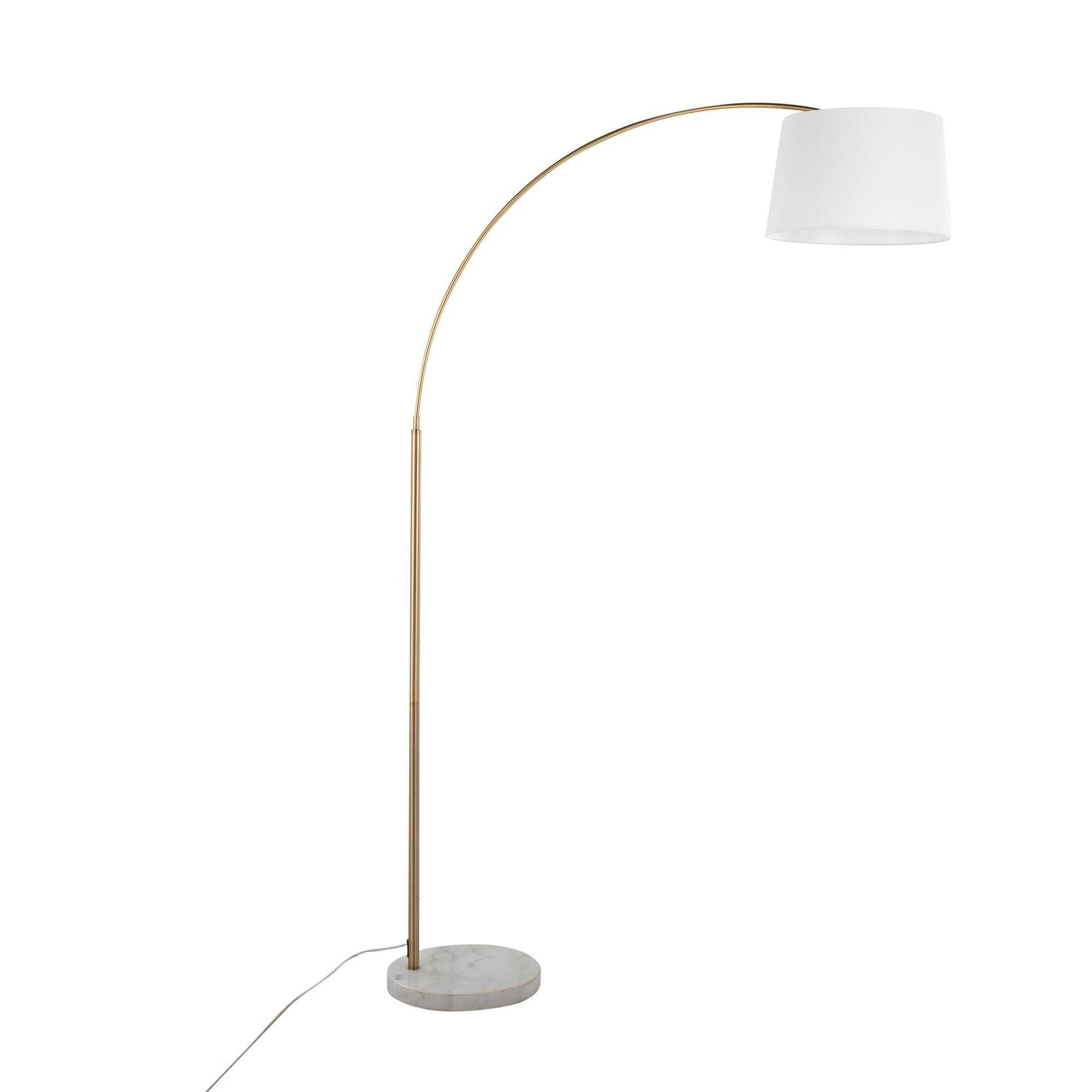 Add a touch of contemporary style to your man cave with the March Contemporary Floor Lamp. This lamp features a dramatic metal arc that adds visual interest to any room. The white linen shade provides a soft, inviting glow. The sturdy white marble base ensures stability and adds a luxurious feel. The antique brass finish complements a variety of decor styles. It has an in-line foot switch for easy on/off operation. This floor lamp requires one 60W bulb (not included) and requires some assembly. Dimensions: 50.5″L × 13.75″W × 74″H.