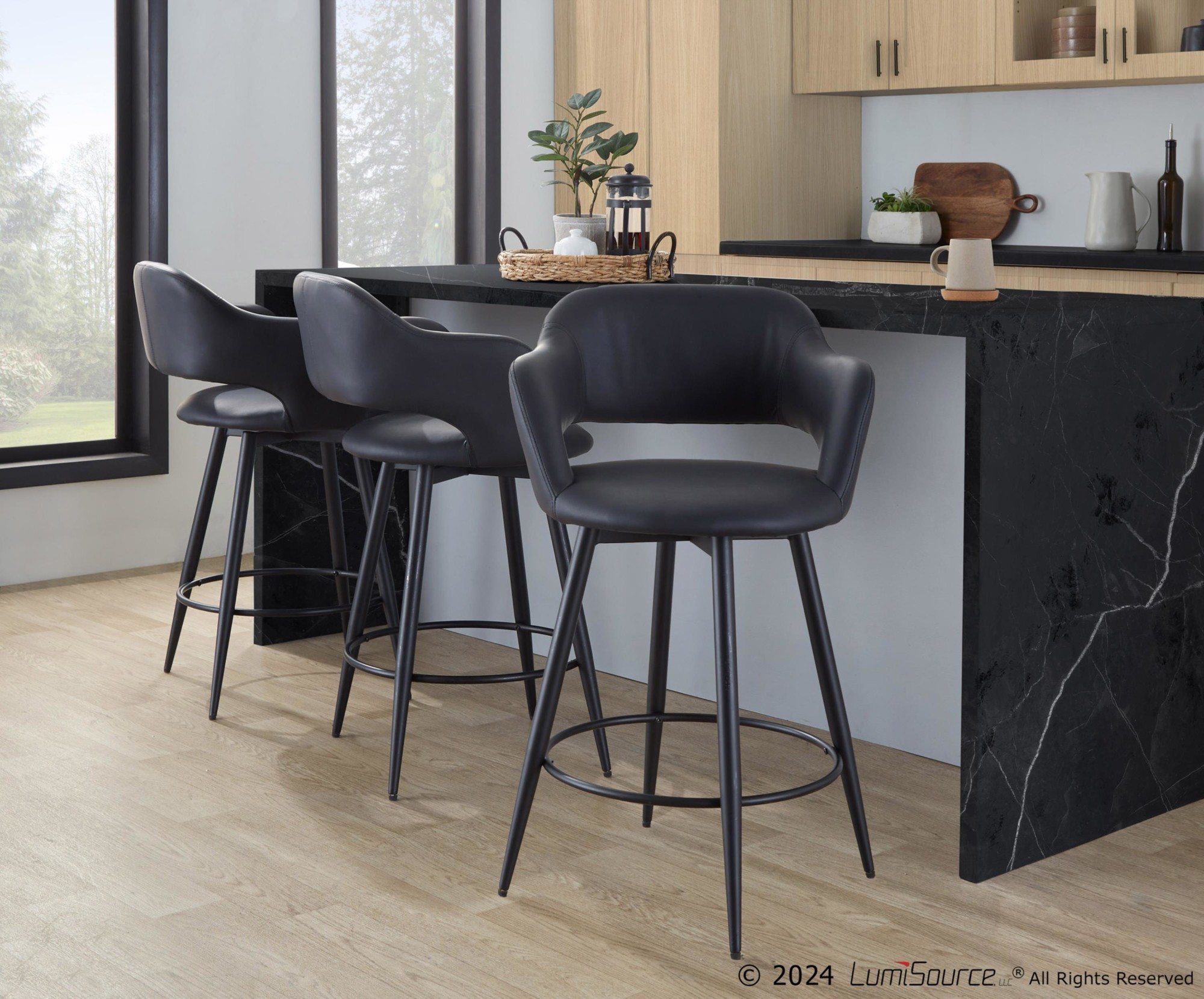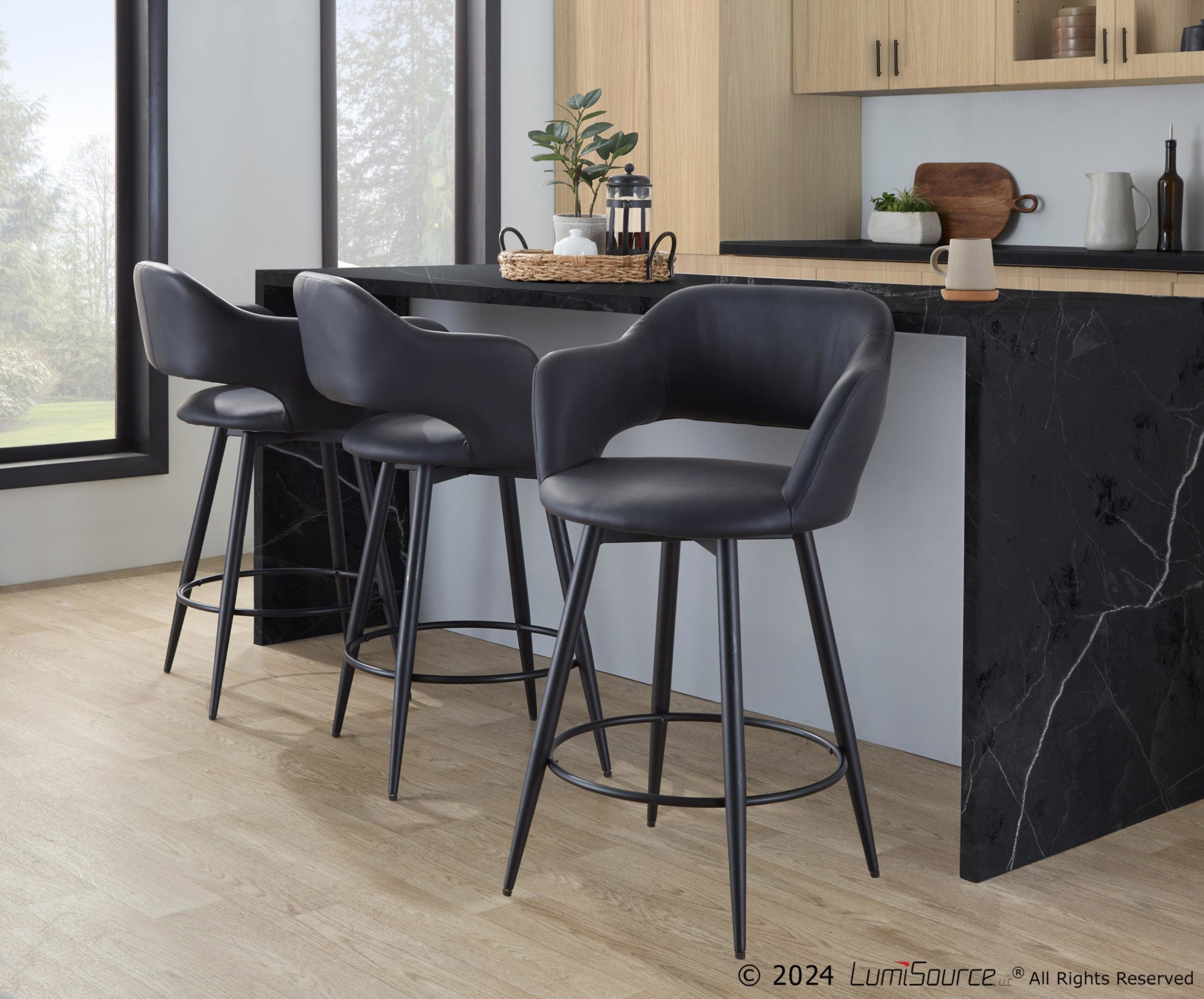 These Margarite 26-Inch Counter Stools offer contemporary styling that will invigorate your space! The cut-out backrest is designed to provide ergonomic support, while the swivel seat and armrests maximize comfort. Kick back and relax with the built-in footrest! Sold in pairs, these stools are the perfect addition to your man cave.