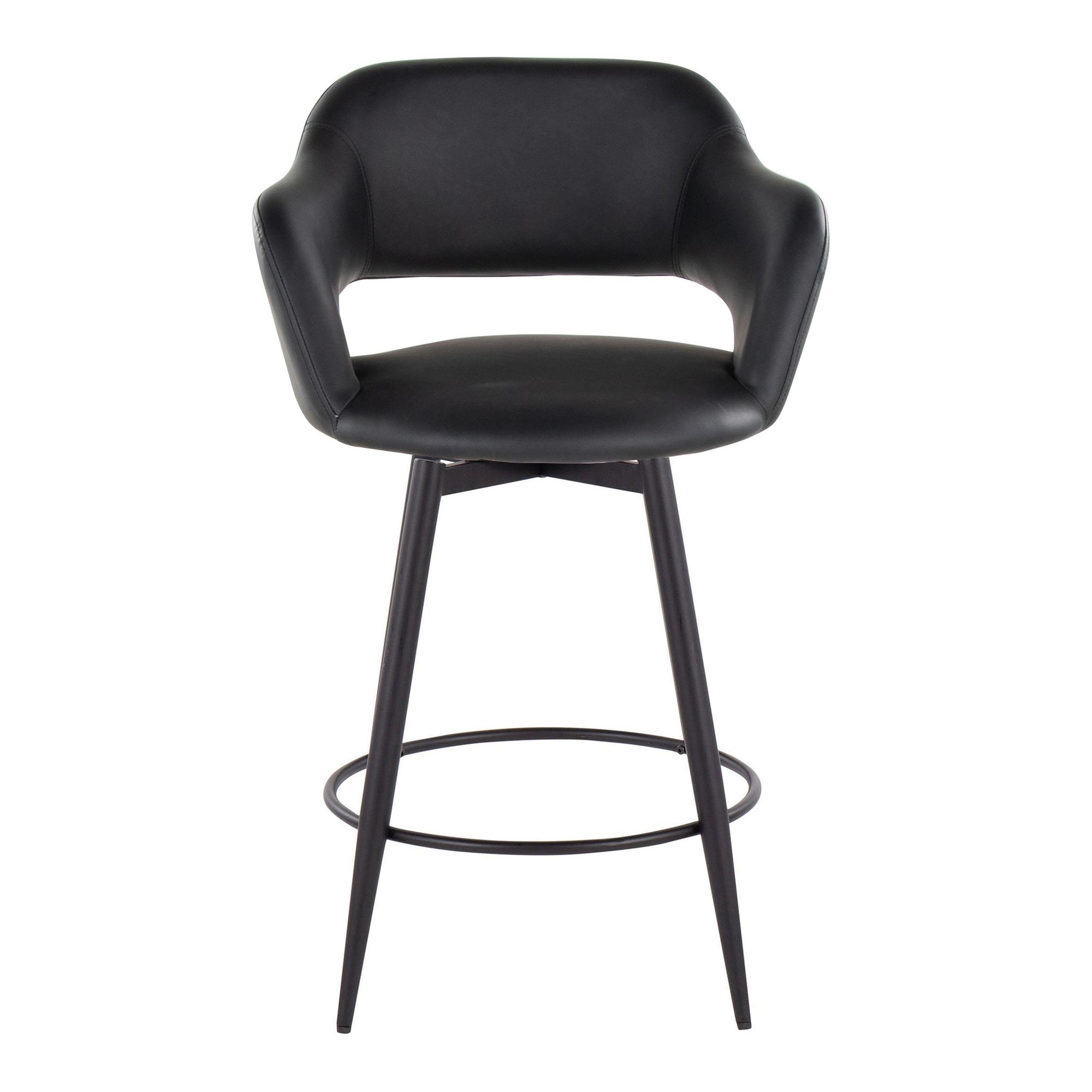 Add a modern touch to your man cave with these stylish counter stools. Sold in pairs, these 26-inch high stools feature a fixed counter height and a convenient 360-degree swivel. Relax with the ergonomic cut-out backrest and armrests, plus a handy built-in footrest. The sleek faux leather upholstery and tapered metal legs create a contemporary look. Assembly is required, and each stool supports up to 250 lbs. Perfect for your bar or game room!