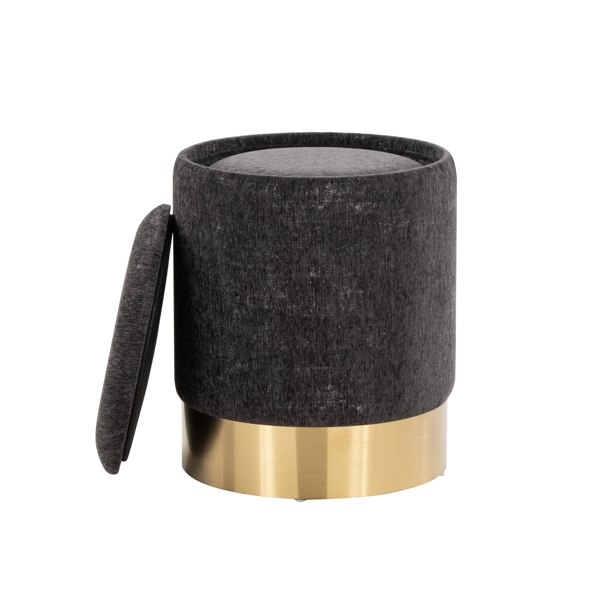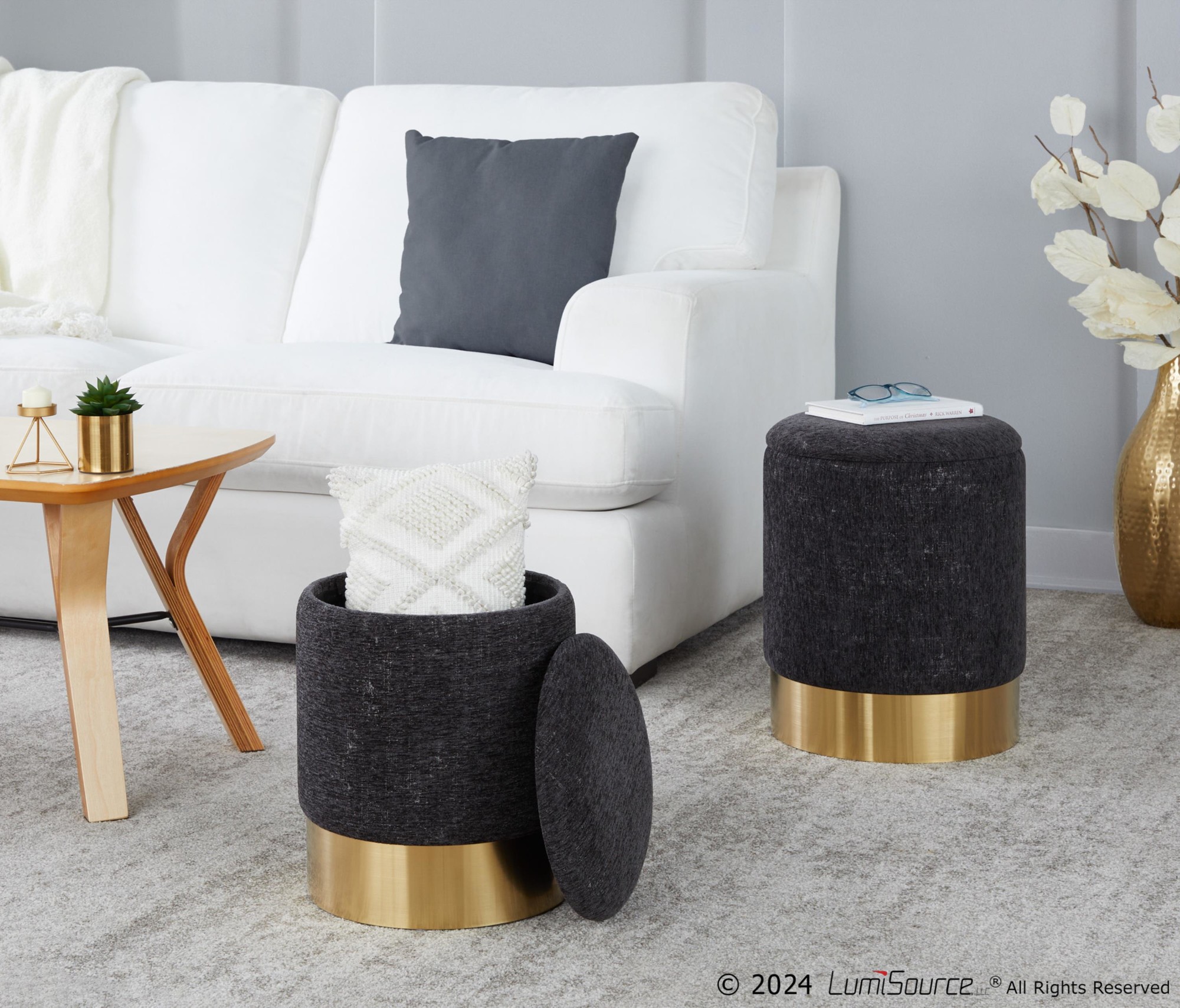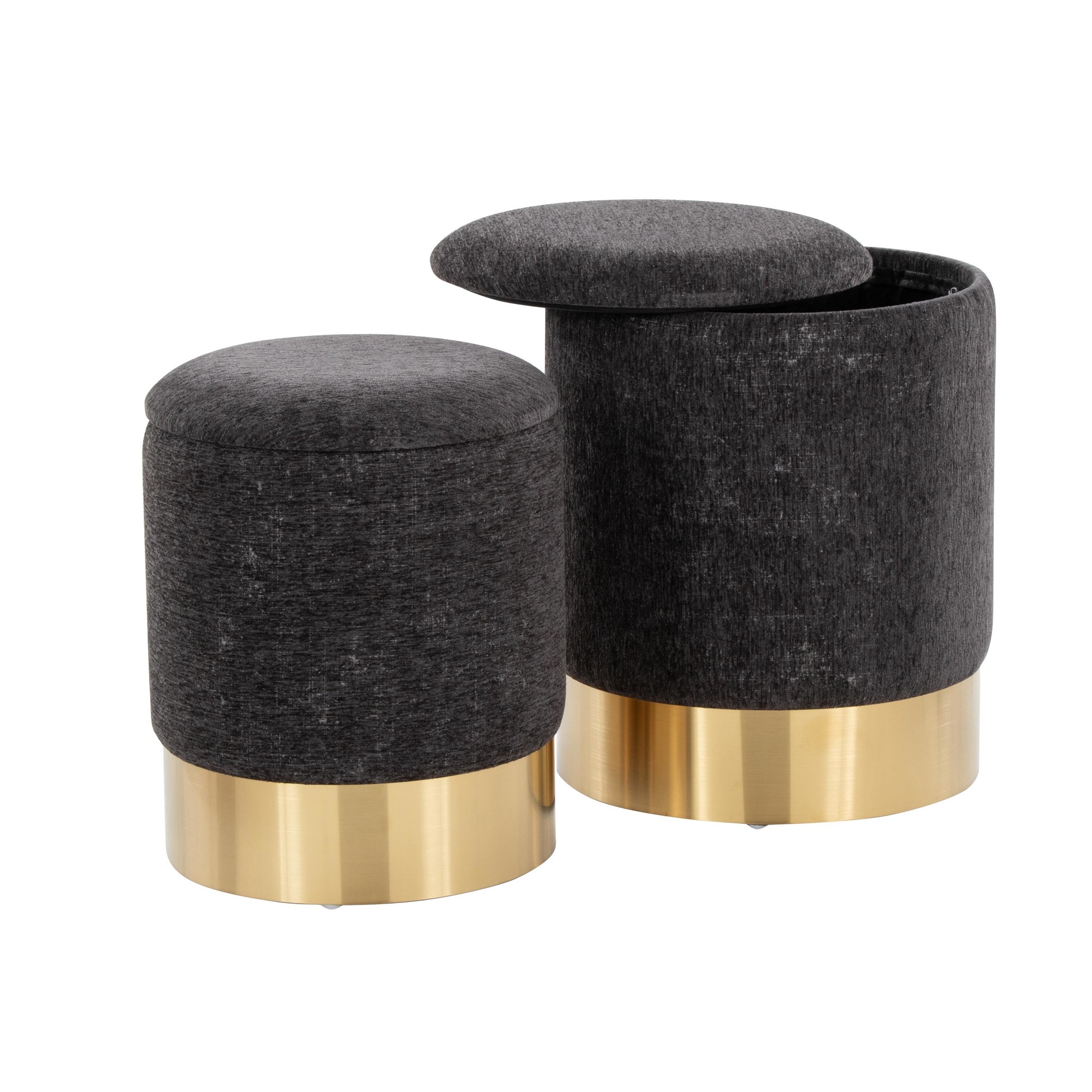 The Marla Nesting Ottoman set brings a touch of glamour to any space with its chic design. This set includes two ottomans, a larger and a smaller one that nests inside for convenient space-saving storage. Enjoy the luxurious comfort of the soft, cushioned plush fabric top and the modern appeal of the gold metal base. Available in black fabric, these ottomans offer both style and functionality.