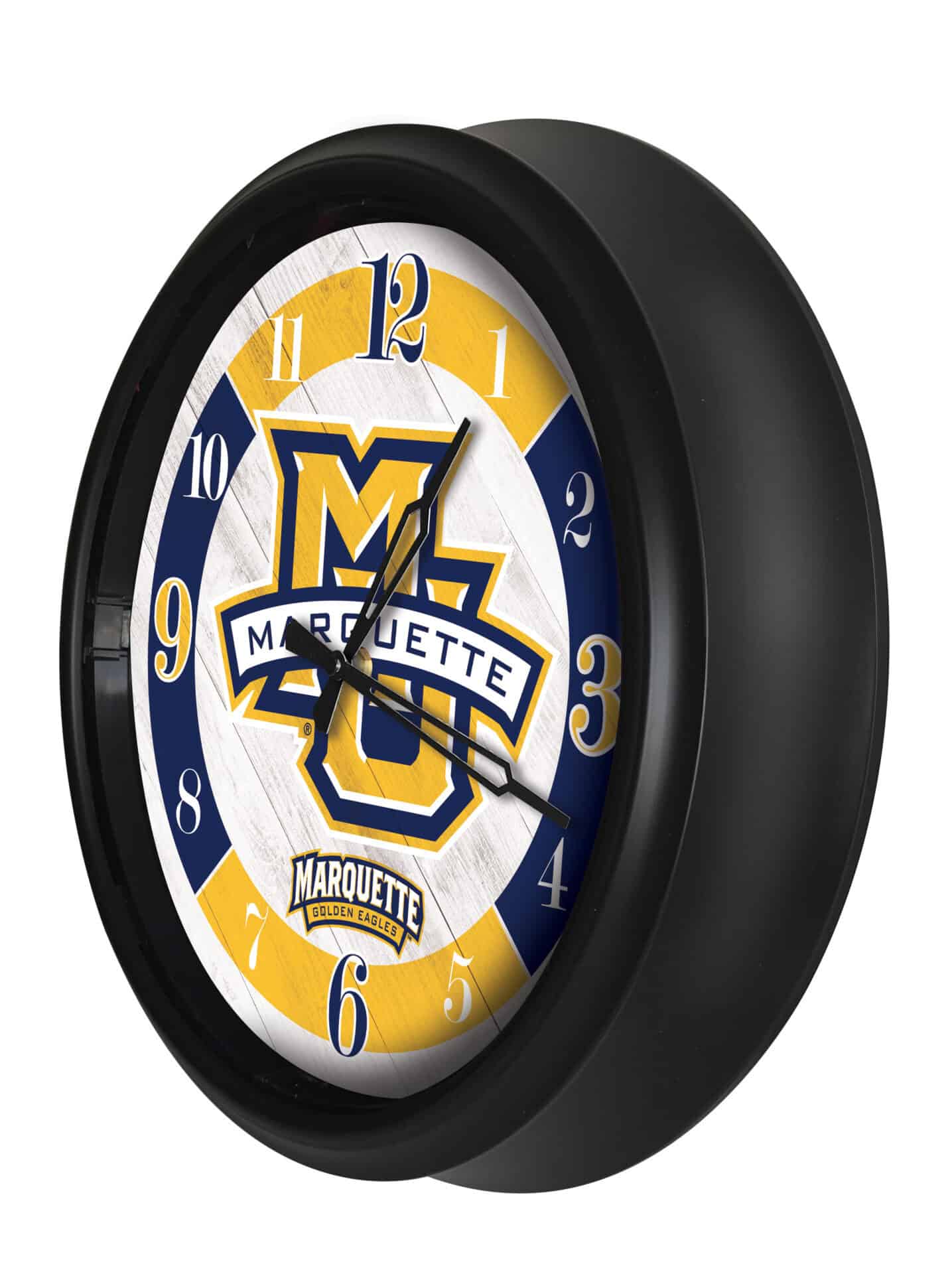 The Marquette University 14-Inch Indoor/Outdoor LED Wall Clock in Black is the perfect addition to your man cave or outdoor space, showcasing your school pride with style. Designed to withstand the elements, this clock features a durable UV resistant black ABS plastic casing and a weather-sealed glass lens, ensuring longevity and reliability. The vibrant artwork is digitally printed with UV inks, providing fade-free colors that stand out. Equipped with photo eye-controlled LED lights, the clock face automatically illuminates in low light conditions, making it easy to read at any time. With accurate quartz movement powered by a single AA battery, this clock combines functionality with a striking design.