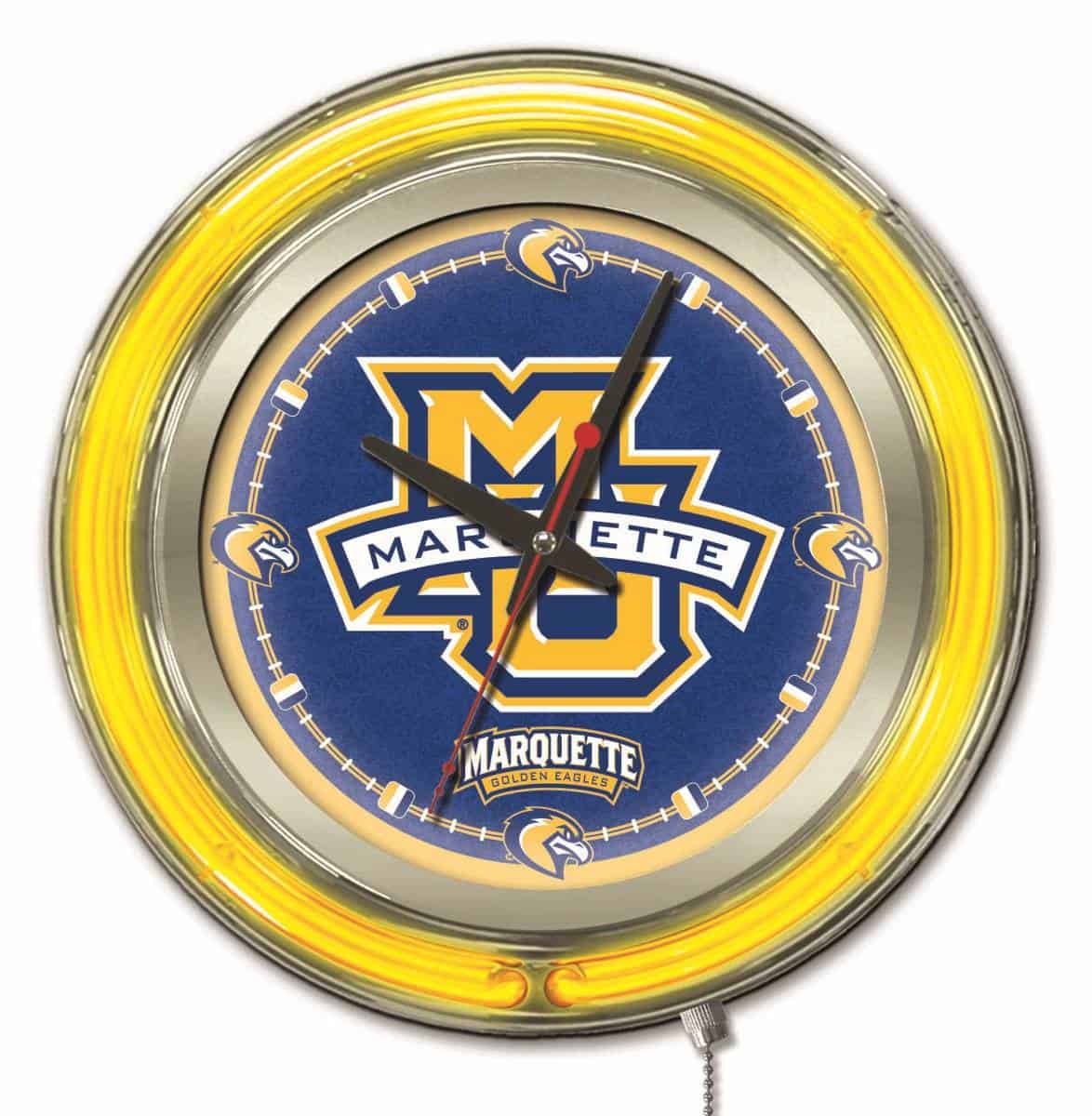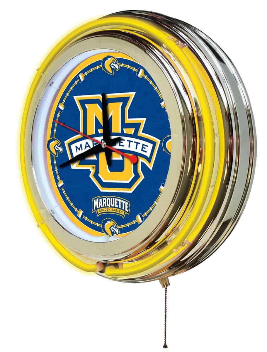 The Marquette University 15-Inch Neon Logo Clock in Chrome is a vibrant addition to any man cave, showcasing your school pride with its eye-catching design. This clock features a chrome casing and a custom printed clock face, illuminated by a brilliant white inner neon ring. The outer ring is in team colors, creating a striking visual appeal. With easy ON/OFF operation via a pull chain, this clock is not only stylish but also functional. Its accurate quartz movement ensures you’re always on time, powered by a single AA battery (not included). Perfect as a gift for graduates, sports fans, or for personal use, this clock combines functionality with team spirit.