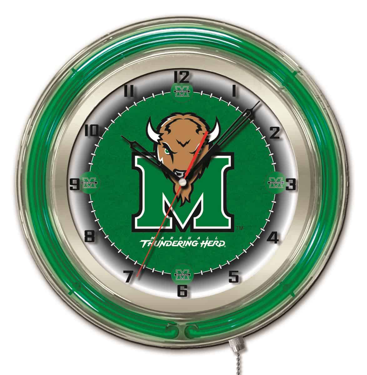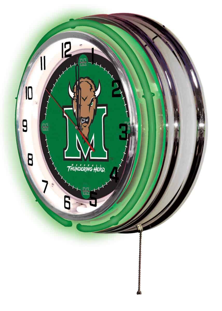 The Marshall University 19-Inch Neon Logo Clock in Chrome is the ultimate statement piece for any fan’s man cave. This eye-catching clock combines vibrant, full-color artwork with a stylish chrome casing, making it not just a timekeeper, but a showcase of school pride. The double neon tubes, featuring one accent color and a white inner ring for illumination, ensure that the clock face is always visible and striking. With a convenient pull chain for easy on/off operation, this clock is both functional and fun. Perfect as a gift for graduates, sports enthusiasts, or for personal use, this clock is a must-have.