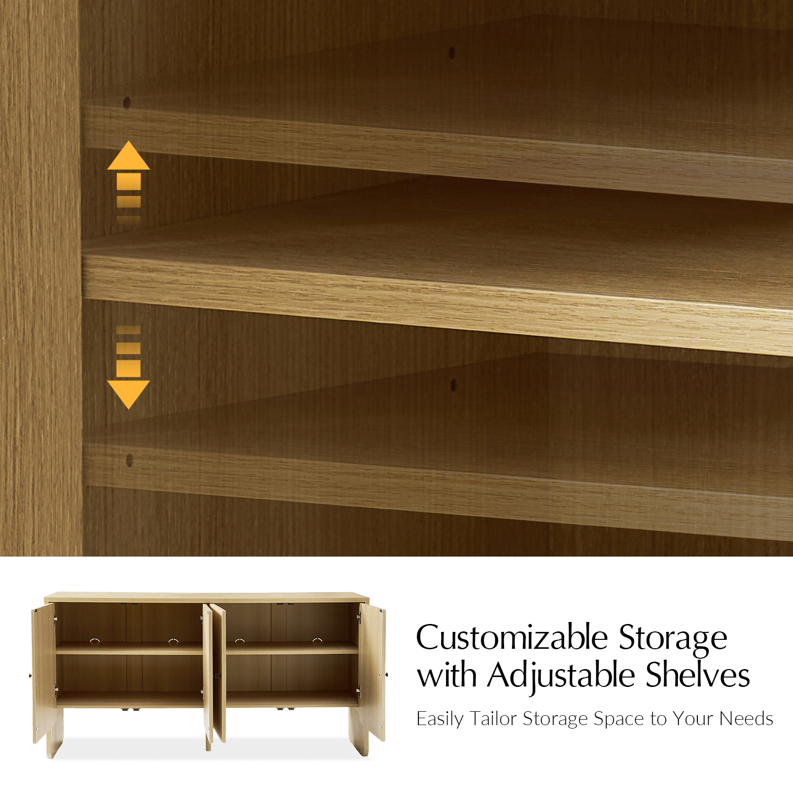 - Customizable Storage: Equipped with adjustable shelves, the sideboard adapts effortlessly to your storage needs.