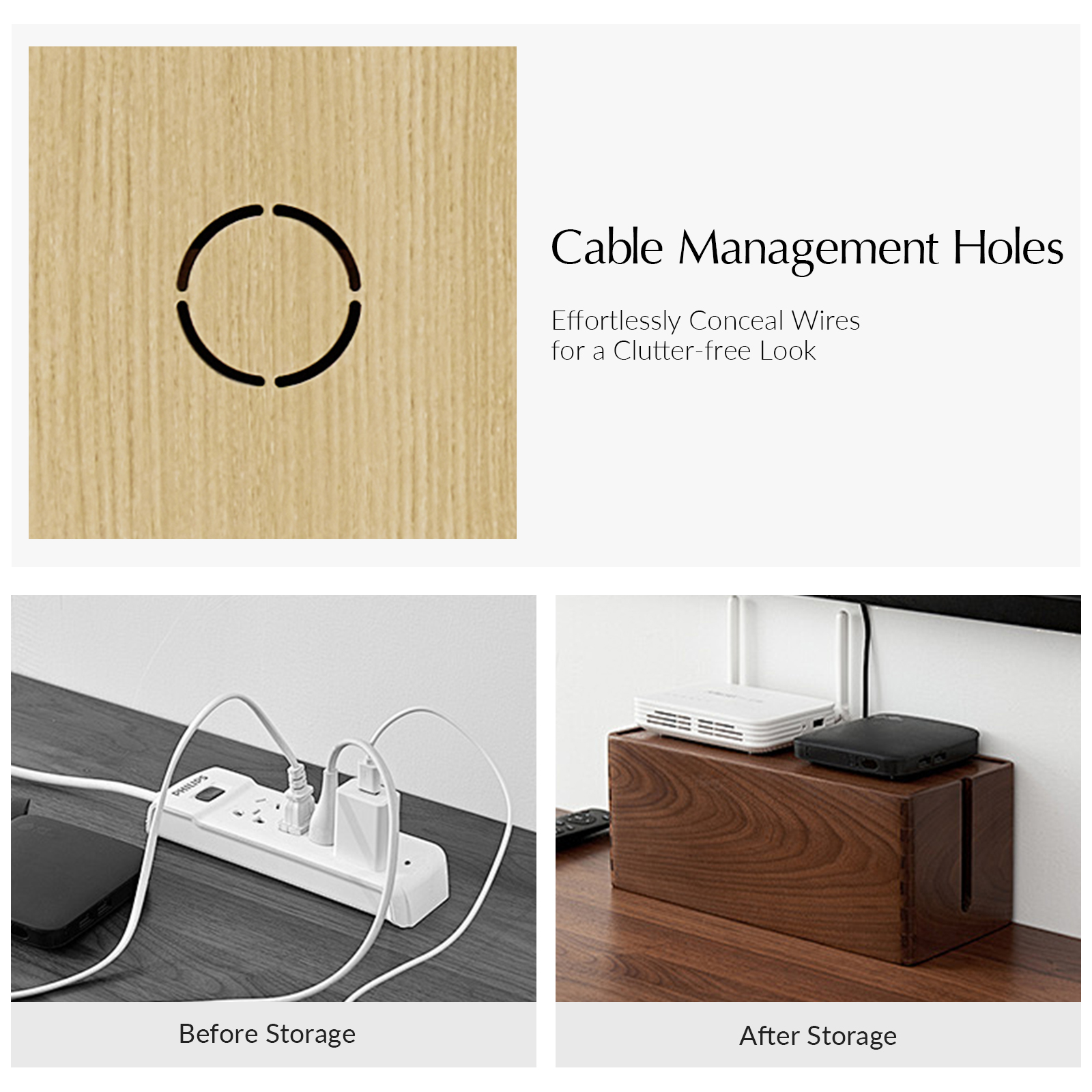 - Cable Management: Features a built-in cable hole to neatly organize wires and cords, ensuring a tidy appearance.