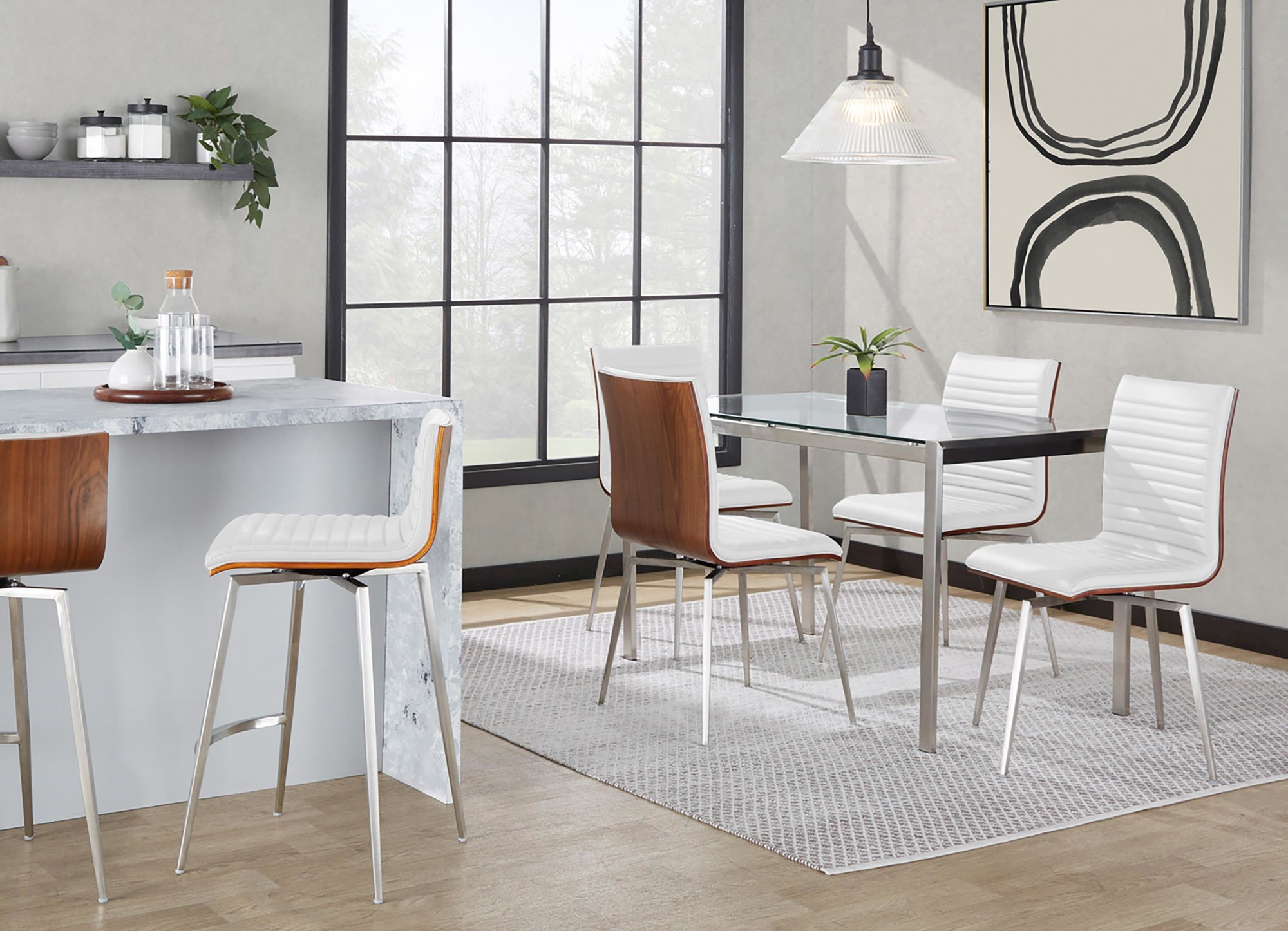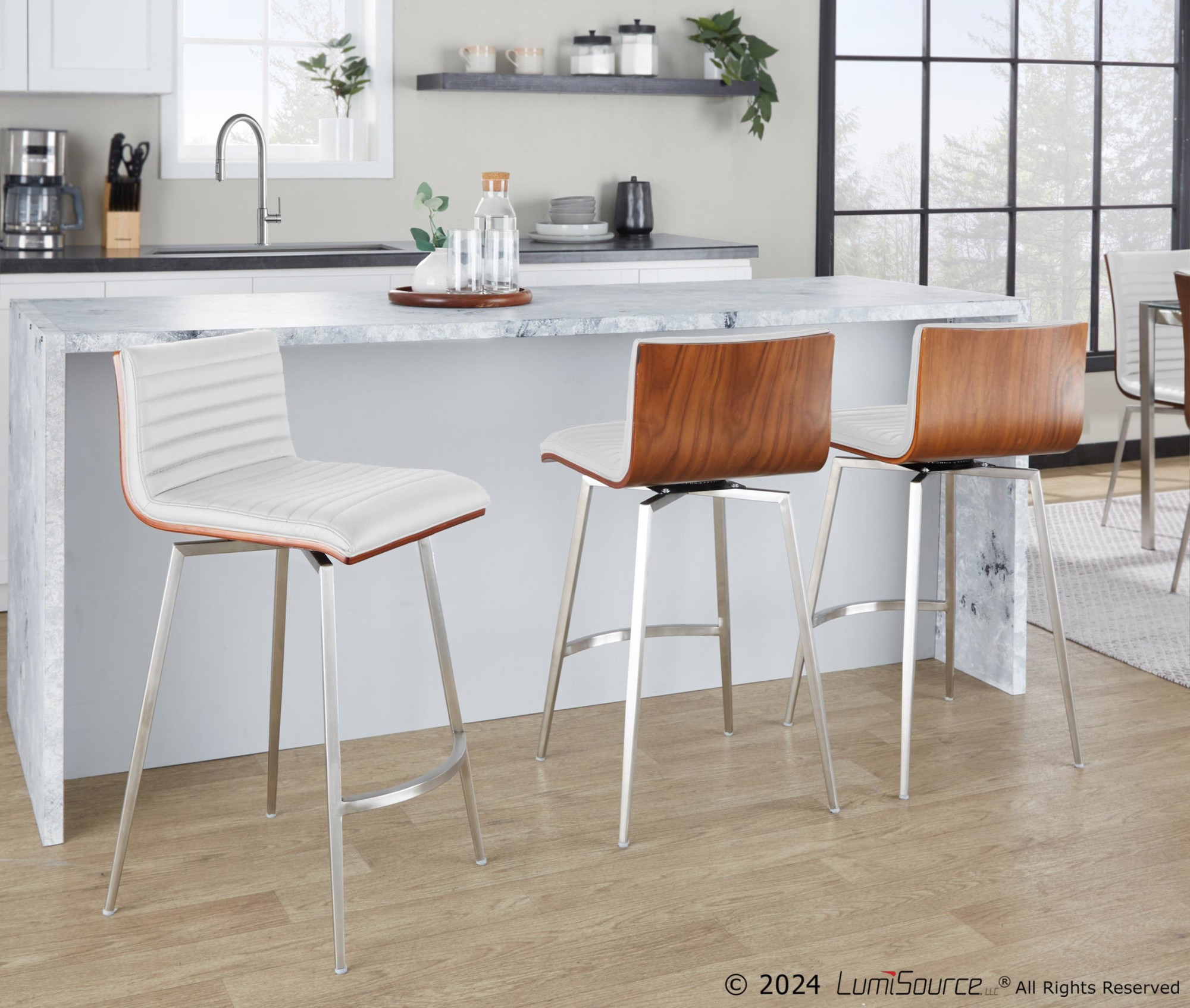 The Mason Swivel Counter Stool features a simple and sleek design that is both versatile and aesthetically pleasing. Its solid wood back, tufted faux leather seat, and stainless steel base allow it to pair nicely with a variety of decor styles.