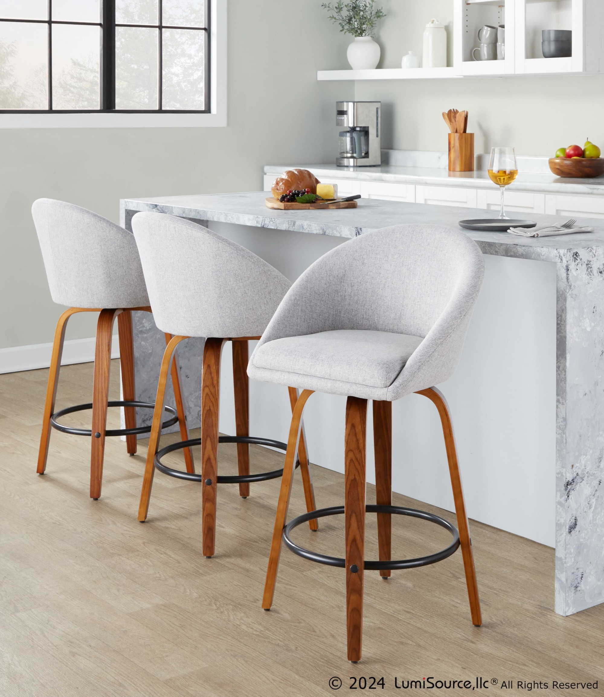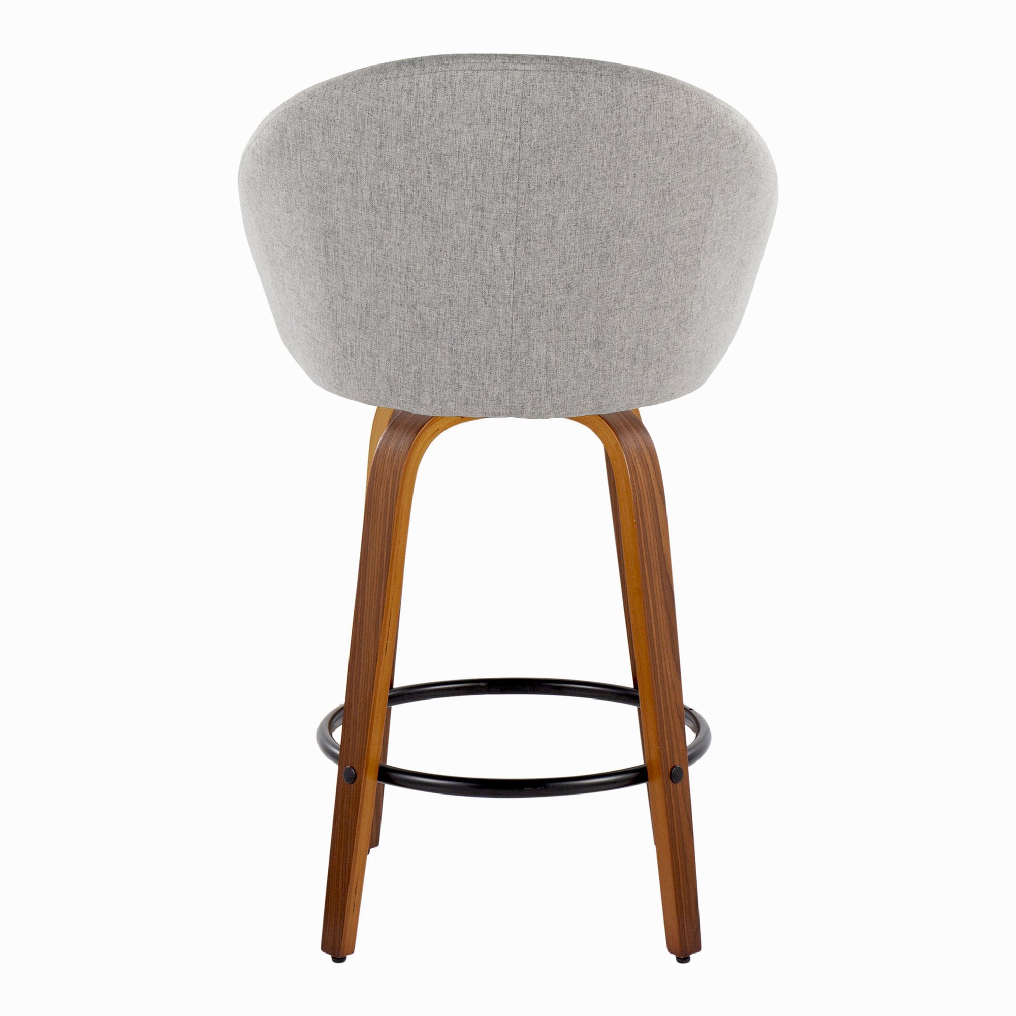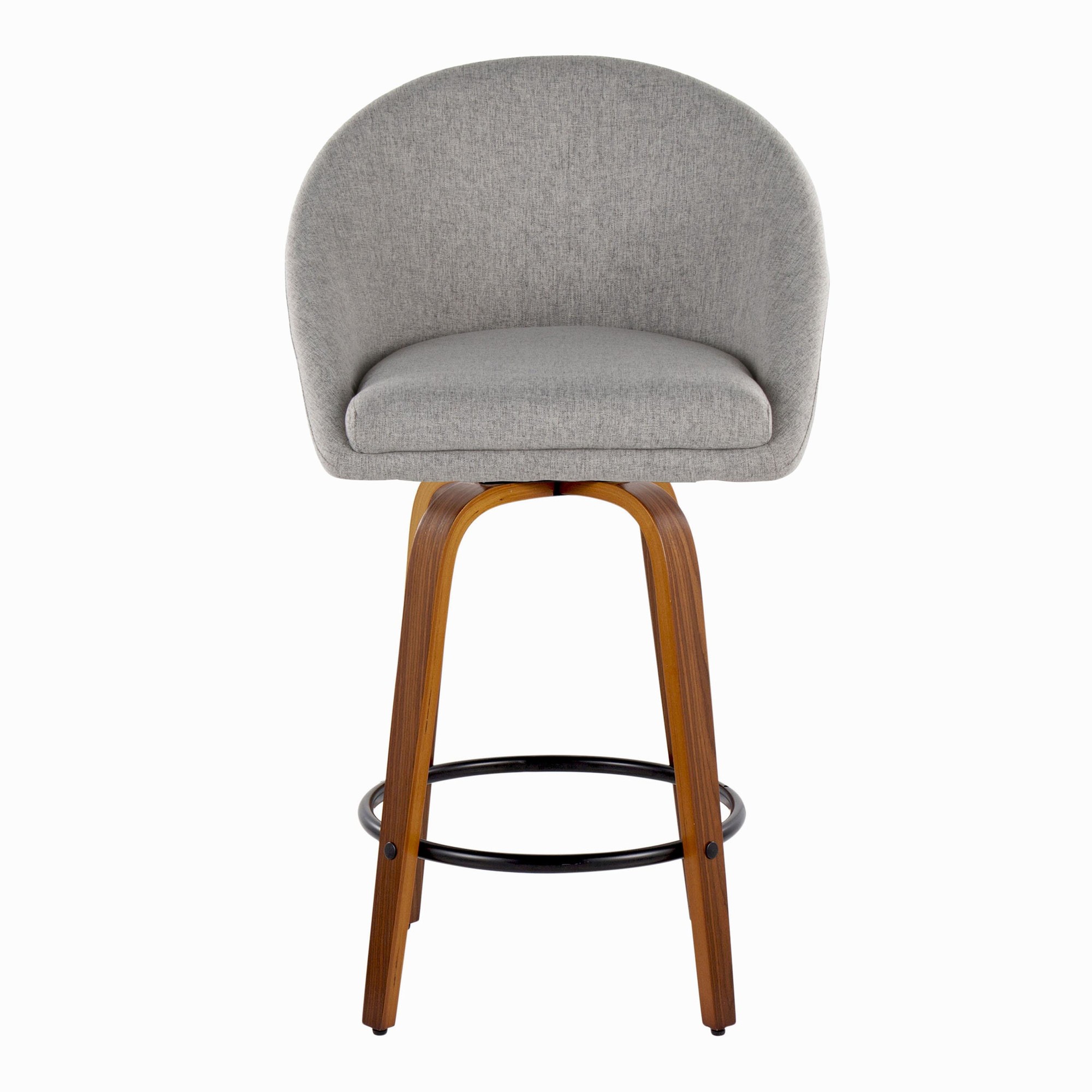 Add a touch of modern comfort to your man cave with the Matisse Grey Fabric Walnut Contemporary 26-Inch Swivel Stools. This set of two counter stools features a stylish, rounded seat upholstered in soft grey fabric. The sleek bent wood legs and round metal footrest offer both stability and a touch of sophistication. Each stool has a 360-degree swivel, perfect for keeping an eye on the game or chatting with friends at your bar. These stools are priced and sold in pairs, require some assembly, and each has a weight limit of 250 lbs. The fixed counter height with a seat to floor measurement of 26 inches makes them the ideal addition to your bar area. Material: Polyester Fabric, Foam, Metal, Bent Wood.
