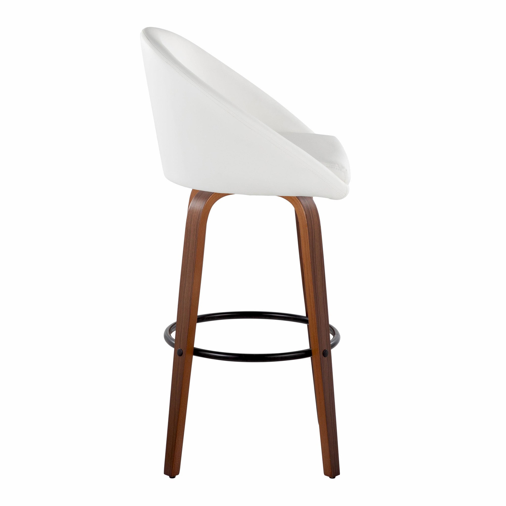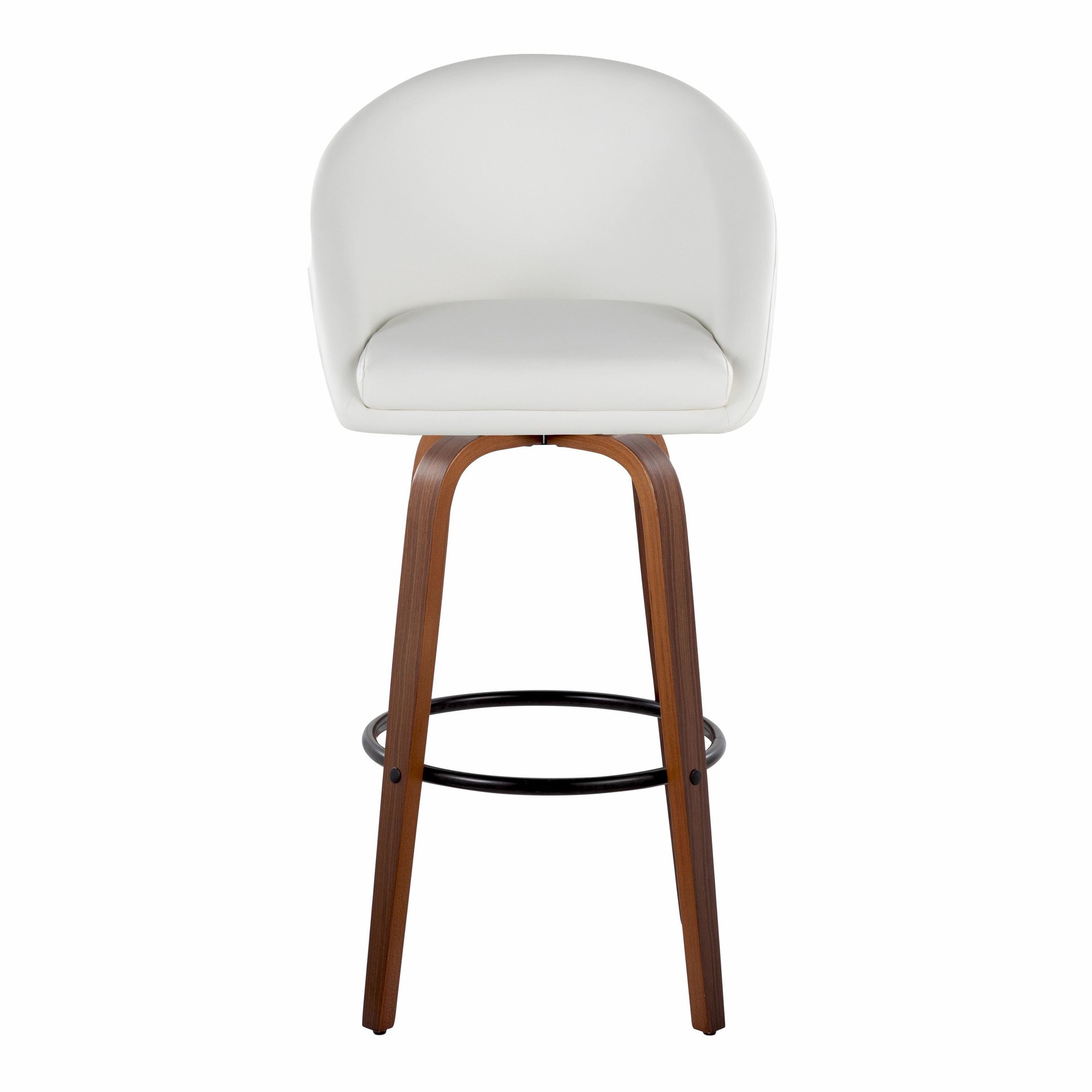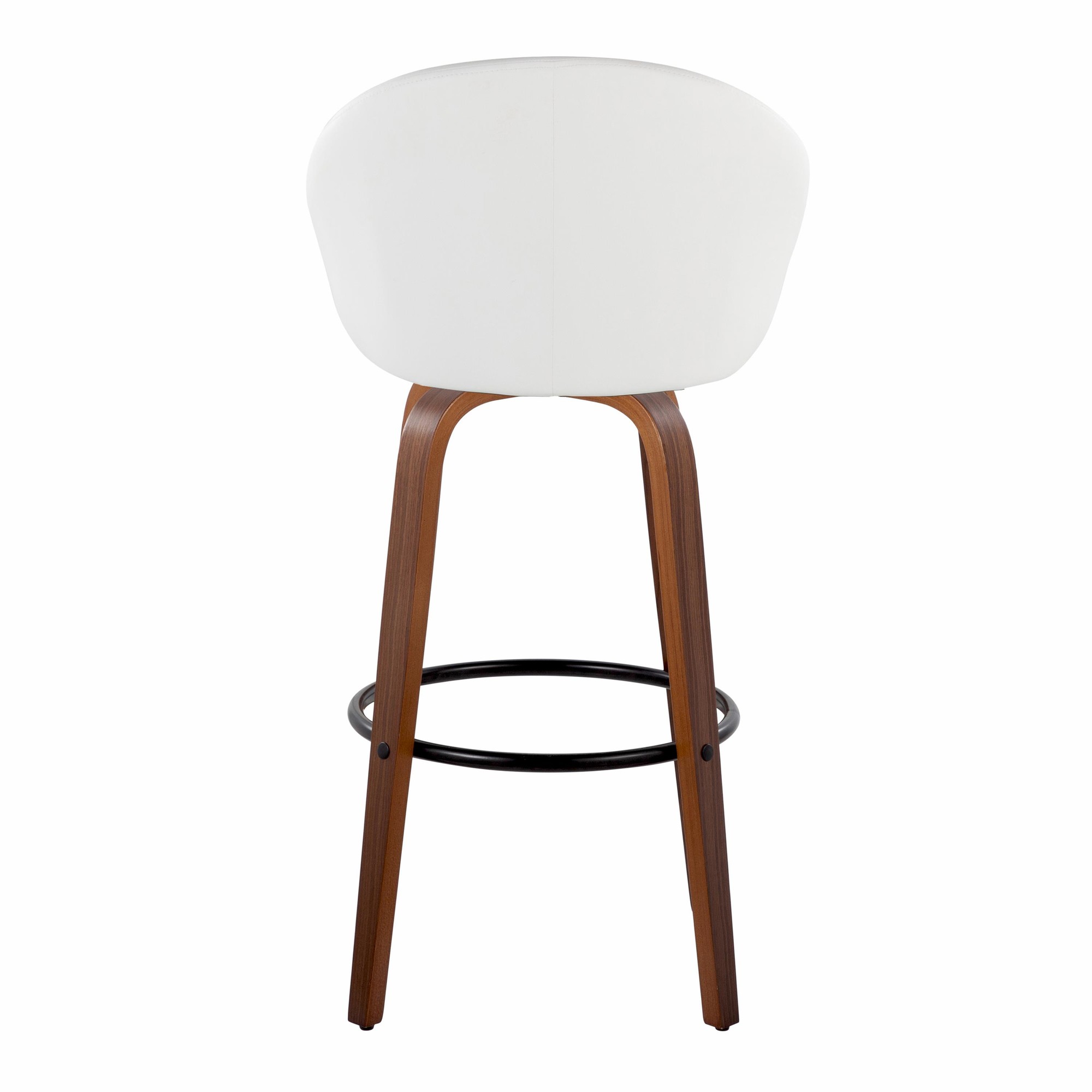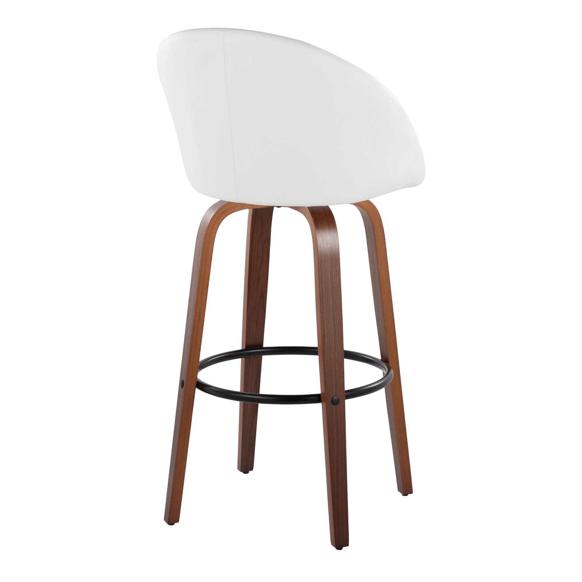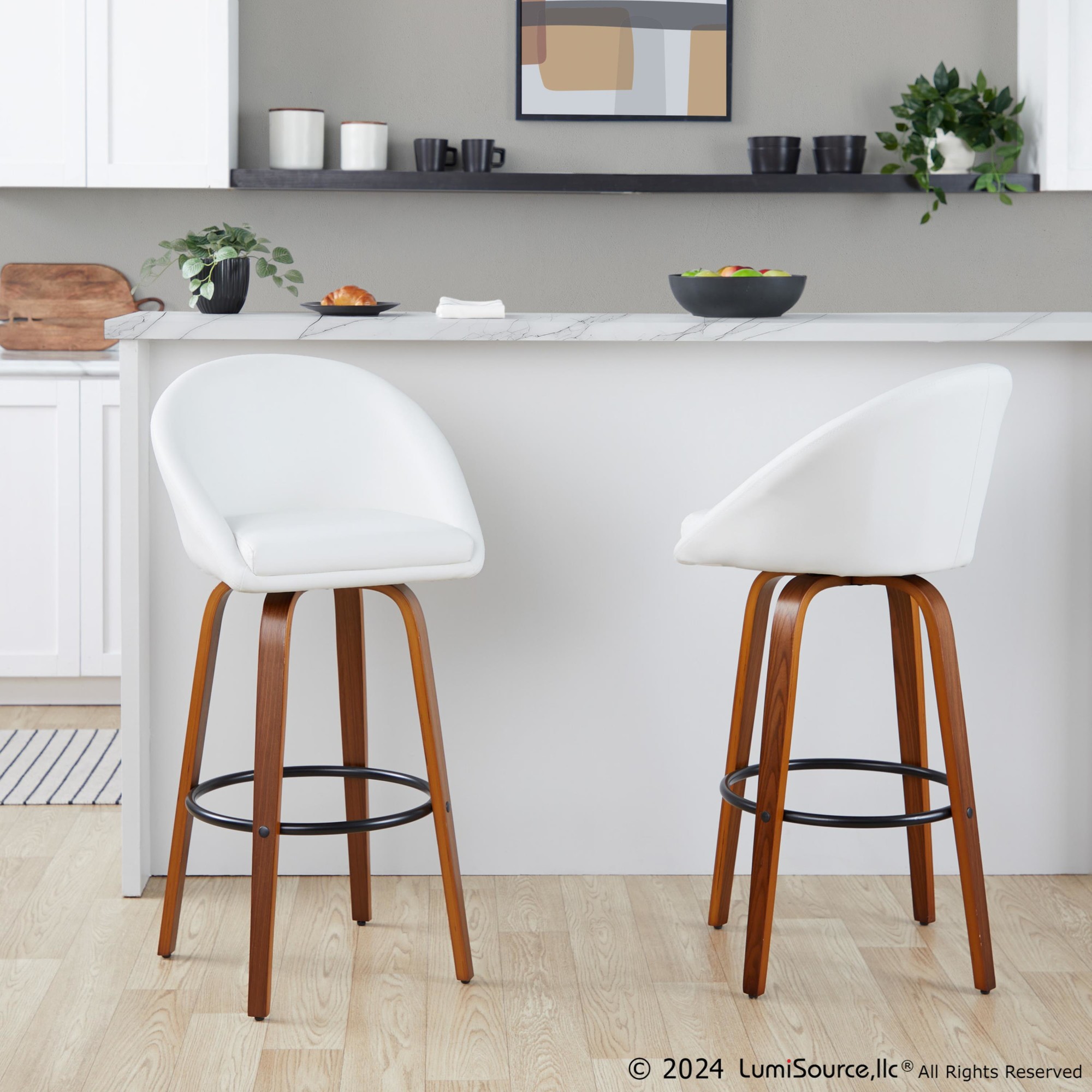 The Matisse Walnut and White Contemporary Swivel Barstools offer a harmonious blend of modern design and exceptional comfort. These fixed-height barstools feature a stylish, rounded seat with plush upholstery, making them an ideal addition to any kitchen or bar area. The combination of sleek bent wood legs and a round metal footrest ensures both stability and a touch of sophistication, transforming your dining experience with a beautiful fusion of style and functionality.