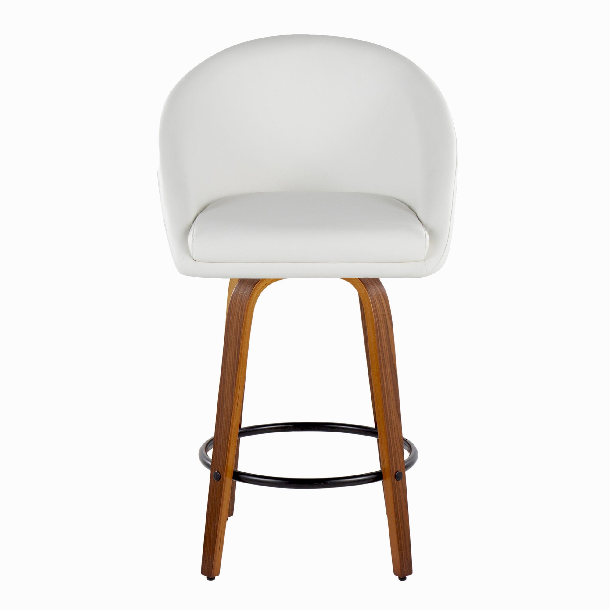 Add a touch of modern style to your bar or counter area with the Matisse Walnut White Contemporary 26-Inch Swivel Counter Stool (Set of 2). This set includes two counter stools featuring contemporary styling and a comfortable fixed counter height. Enjoy the 360-degree swivel, perfect for easy conversation. The stylish faux leather upholstery adds a touch of luxury, while the bent wood legs provide sturdy support. A round black metal footrest completes the look. Color: Walnut Wood, White, Black. Material: Faux Leather, Foam, Metal, Bent Wood. Assembly Required: Yes.