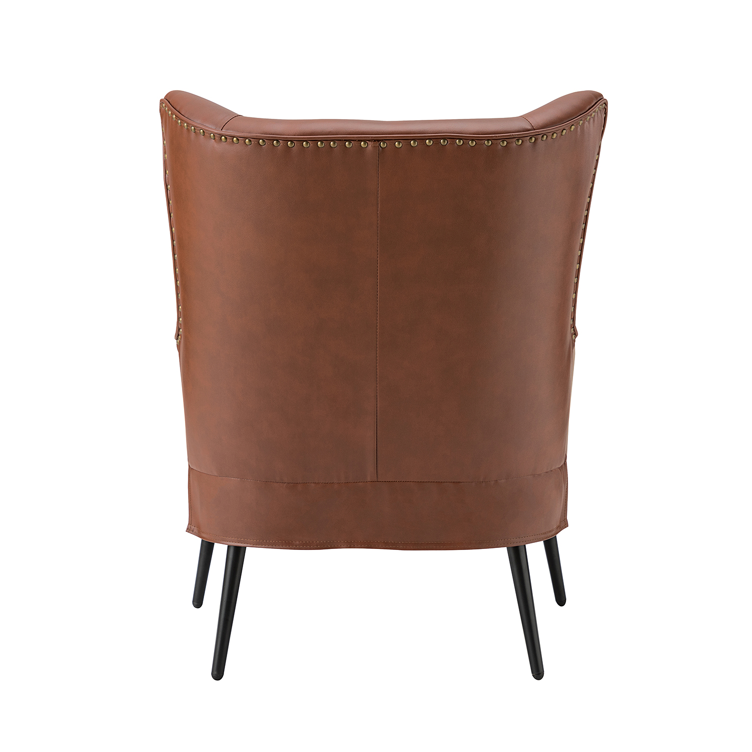 This wingback armchair is a fantastic addition to any living space, blending seamlessly with your existing furniture to bring a modern touch to your home decor. Upholstered in vegan leather, it adds a touch of vintage charm to your living room or bedroom. The uniquely designed arms offer a comfortable place to rest. Both the seat cushion and back are generously filled with thick foam, providing the perfect balance of support for relaxation after a long day of work or study. Built with a sturdy and durable metal and manufactured wood frame, this armchair is ideal for diving into a good book or chatting with friends and family.