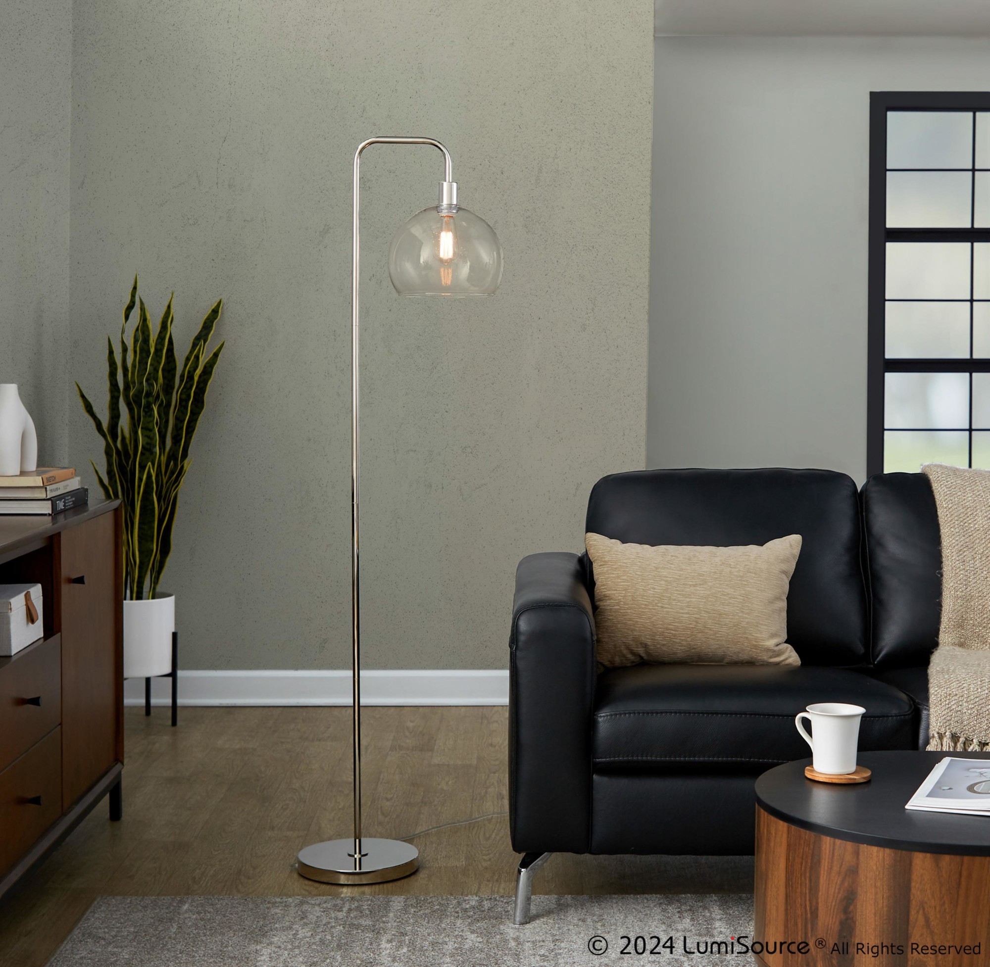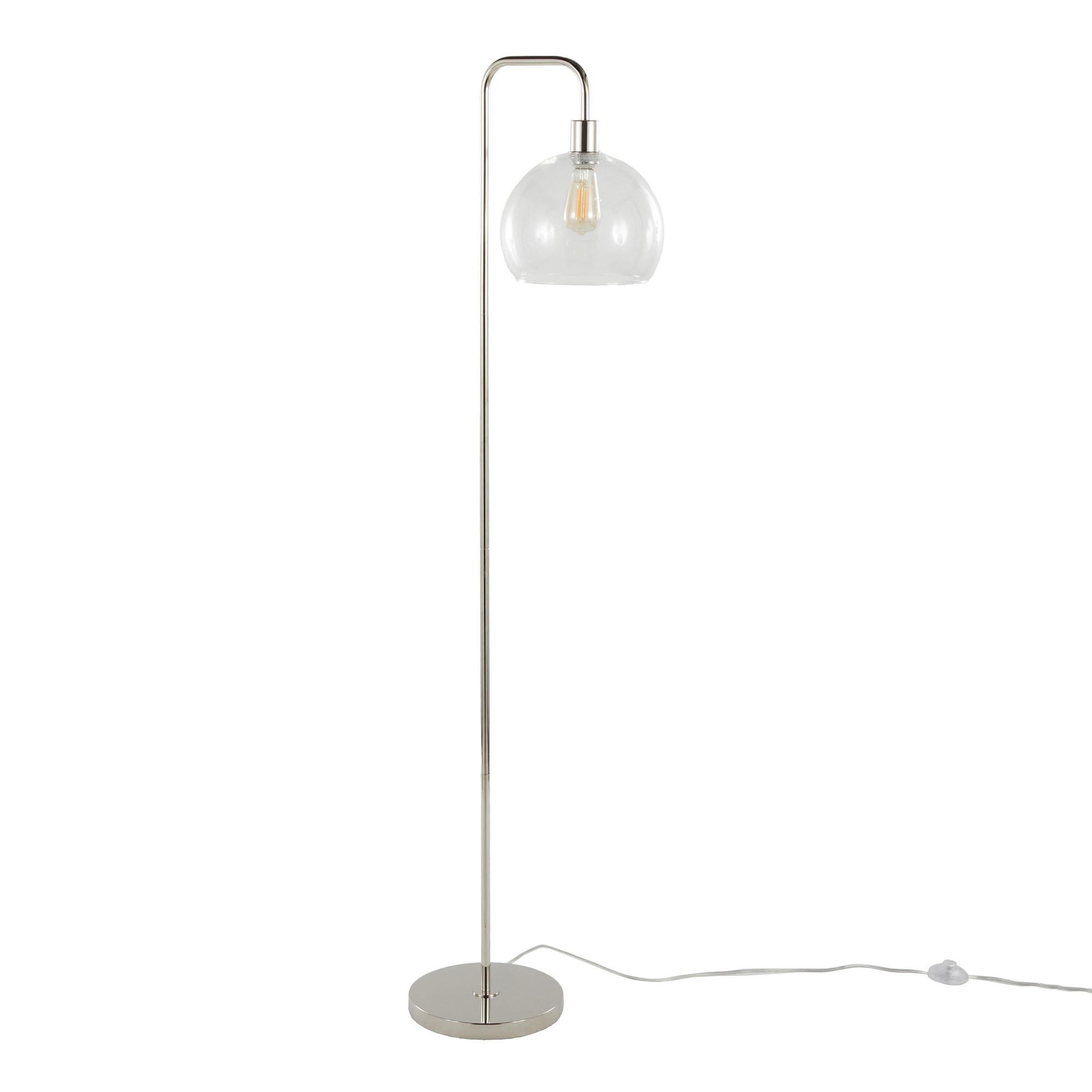 This floor lamp combines contemporary styling with functional design. The clear seeded glass shade adds a touch of elegance, while the arched metal base provides stability and visual appeal. The sleek polished nickel finish complements a variety of decor styles. A convenient foot switch allows for easy on/off operation.