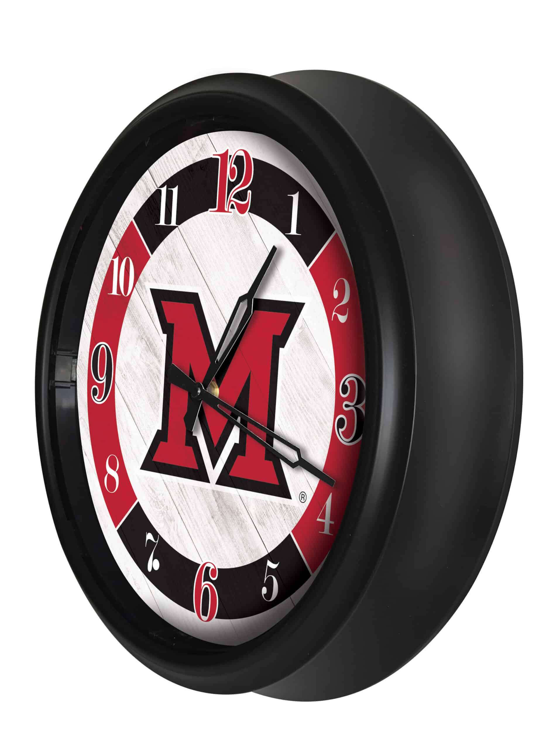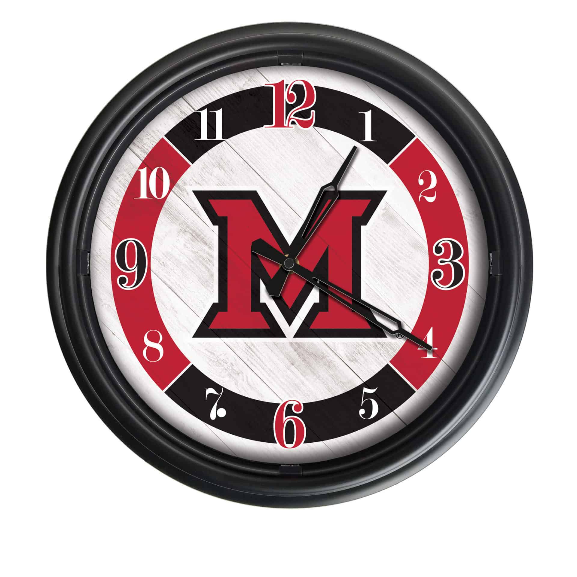 The Miami University (OH) 14-Inch Indoor/Outdoor LED Wall Clock in Black is the ultimate addition to any fan’s space, showcasing your school pride while providing functionality and style. With a durable design that withstands the elements, this clock features vibrant, fade-free artwork and innovative LED illumination that automatically activates in low light. Its accurate quartz movement ensures you’re always on time, making it a perfect gift for graduates, sports enthusiasts, or for your own personal collection.