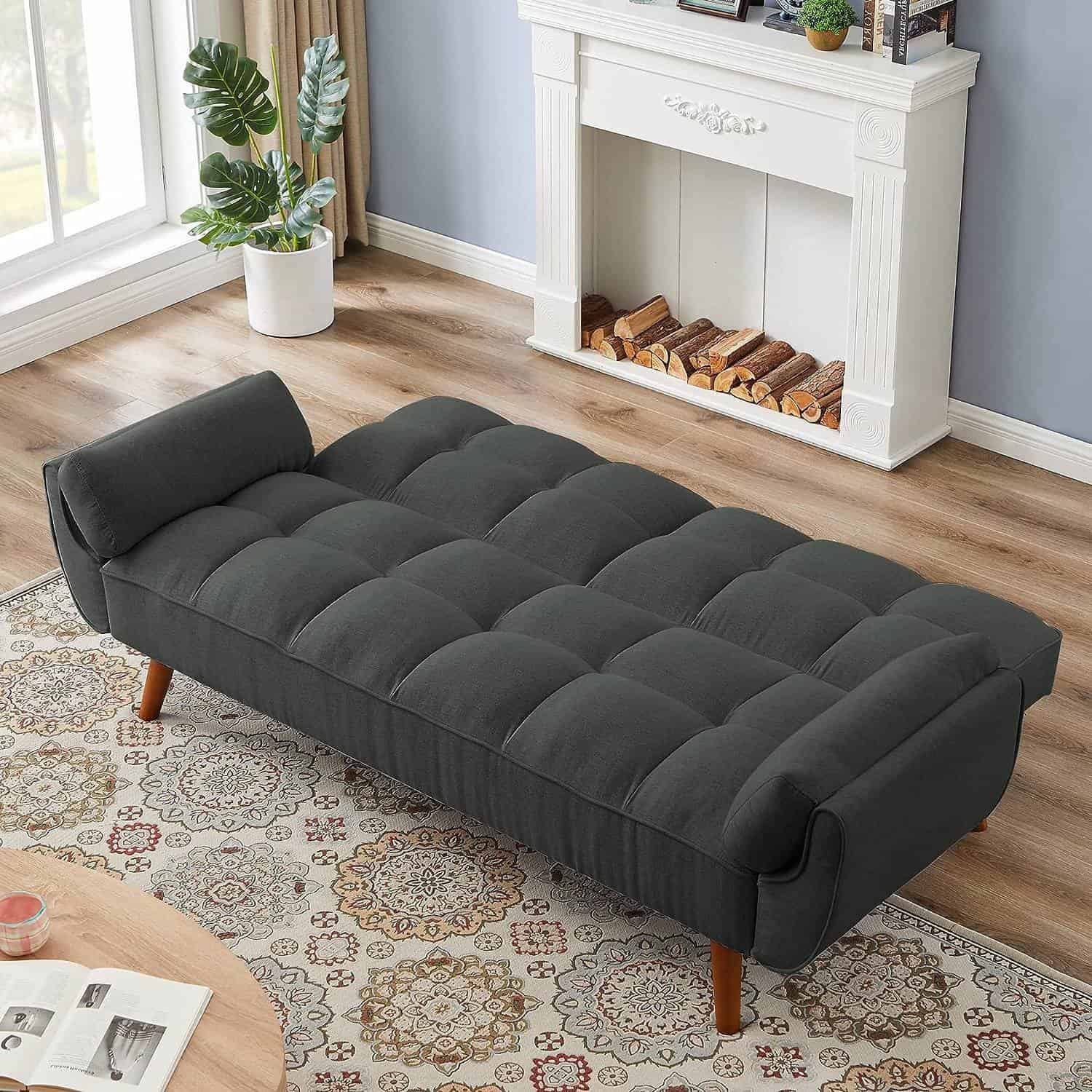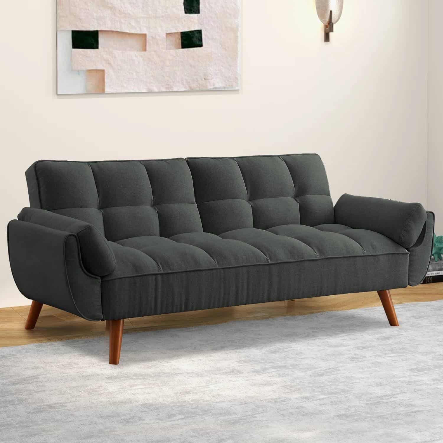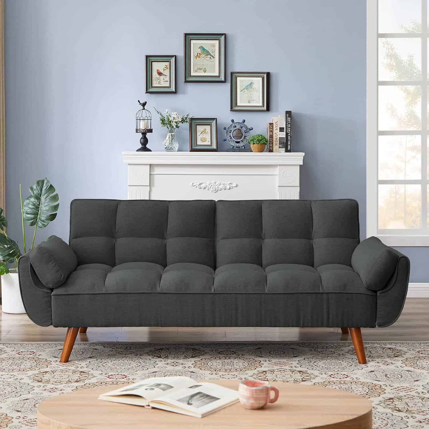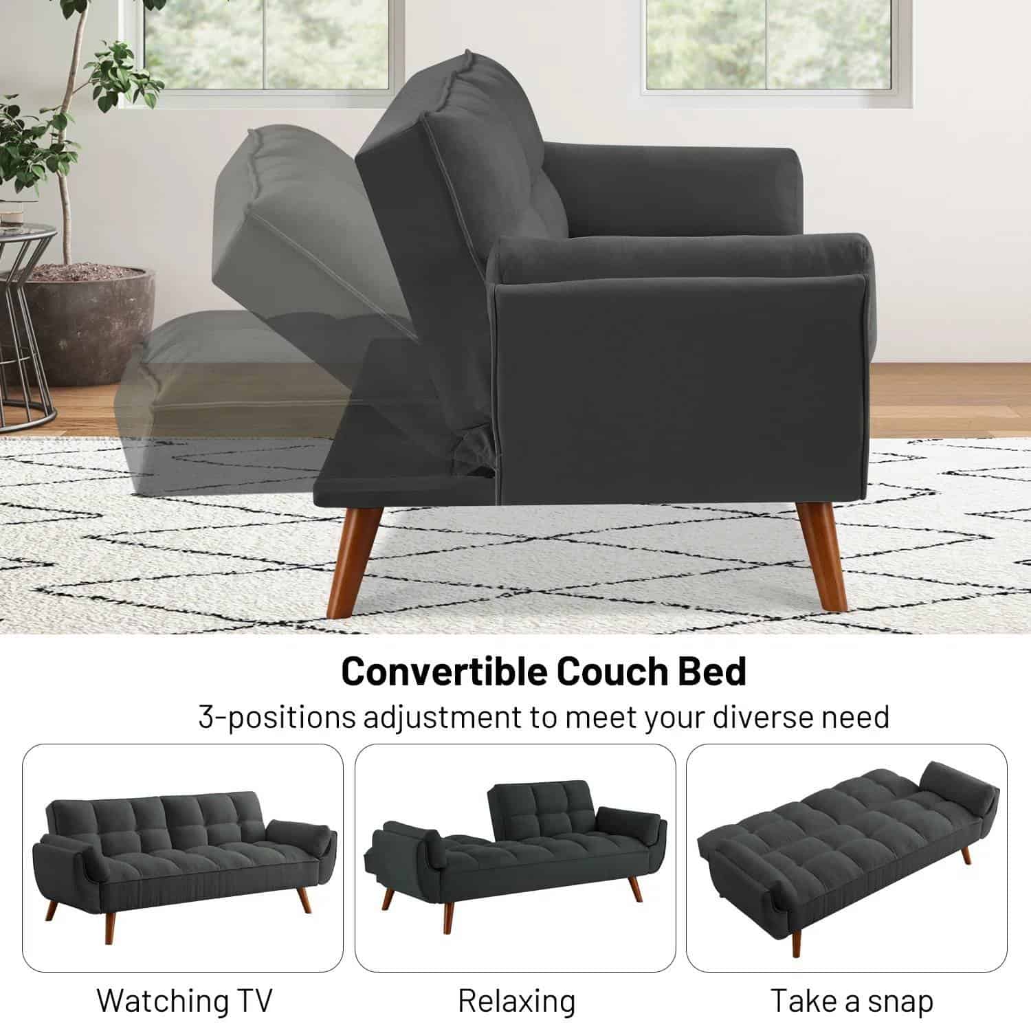 The Mid-Century Modern Dark Grey Linen Convertible Futon Sofa Bed combines style, functionality, and comfort, making it an excellent addition to any living space. Built with a sturdy eucalyptus wood frame and solid wood tapered legs, this futon sofa bed is designed for durability and daily use. Its high-density sponge cushions and sinuous spring design provide exceptional comfort for sitting, lounging, or sleeping. The adjustable split-back design allows for easy conversion into a twin-size sleeper, making it ideal for accommodating guests or maximizing small spaces. Featuring tufted dark grey linen upholstery, this sofa bed adds a touch of mid-century modern elegance to your living room, home office, or guest room. Assembly is quick and straightforward, requiring only 20 minutes to attach the arms and legs.