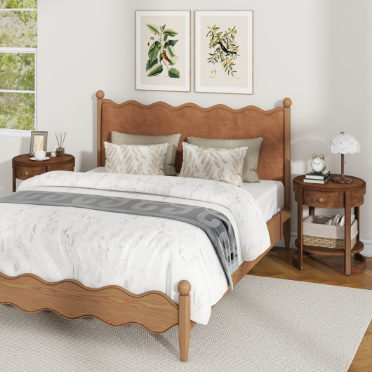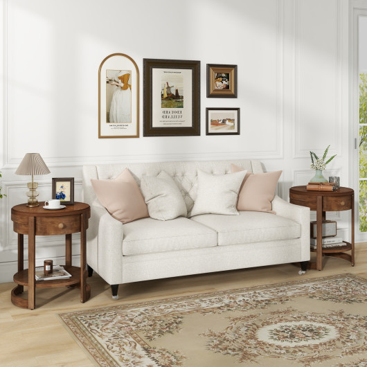 The Mid Century Modern Round Side Table with Drawer and Shelf seamlessly blends vintage charm with modern functionality, making it a stylish and practical addition to any space. Featuring a sleek wood grain finish and a sturdy wooden construction, this end table offers both durability and timeless design. Its versatile storage options, including a drawer and a lower shelf, provide ample space to keep your essentials organized while complementing your decor beautifully.
