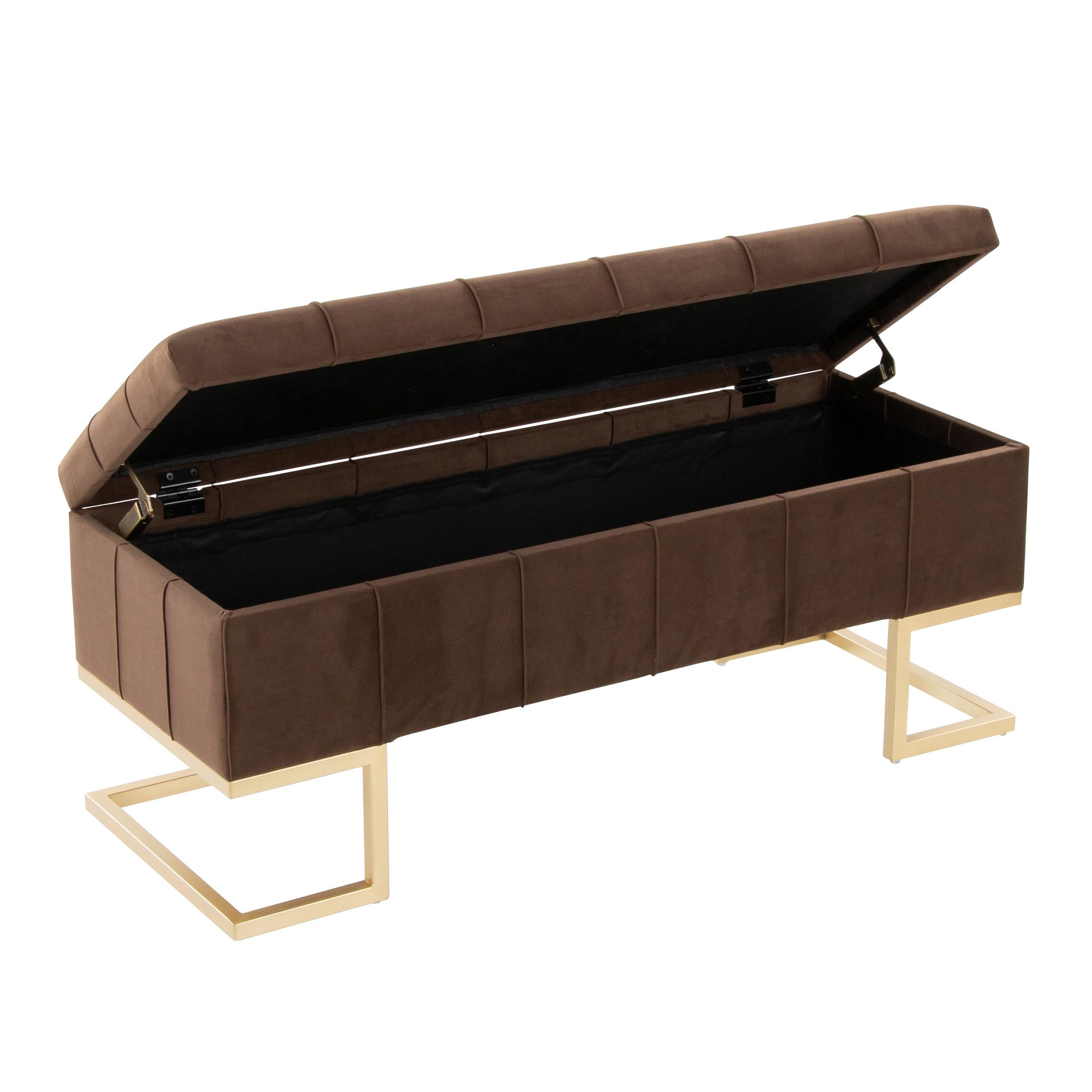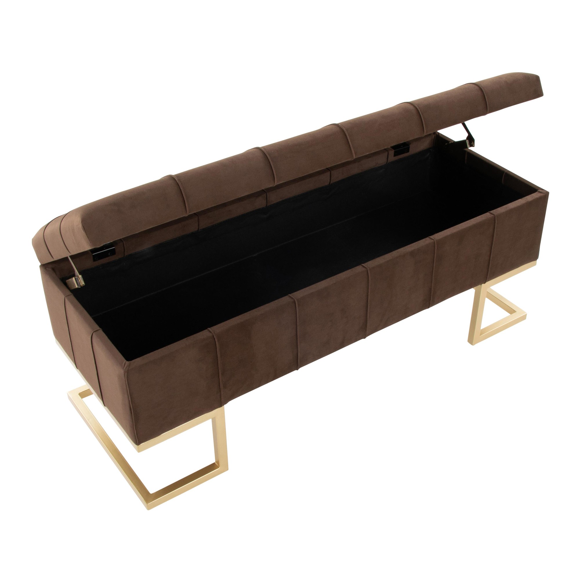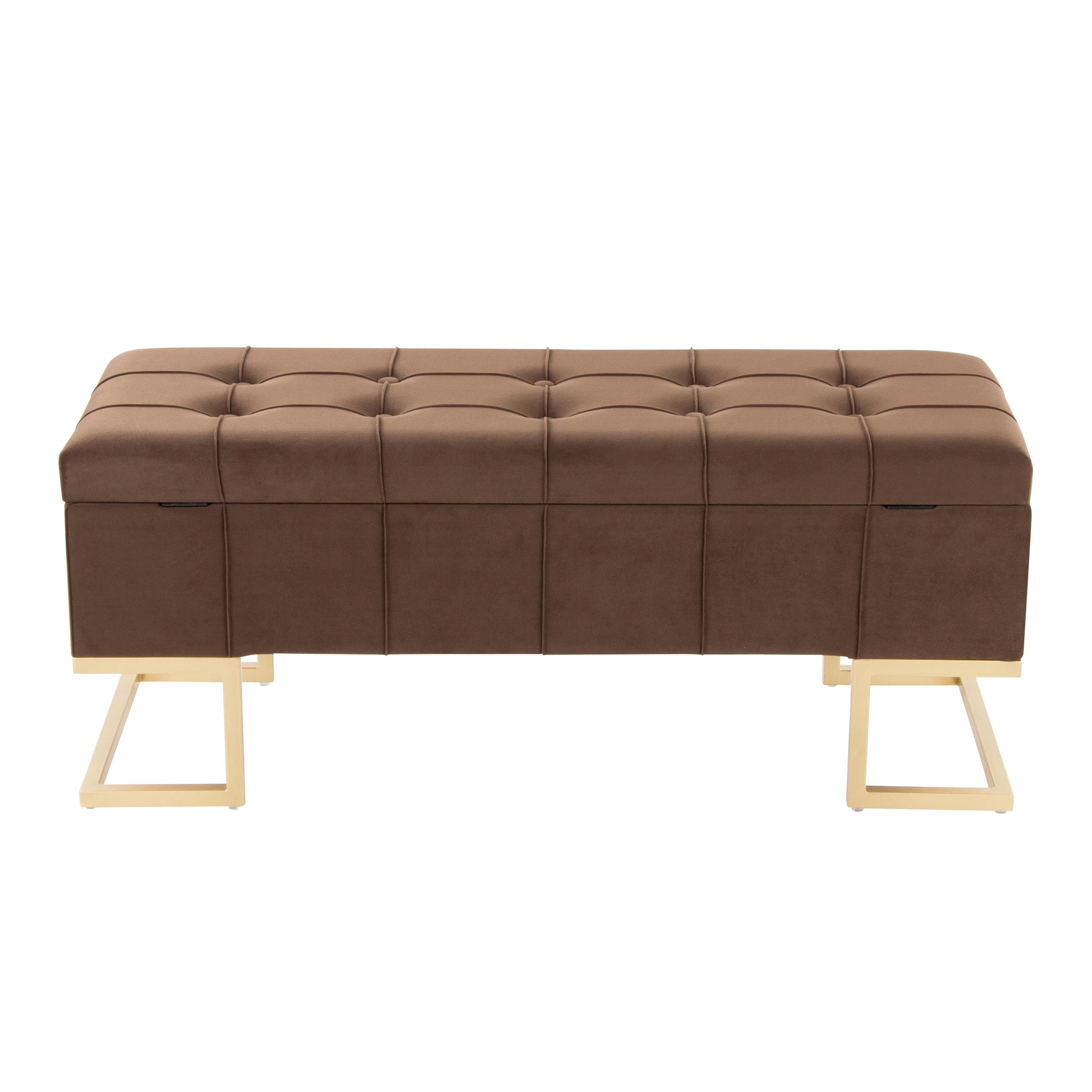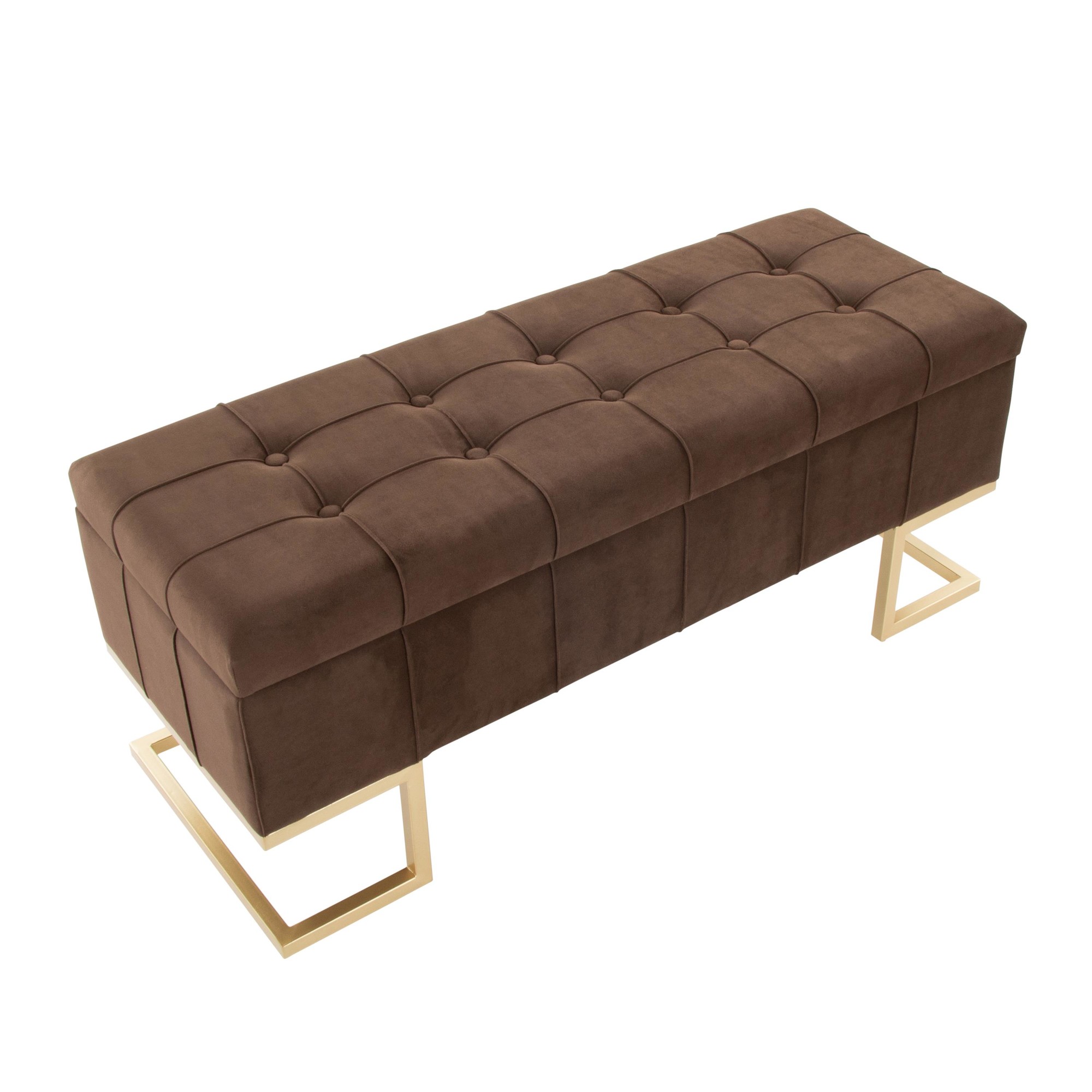 The Midas Storage Bench offers both stylish seating and convenient storage. Perfect as an accent piece in your entryway, living room, or at the foot of your bed, this bench combines a geometric gold metal frame with sleek, button-tufted velvet upholstery. The flip-top lid reveals a spacious storage area to keep your belongings organized and out of sight. It’s the perfect blend of form and function.