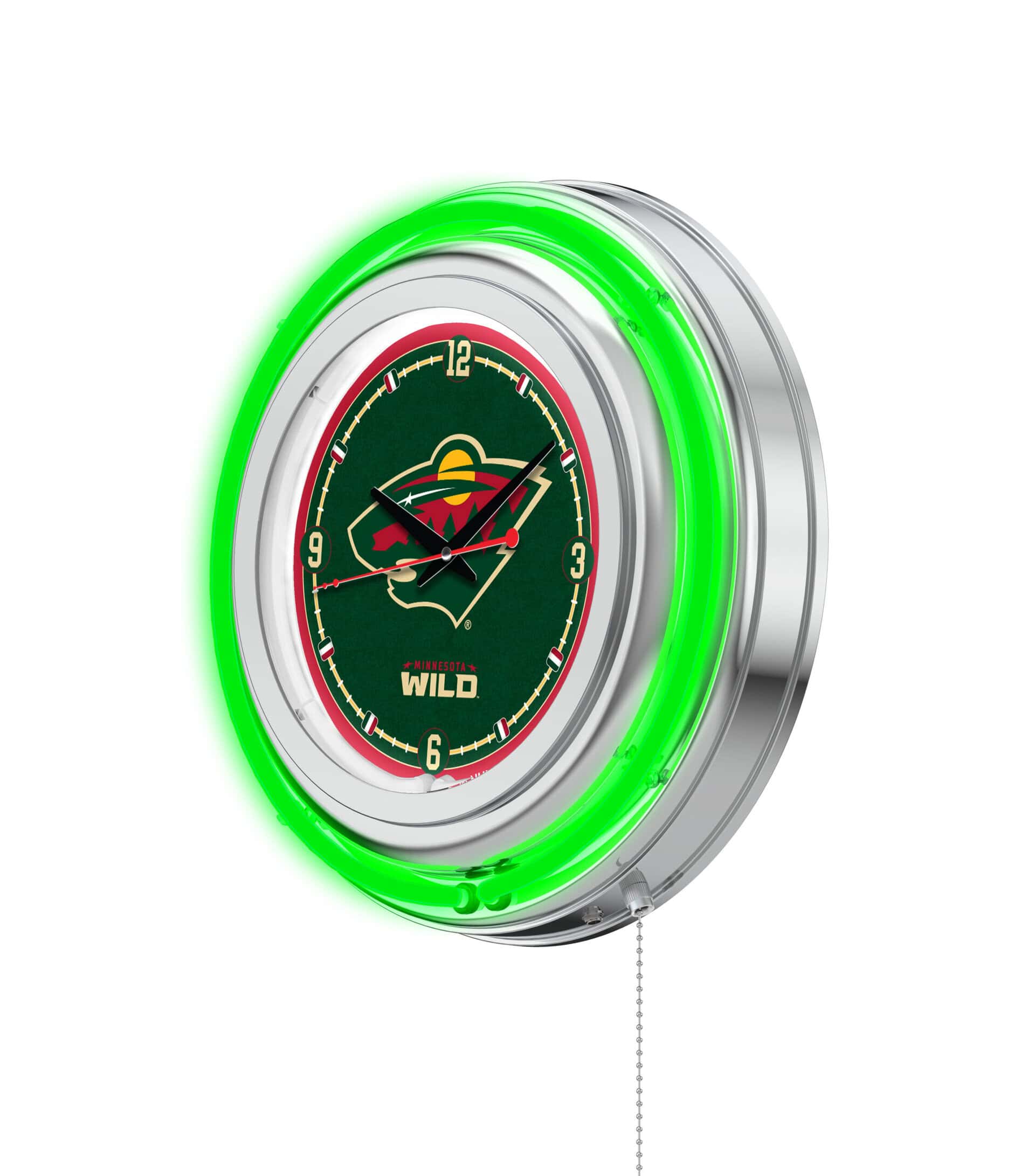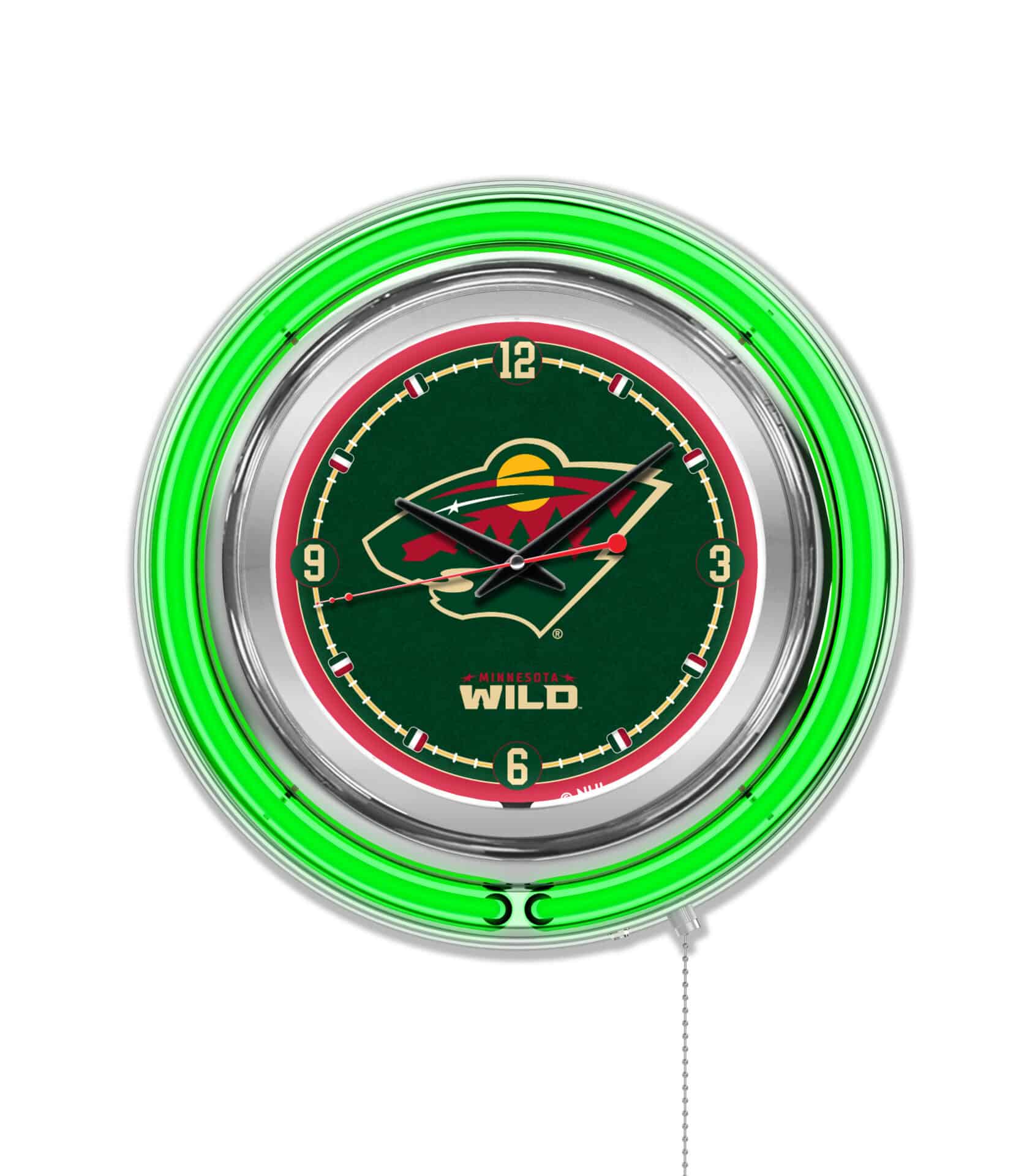 The Minnesota Wild 15-Inch Neon Logo Clock in Chrome is an eye-catching addition to any sports fan’s collection. This clock features a sleek chrome casing and vibrant neon rings that illuminate the custom printed clock face, showcasing your team pride. The brilliant white inner neon ring provides stunning visibility, while the pull chain makes it easy to turn the neon lights on and off. Powered by a UL Listed transformer and designed for accurate timekeeping with quartz movement, this clock is perfect for any man cave or sports-themed room.
