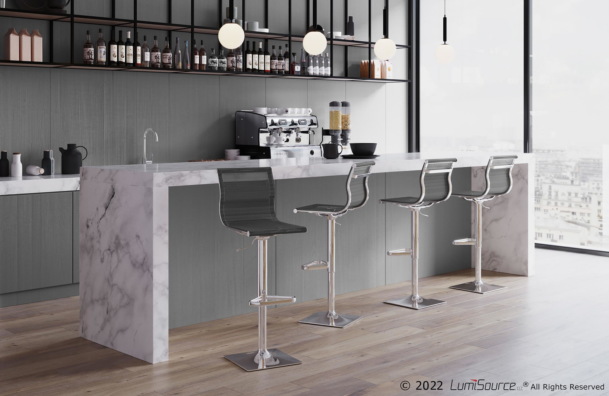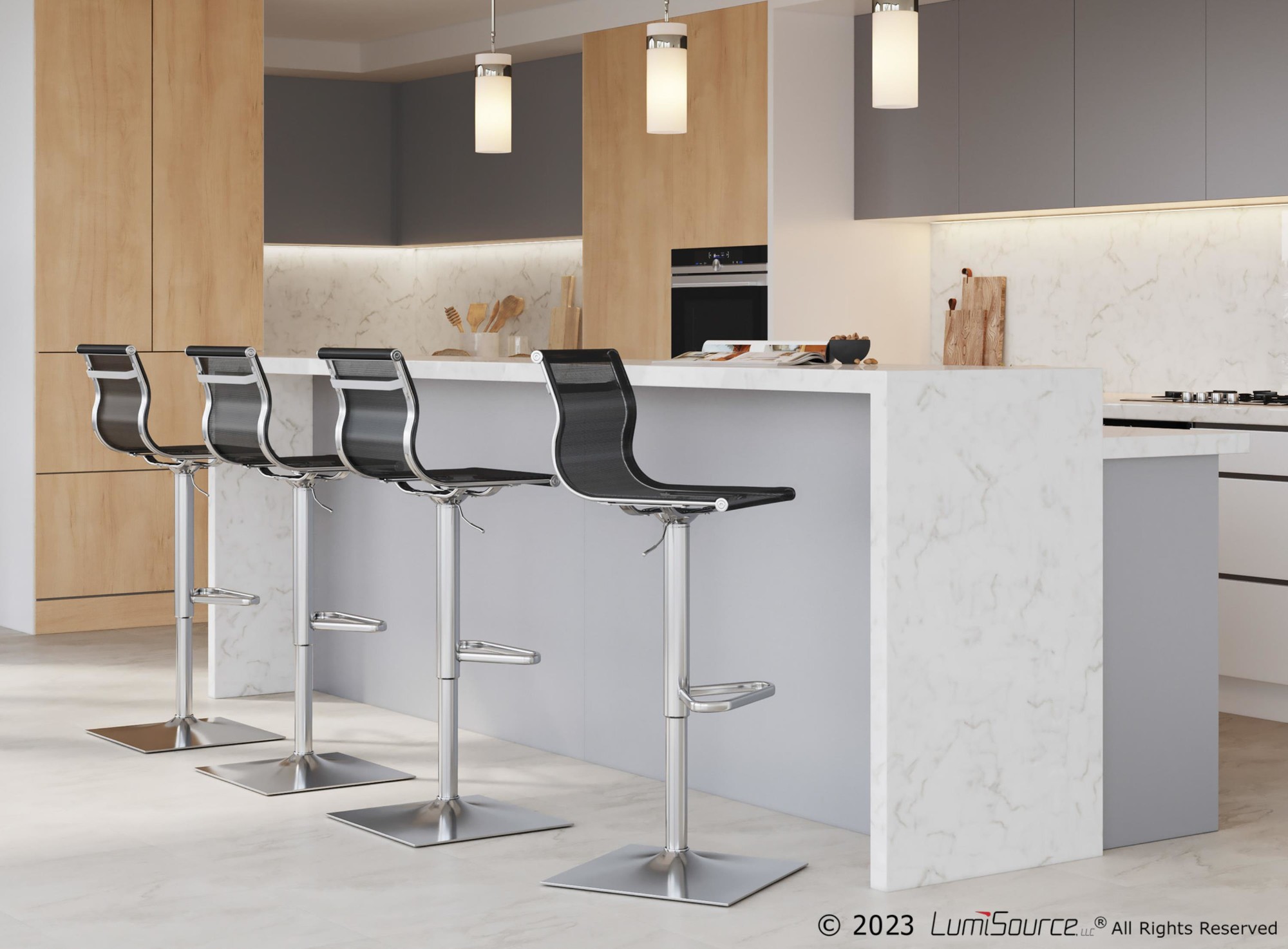 The Mirage Black Mesh Contemporary Adjustable Swivel Barstool is designed to add a touch of modern style to your space. Its sleek design and adjustable features make it a versatile choice for any counter or bar area. Enjoy the comfort of the breathable mesh fabric and the convenience of a 360-degree swivel.