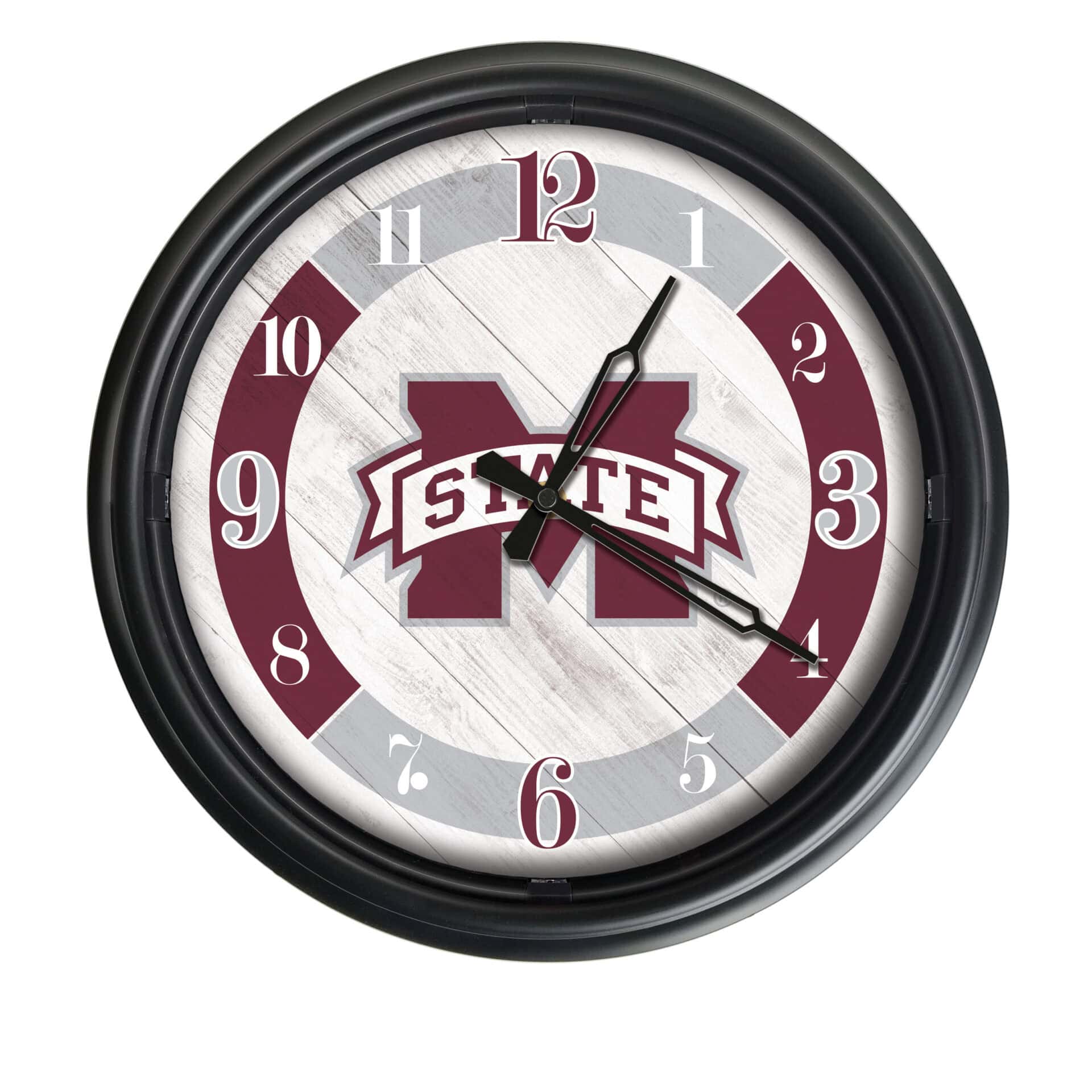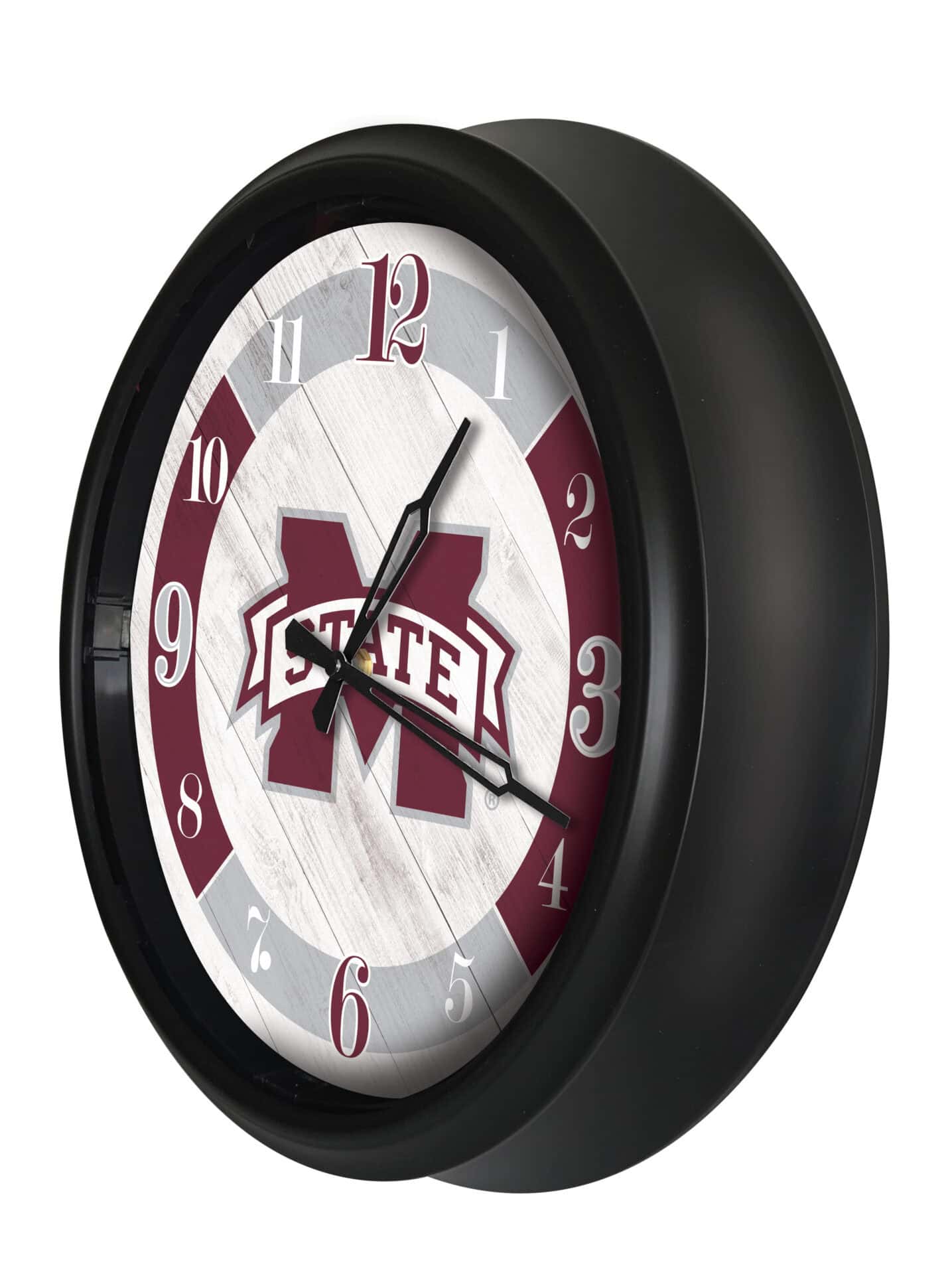 The Mississippi State University 14-Inch Indoor/Outdoor LED Wall Clock in Black is the ultimate way to showcase your school spirit while keeping track of time. Designed for both indoor and outdoor use, this clock features a robust construction that can withstand various weather conditions. The striking UV-resistant black ABS plastic casing and a glass face lens with a rubber gasket ensure durability and protection against the elements. Equipped with photo eye controlled LED lights, the clock automatically illuminates in low light, making it a functional and stylish addition to any man cave or outdoor space.