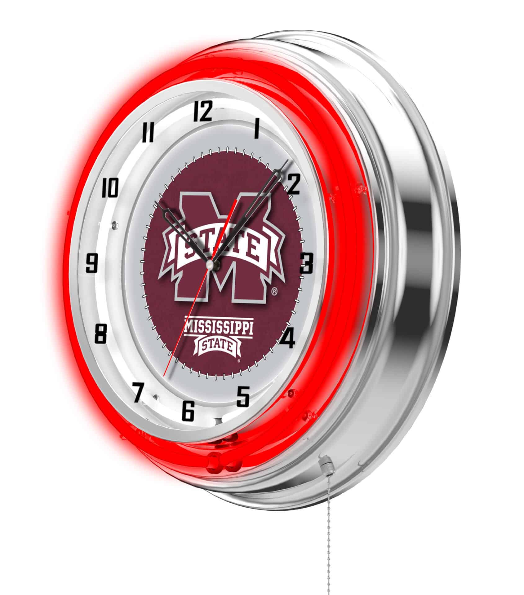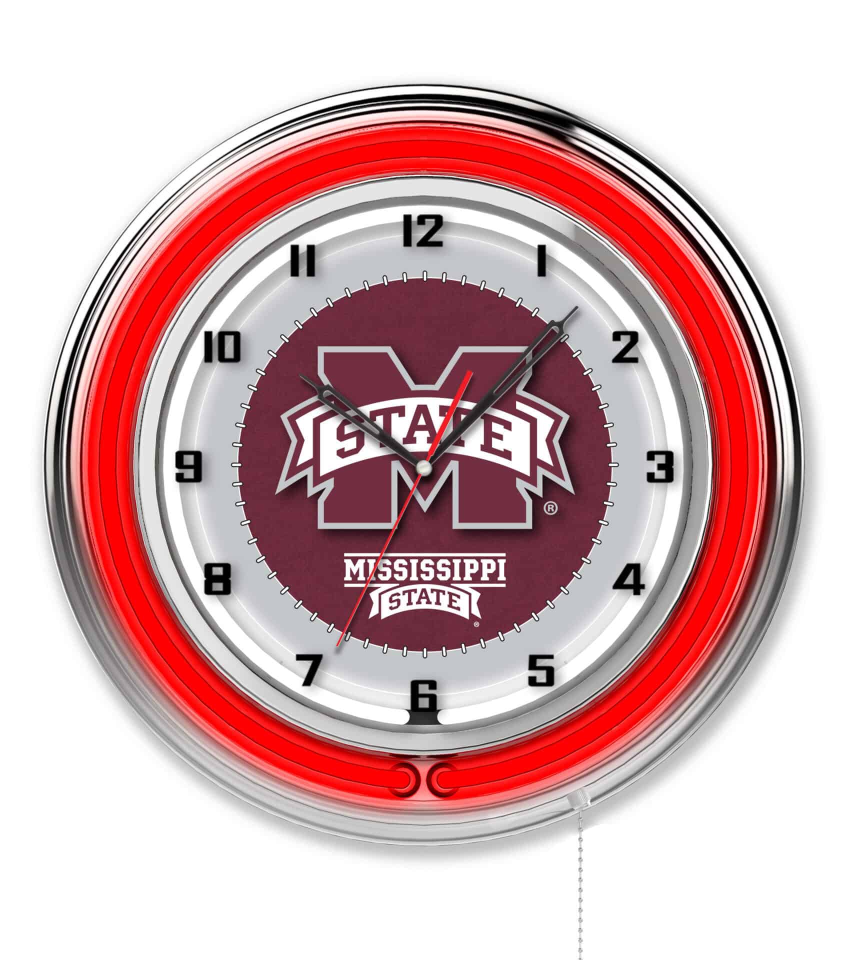 The Mississippi State University 19-Inch Neon Logo Clock in Chrome is the ultimate way to showcase your school pride in any space. This stunning clock features a chrome casing and a vibrant, team color-specific neon outer ring that beautifully highlights the custom-printed clock face, illuminated by a brilliant white inner neon ring. The neon rings can be effortlessly turned on and off with a pull chain located at the bottom of the clock. With accurate quartz movement powered by a single AA battery (not included), you can rely on this clock for precise timekeeping. Perfect as a gift for recent graduates, die-hard sports fans, or as a stylish addition to your own collection, this clock combines functionality with a bold display of school spirit.