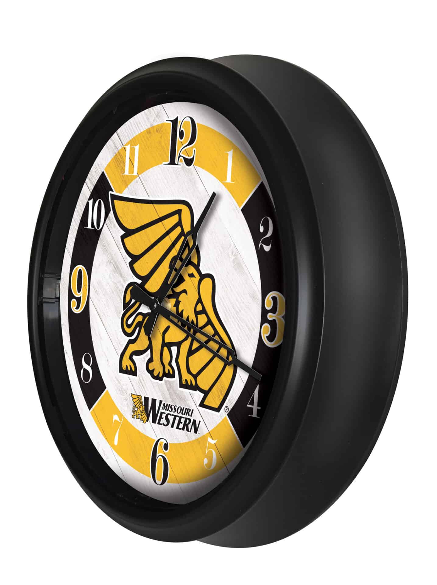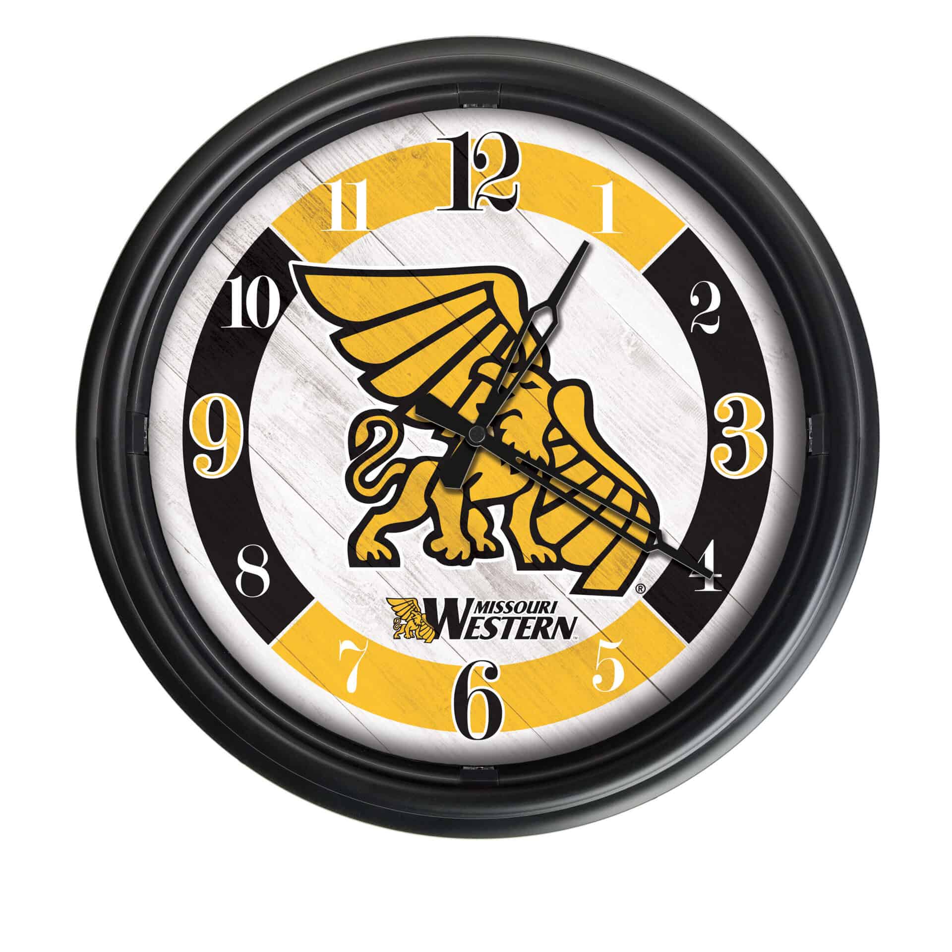 The Missouri Western State University 14-Inch Indoor/Outdoor LED Wall Clock in Black is the perfect addition to any space, showcasing your school pride while providing functionality and style. This clock is designed to withstand outdoor conditions with its weather-resistant construction. The vibrant, full-color artwork is digitally printed using UV inks, ensuring that the colors remain fade-free for years. The clock features a photo eye that automatically illuminates the clock face when it gets dark, powered by long-lasting LED lights. With accurate quartz movement, it keeps the time precisely and requires minimal maintenance.