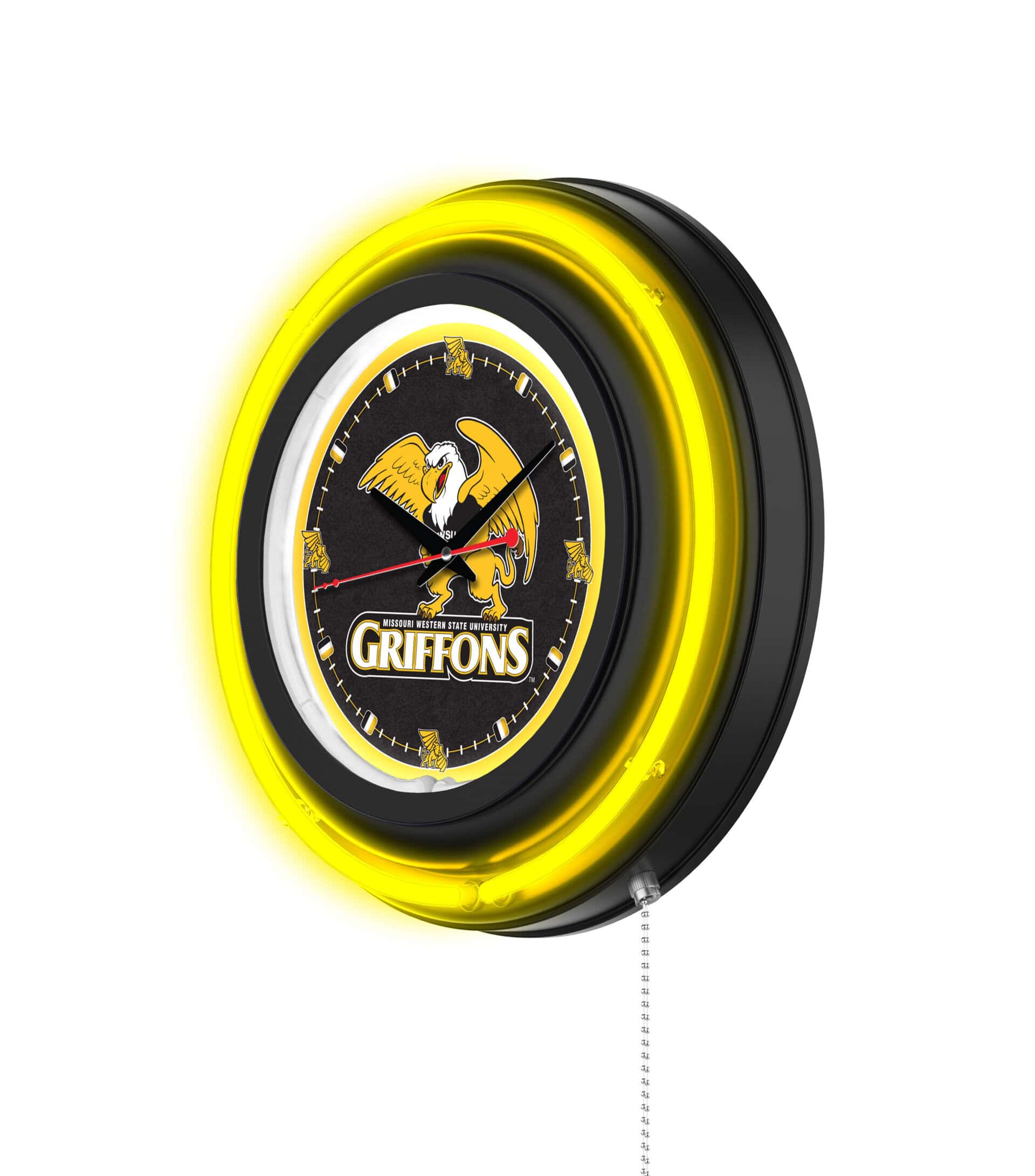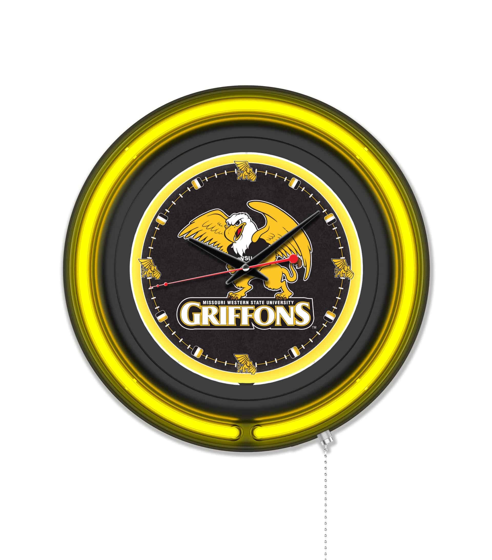 The Missouri Western State University 15-Inch Neon Logo Clock in Black is a striking addition to any man cave or fan space, combining functionality with school spirit. Featuring a stunning black casing and a neon outer ring in team colors, this clock is not only a timepiece but a vibrant display of pride. The custom printed clock face is illuminated by a brilliant white inner neon ring, ensuring visibility and style. With easy operation via a pull chain and powered by a standard 120V outlet, this clock is as practical as it is eye-catching. Its accurate quartz movement guarantees precise timekeeping, making it a perfect gift for graduates, sports enthusiasts, or personal use.