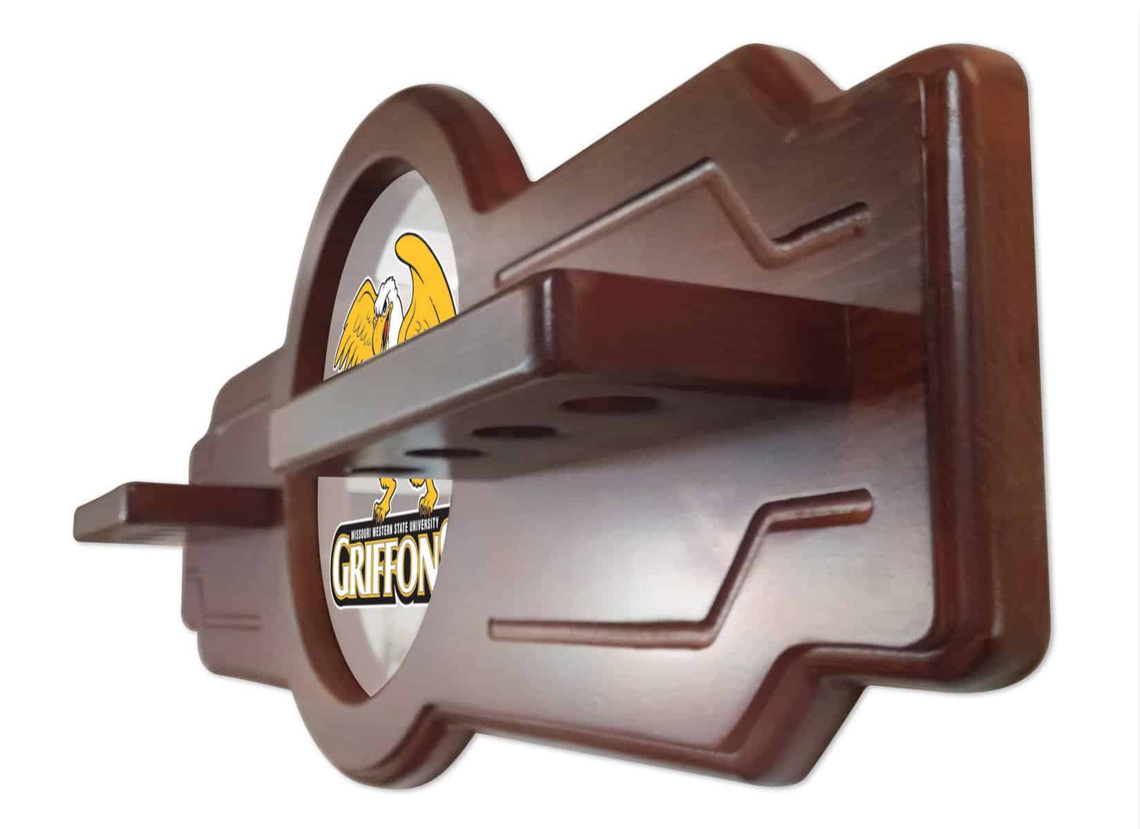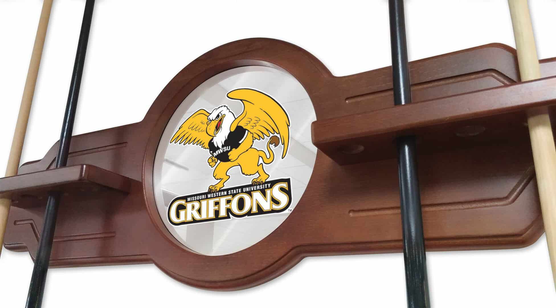 Elevate your game room with this premium Missouri Western State University Black Logo Cue Rack. Designed for pool enthusiasts and university sports fans, this exceptional cue rack offers both functionality and style. Crafted with meticulous attention to detail, this high-quality wooden rack provides a sophisticated solution for storing and displaying pool cues while showcasing your team spirit.