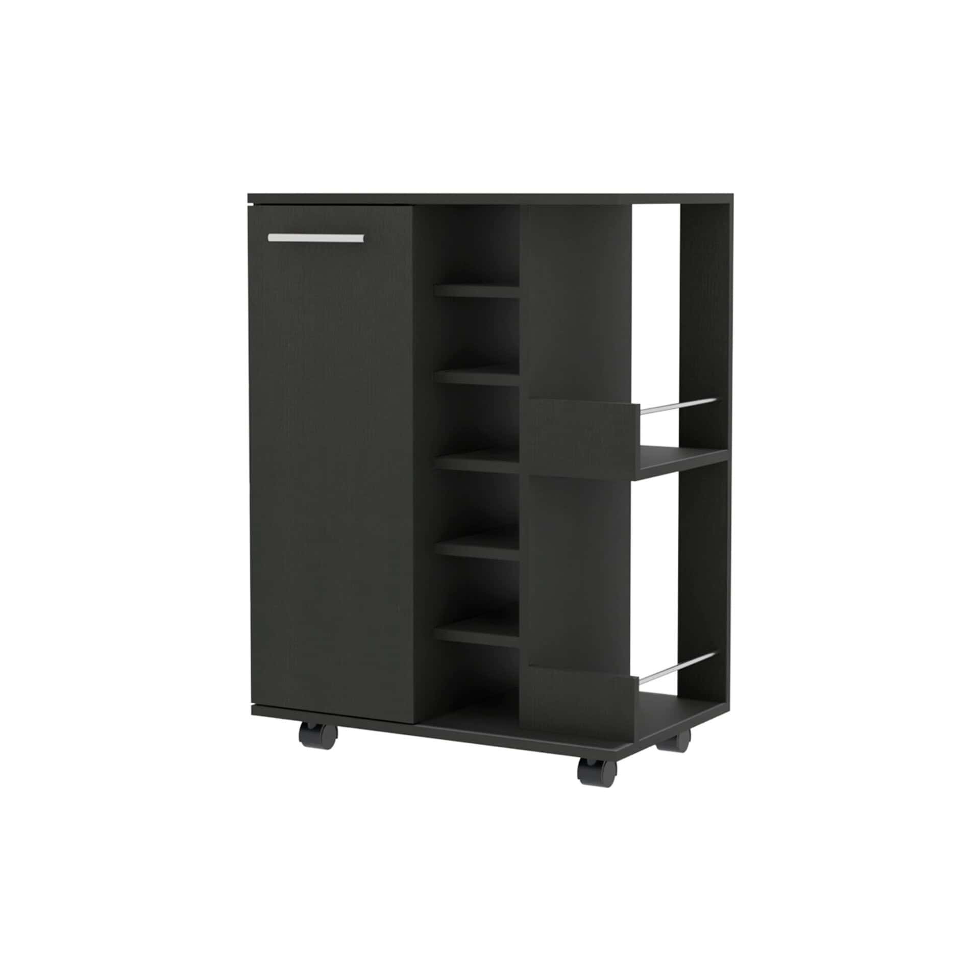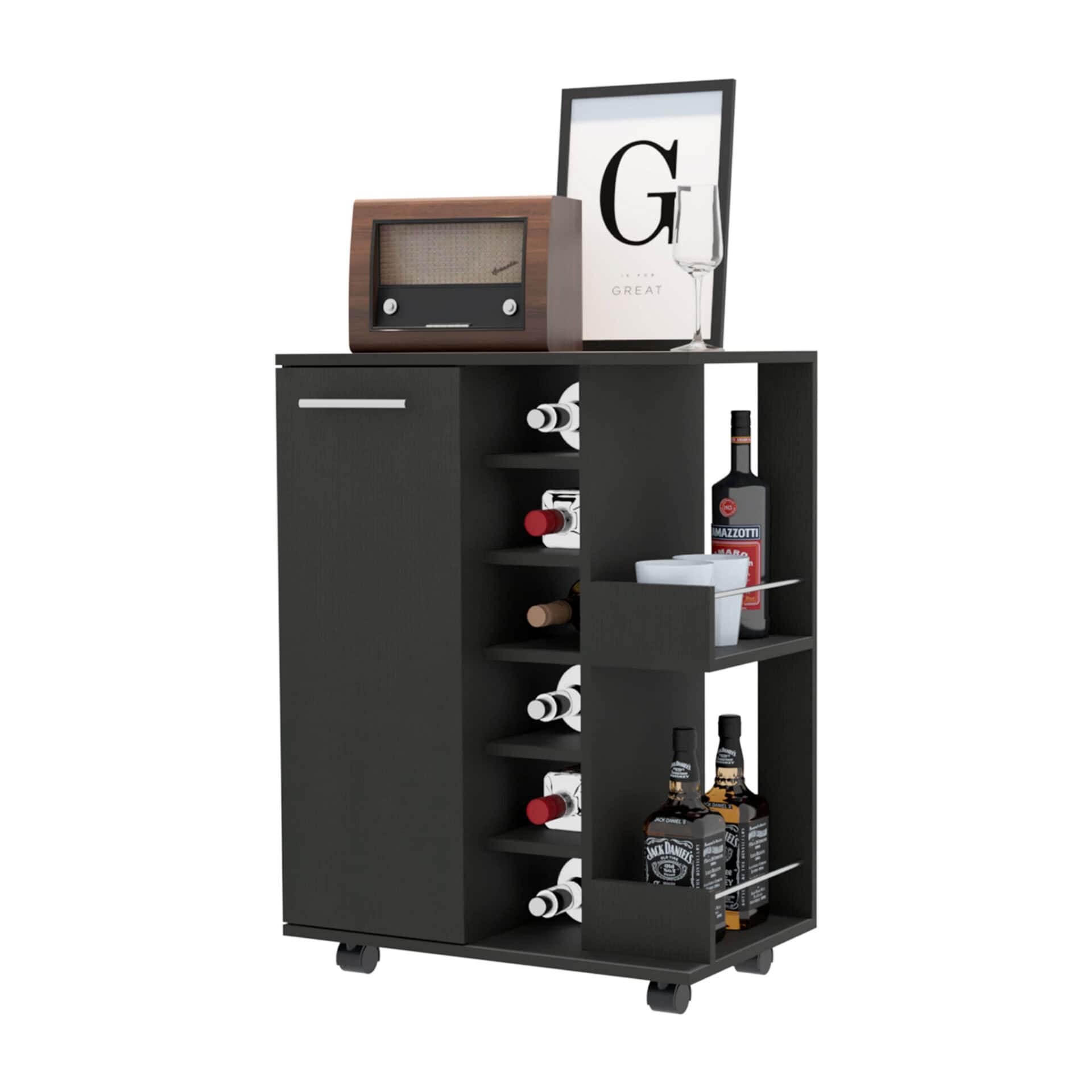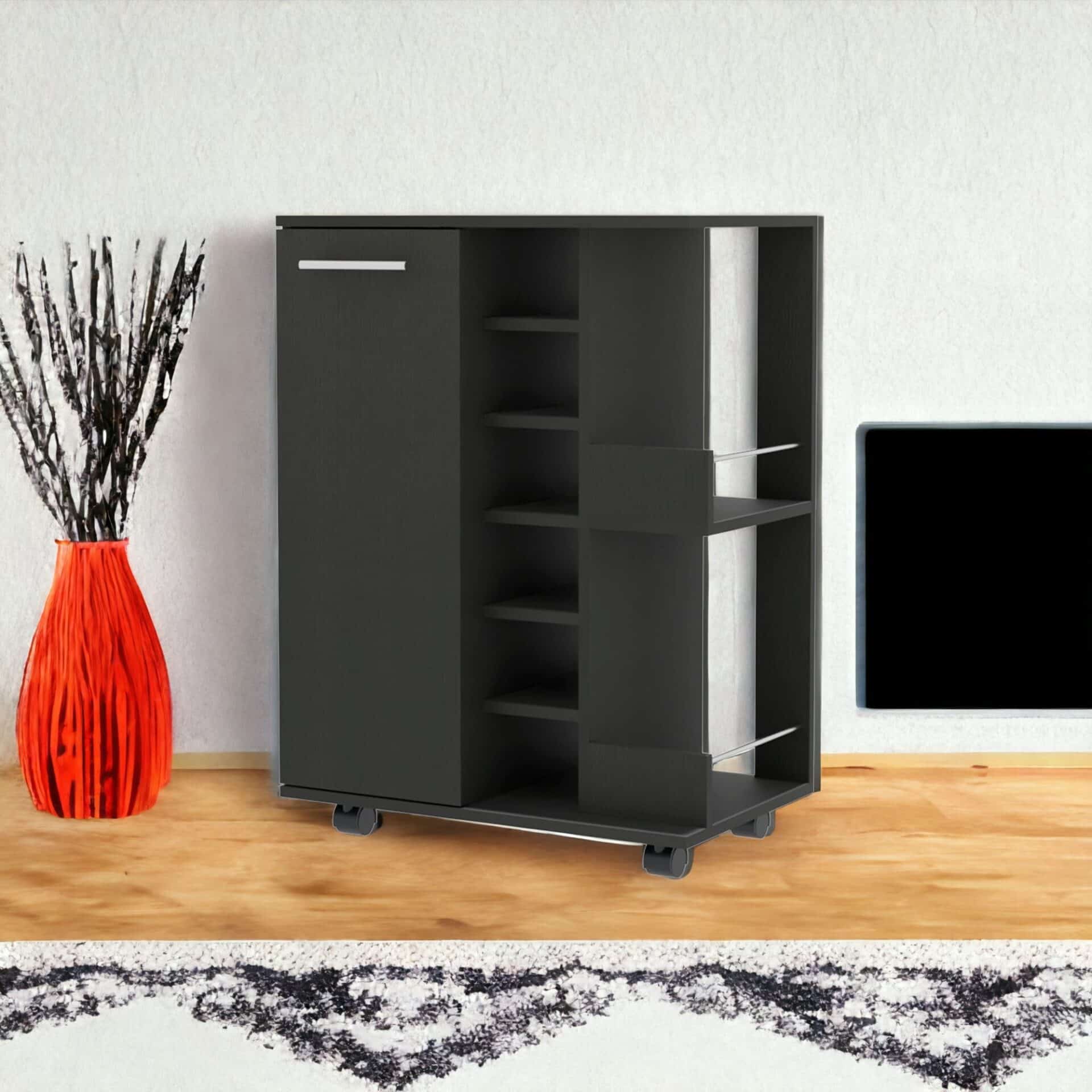Add a touch of modern elegance to your home with this black rolling bar cart with wine storage. Crafted with a sleek black manufactured wood frame, this rectangular bar cart features ample storage space for your favorite wines, with cabinets that can hold up to 6 bottles. The top of the cart is also made from manufactured wood, providing a sturdy surface for serving drinks or displaying decorative items. Equipped with wheels, this bar cart can be easily rolled around your space, adding a versatile and functional piece to any room. Its modern style and black color make it a perfect addition to any home decor. Don’t miss out on this stylish and practical bar cart for your entertaining needs.