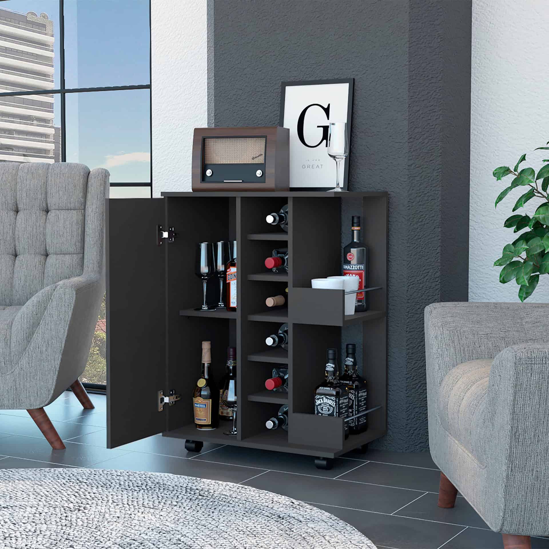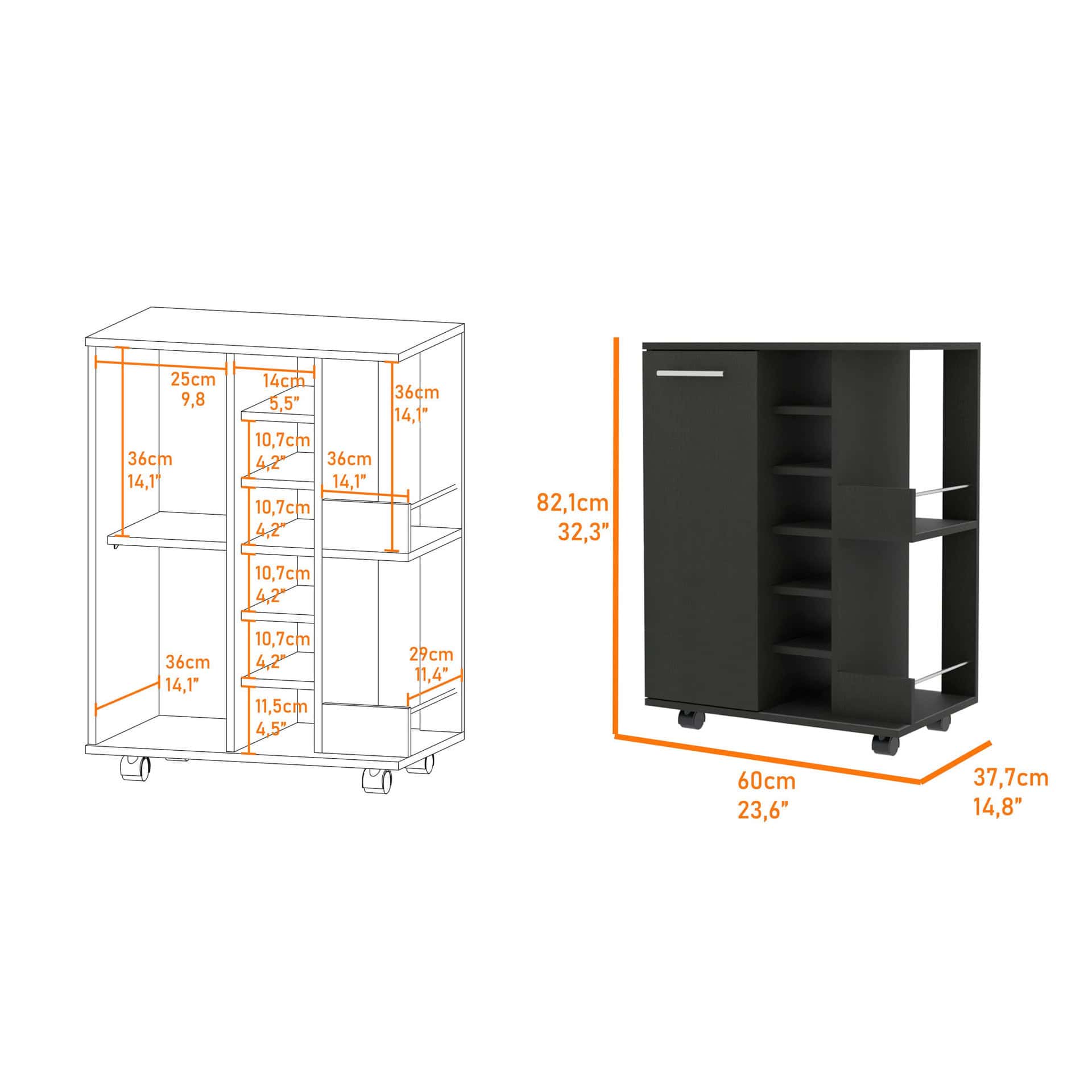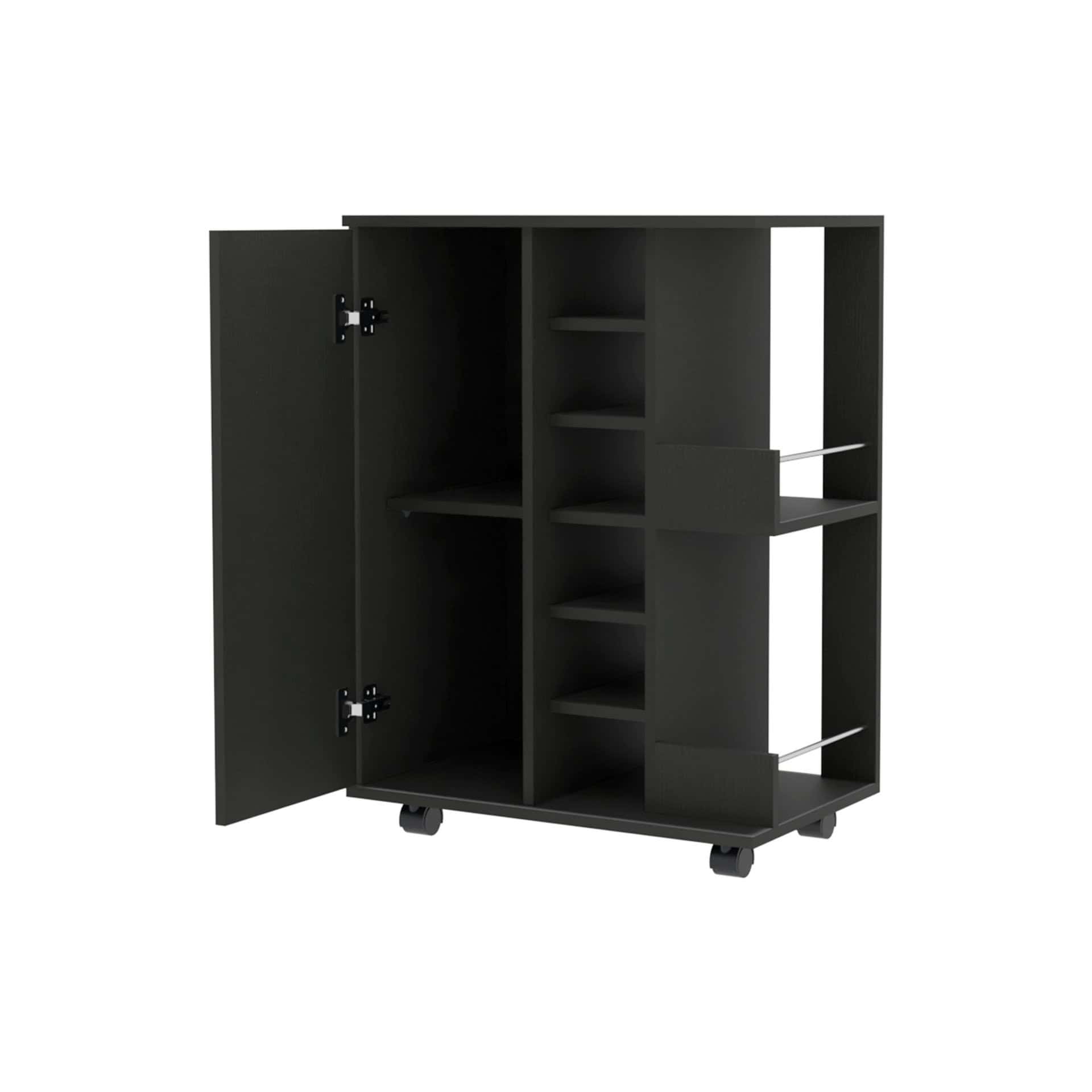 Add a touch of modern elegance to your home with this black rolling bar cart with wine storage. Crafted with a sleek black manufactured wood frame, this rectangular bar cart features ample storage space for your favorite wines, with cabinets that can hold up to 6 bottles. The top of the cart is also made from manufactured wood, providing a sturdy surface for serving drinks or displaying decorative items. Equipped with wheels, this bar cart can be easily rolled around your space, adding a versatile and functional piece to any room. Its modern style and black color make it a perfect addition to any home decor. Don’t miss out on this stylish and practical bar cart for your entertaining needs.